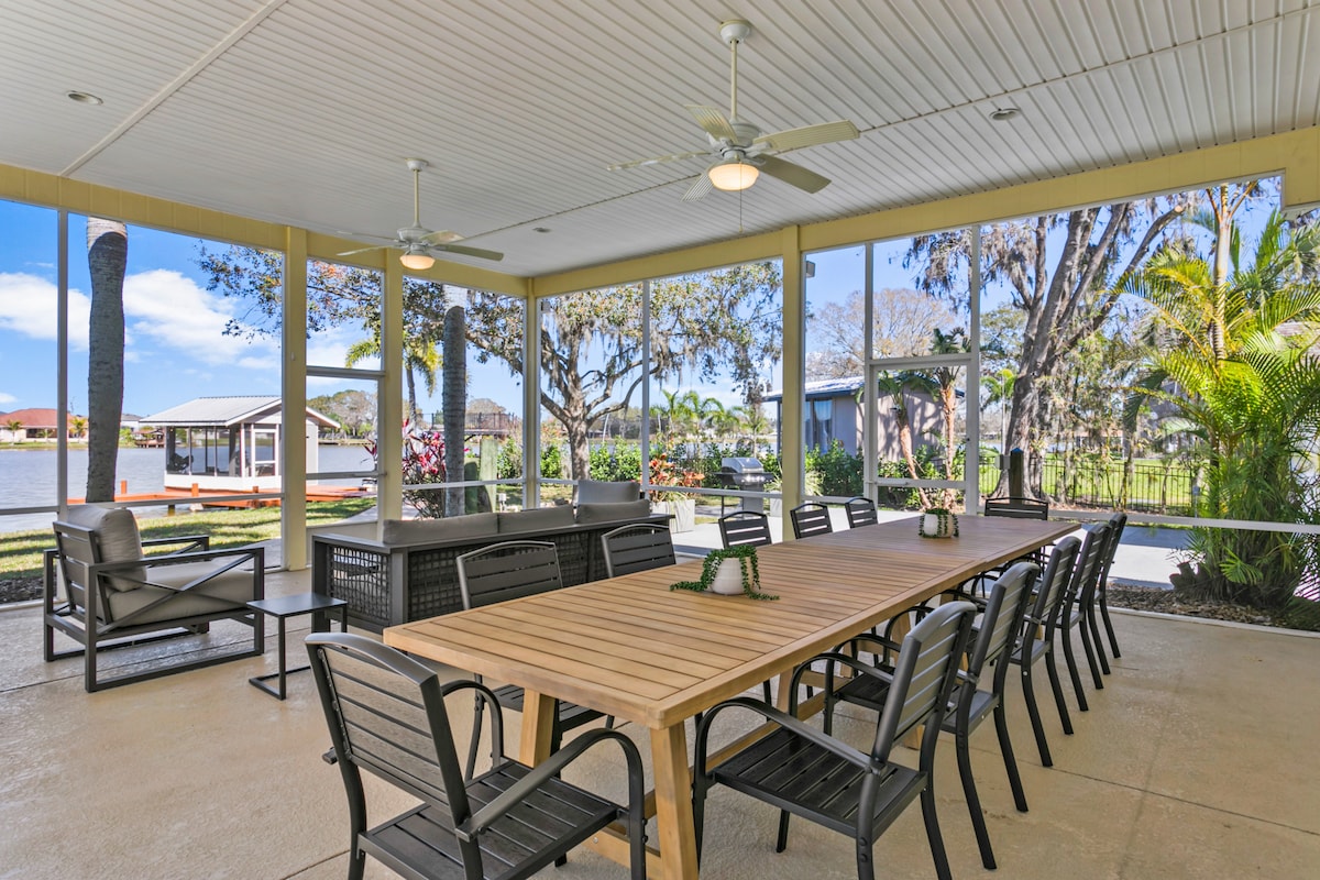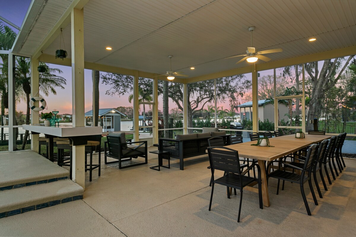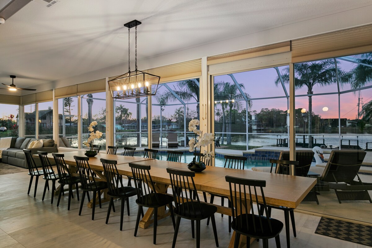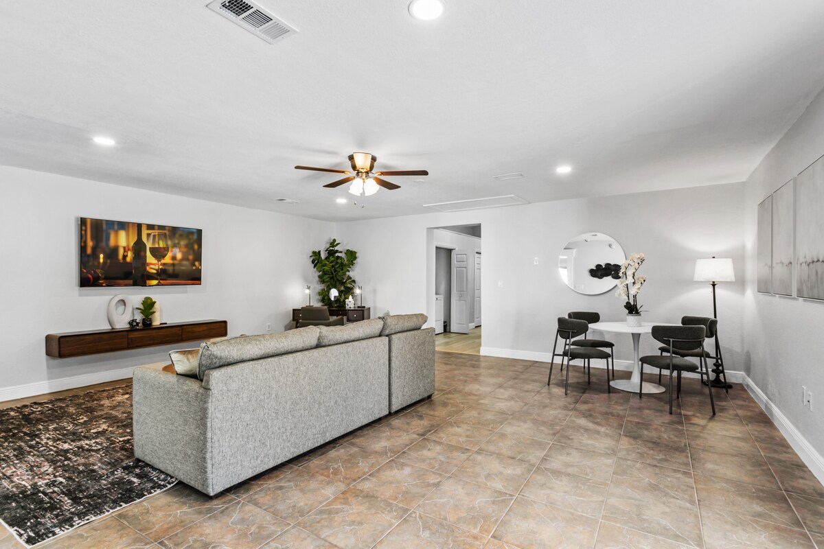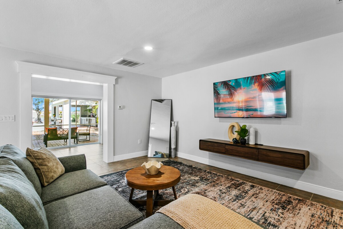 From the moment you step inside, you’ll be greeted by a beautifully designed interior featuring stylish furnishings, open-concept living areas, and plenty of space for everyone to unwind. The main living room boasts plush seating, a large flat-screen TV, and ample natural light, making it a cozy spot to relax after a day of exploring Tampa.