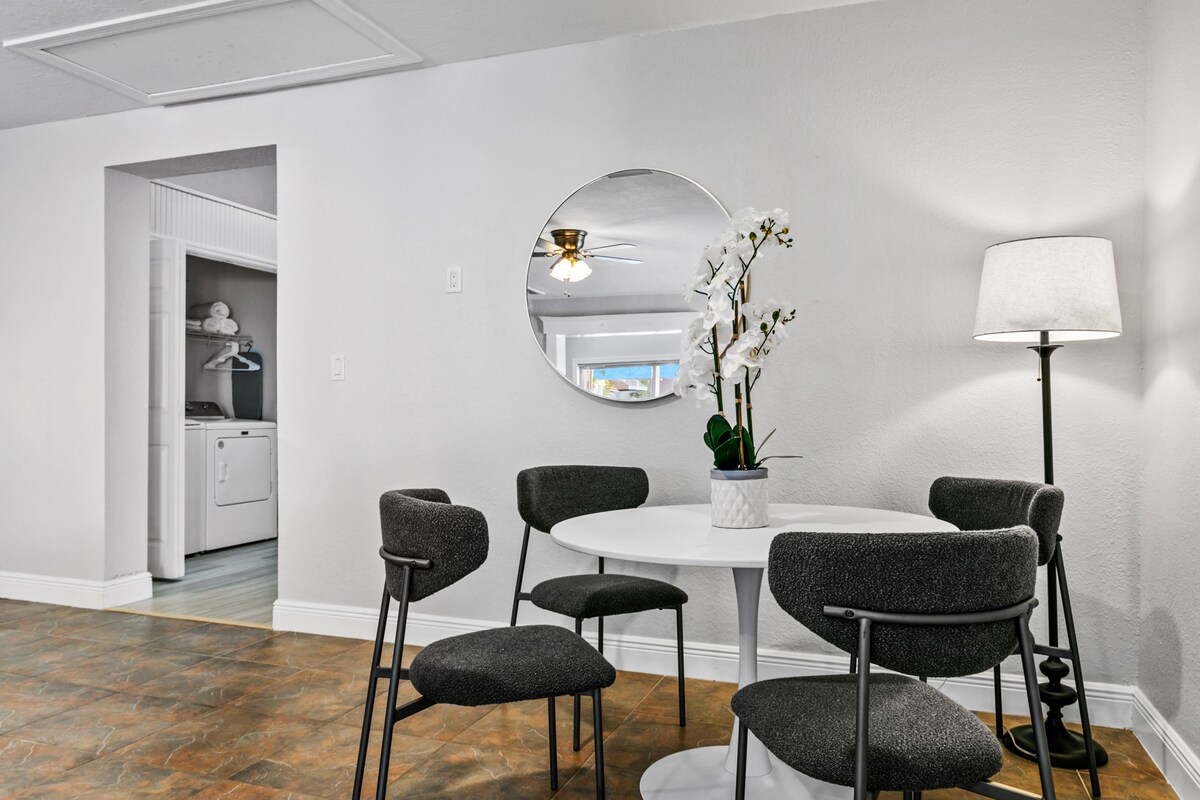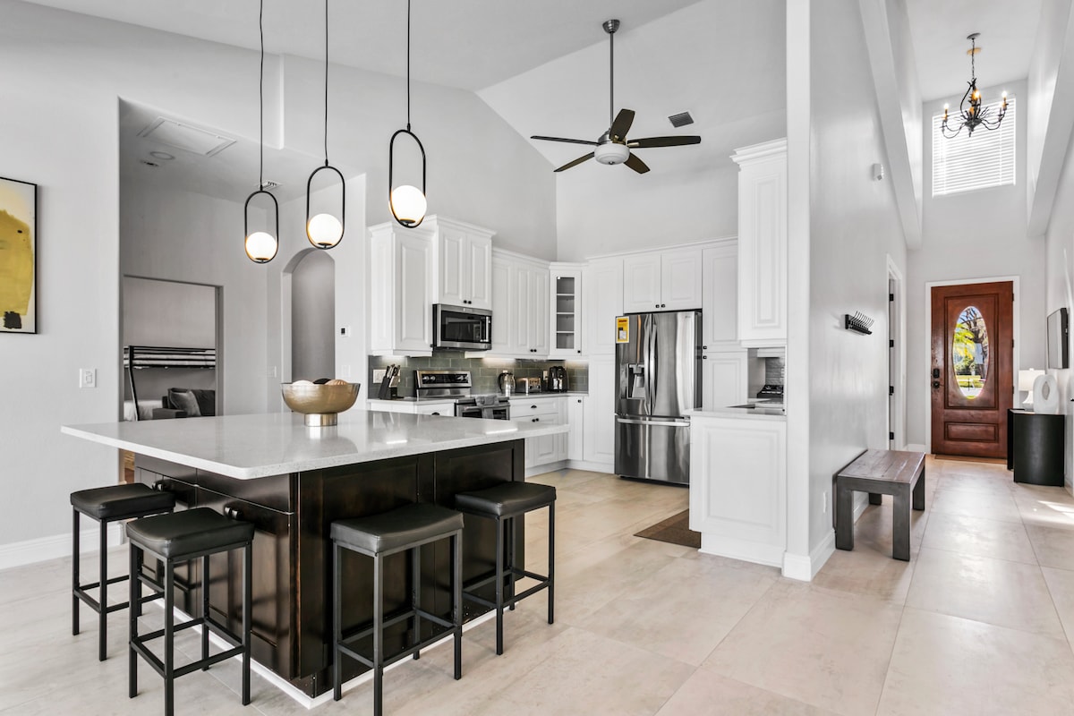 The home features a modern, fully equipped kitchen with stainless steel appliances, granite countertops, and all the essentials you need to prepare meals for your group. Whether you’re whipping up a quick breakfast or hosting a family dinner, you’ll have everything you need. The spacious dining area provides seating for everyone, ensuring you can enjoy meals together in comfort.