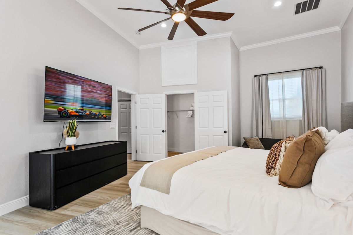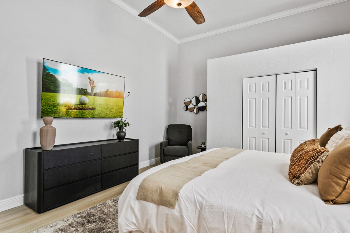 Bedroom 1 - QUEEN-SIZED BED, TV, Dresser, Hangers, Full closet