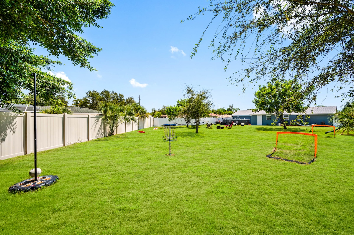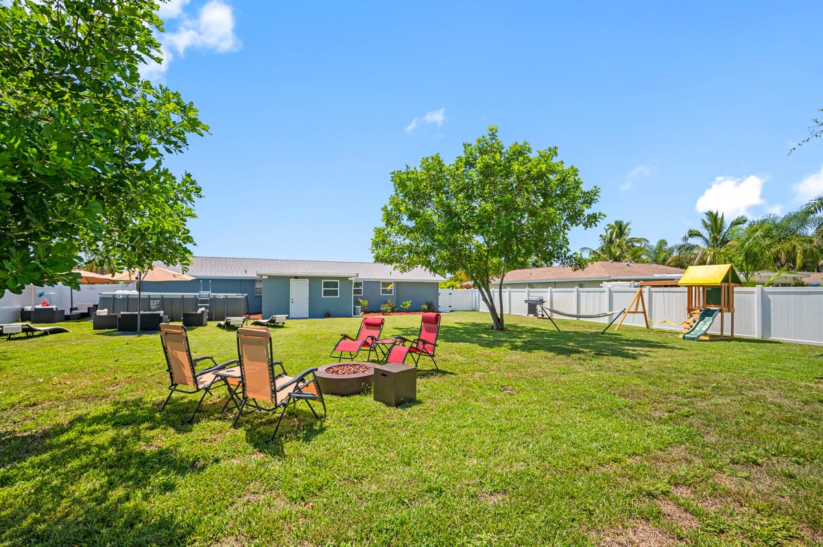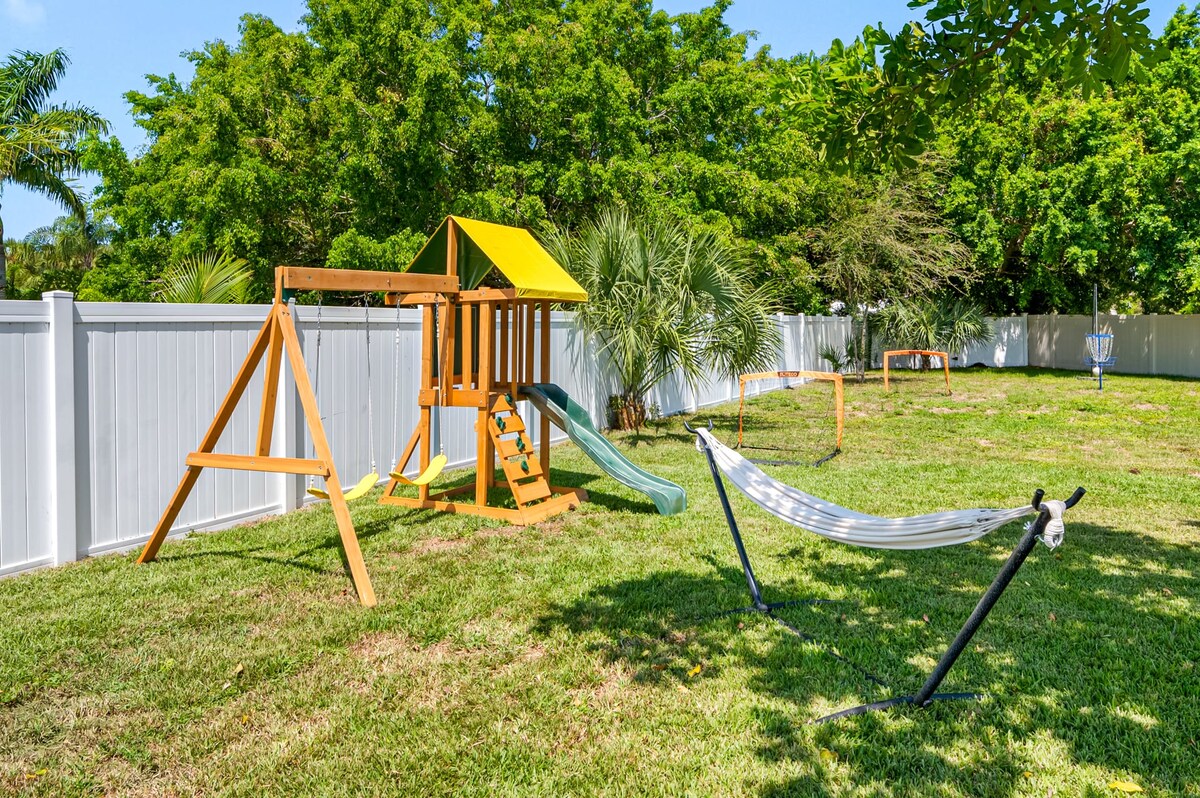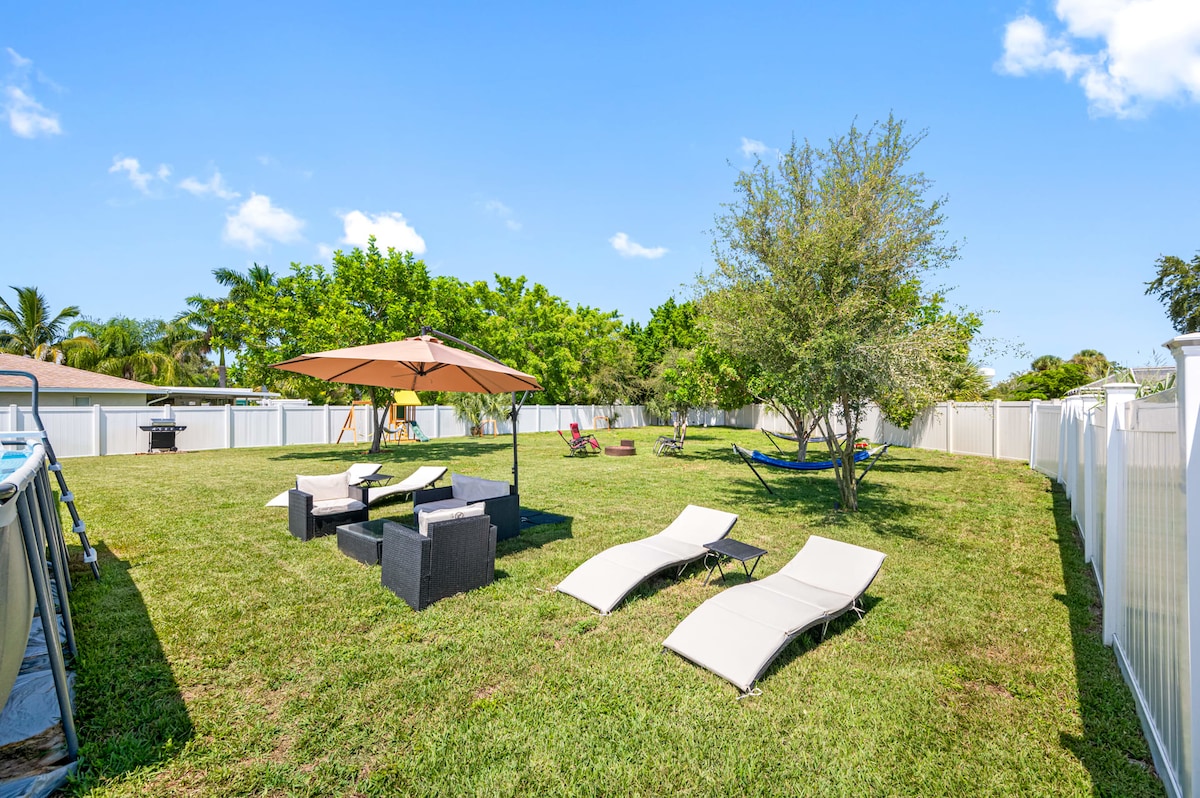 Outdoor - Above ground 18 feet by 9 feet by 52” deep pool. Fire pit with 4 chairs, barbecue grill , football and football net, soccer ball, net, frisbee chain basket, tetherball, cornhole boards, 3 hammocks, 2 sitting areas with tables and umbrellas, swing set for kids.