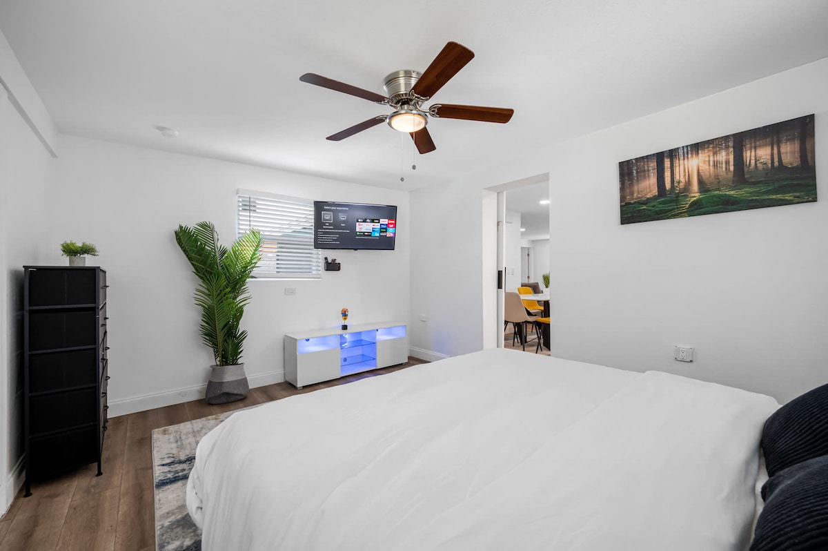 Bedroom 3 - Master bedroom QUEEN SIZE BED, 2 night stands with a 42” TV with shelfs underneath tv, a sitting bench a mirror with a closet and a bathroom is a standup shower.