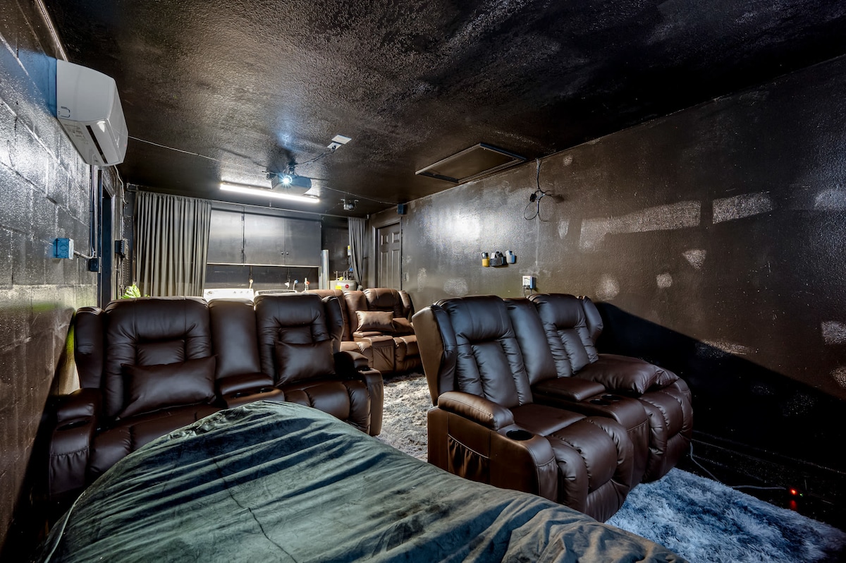 Theatre - 3 reclining loveseat and one bean bag. Projector and a 100” by 58” screen.