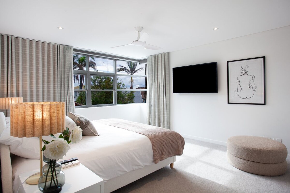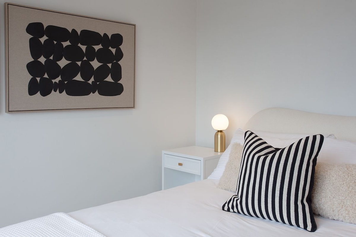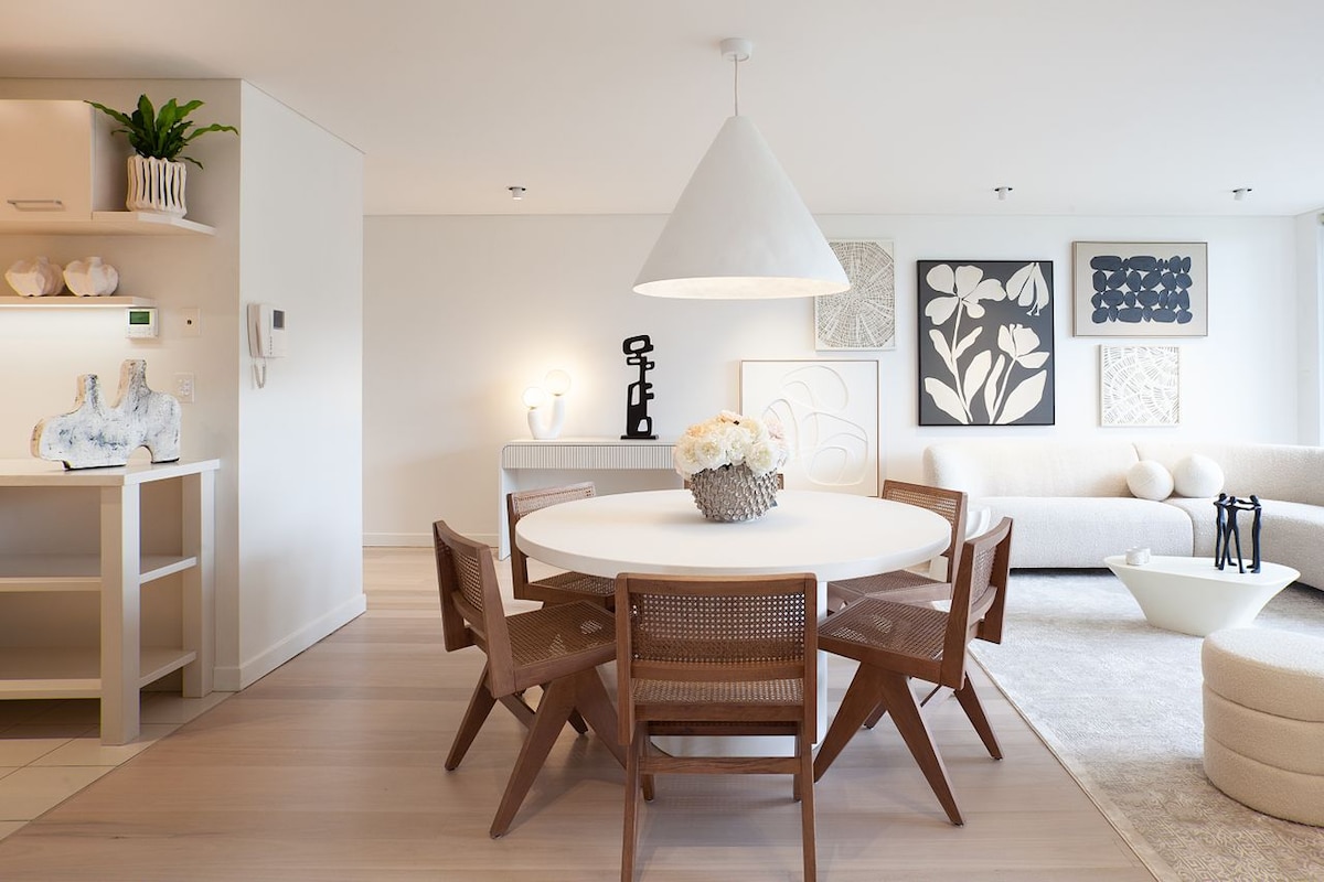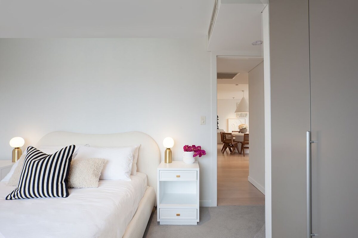 Entering this house-sized apartment you’re struck by the high-end and streamlined interior, capturing the essence of its laid back coastal setting. The spacious living and dining area is the heart of this home, where a curvaceous sofa is bathed in sunlight which streams in from the bright North-westerly aspect. Soft organic neutral interiors create a sense of calm throughout the main space, only enhanced by the large windows opening onto the balcony. Recline with a cocktail and watch the sunset from your serene, modern outdoor seating area, taking in the sweeping views. A full kitchen gives you ample space to prep across the U-shaped counters and offers all of the convenience you would need for an extended stay.