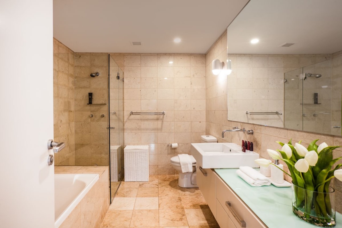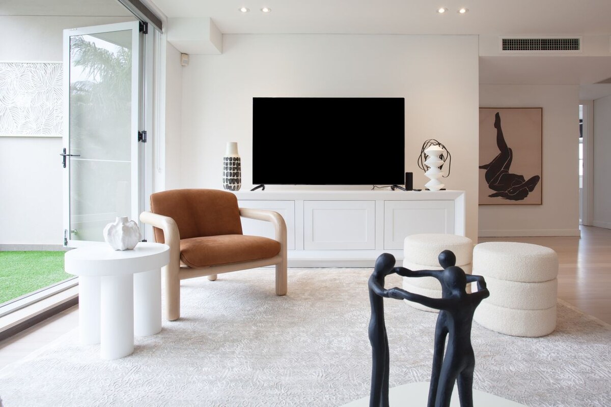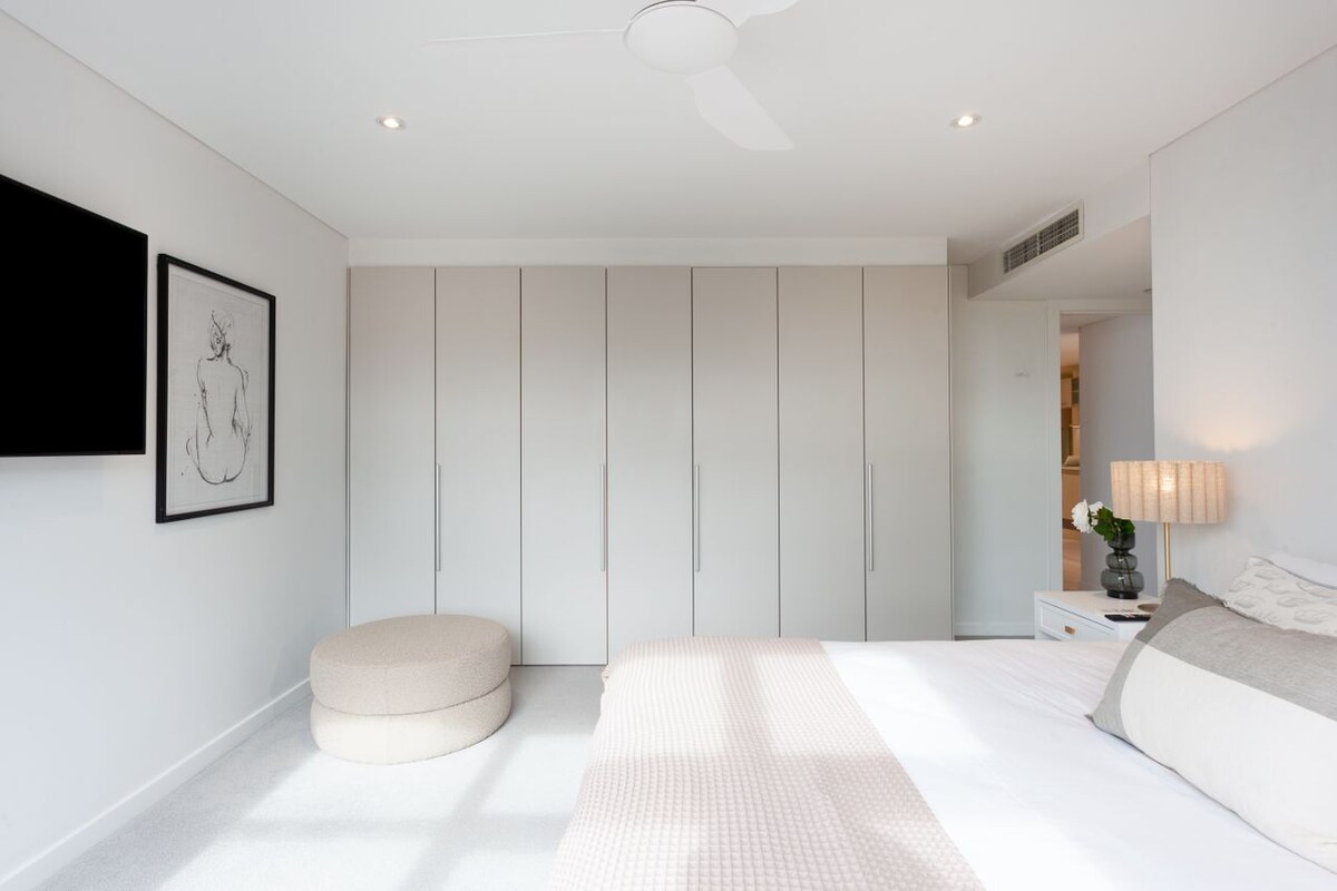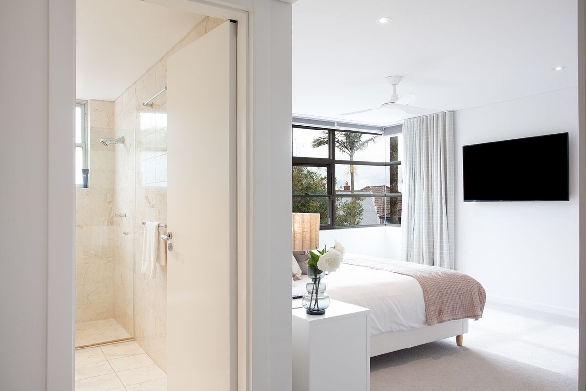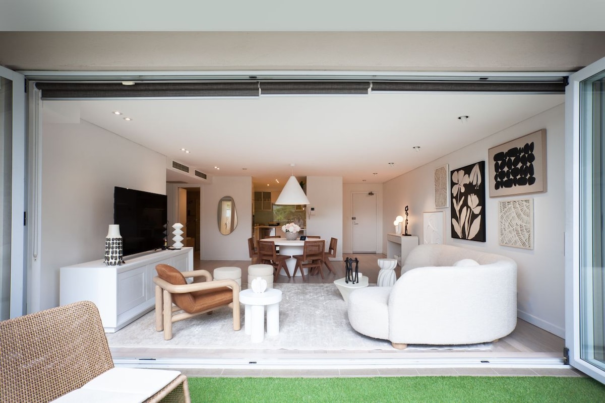 Entering this house-sized apartment you’re struck by the high-end and streamlined interior, capturing the essence of its laid back coastal setting. The spacious living and dining area is the heart of this home, where a curvaceous sofa is bathed in sunlight which streams in from the bright North-westerly aspect. Soft organic neutral interiors create a sense of calm throughout the main space, only enhanced by the large windows opening onto the balcony. Recline with a cocktail and watch the sunset from your serene, modern outdoor seating area, taking in the sweeping views. A full kitchen gives you ample space to prep across the U-shaped counters and offers all of the convenience you would need for an extended stay.