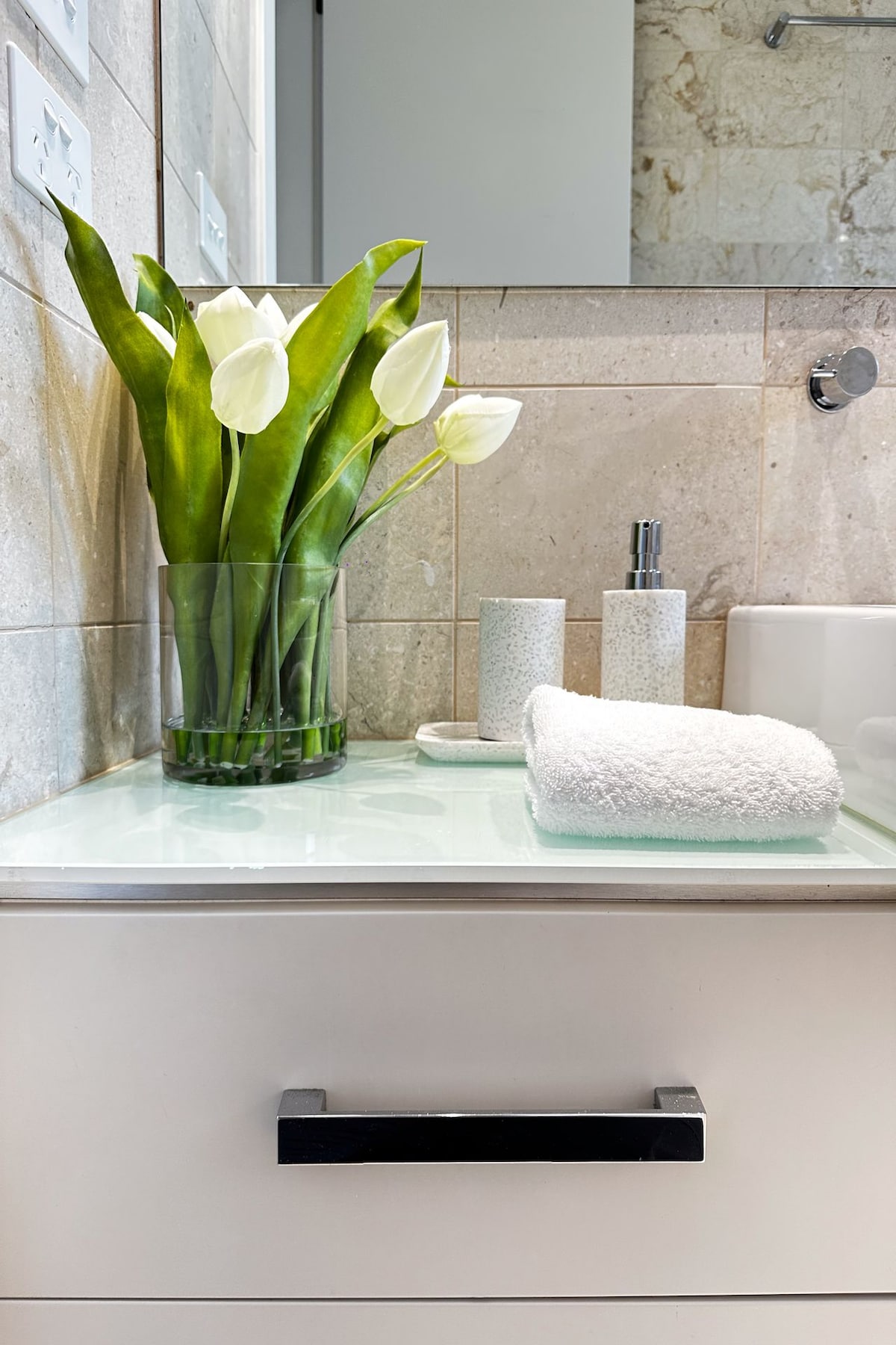The three bedrooms are unforgettable retreats, delivering the ultimate comfort and serenity for an uninterrupted slumber. All three boast astounding Ocean views - the most tranquil way to wake up every morning. The master bedroom holds a sumptuous King bed, the second a Queen, and for families, the third bedroom is ideal for children with a Single bed plus a cot, should you need it. Offering ample space to relax and unwind, two bathrooms are at your disposal, one with a full bath in a marble-effect surrounding, and the second with a luxurious overhead shower.