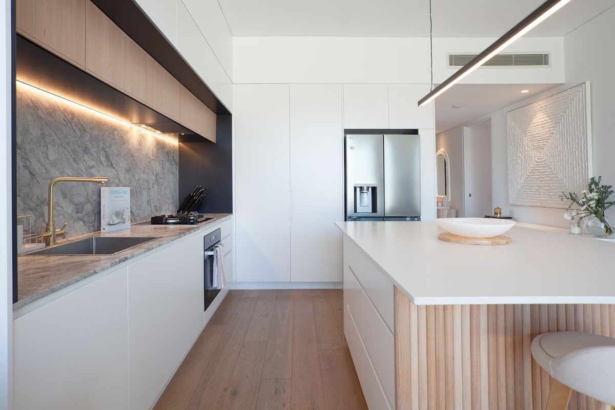 Ascending to this penthouse you’ll emerge into the essence of class and refinement. An open-plan layout opening onto your private, expansive terrace forms a to-die-for entertaining space. Beginning in the living room, atop Oak flooring, sits a slouched ash-grey sofa, in front of a stylish marble coffee table, where you can bask in the sun, and benefit from an ocean breeze wafting through the sliding glass doors as soft music surrounds you from built-in Sonos speakers. Enjoy the best of summer by spilling onto the wraparound balcony, where comfy white outdoor armchairs invite casual cocktails and conversation. For evening dinners, an alfresco dining table and BBQ are at your disposal. Indoors, you’ll find a high-spec kitchen to complete your casual spaces. Boasting a large kitchen island, premium Miele appliances and an abundance of storage, this is the perfect place to cook up a storm.