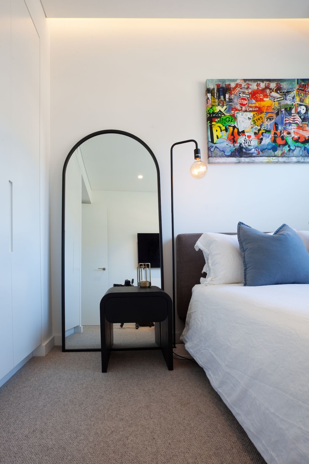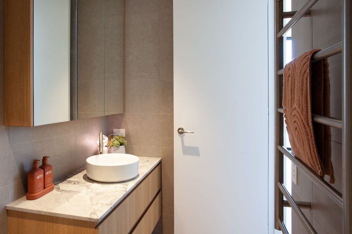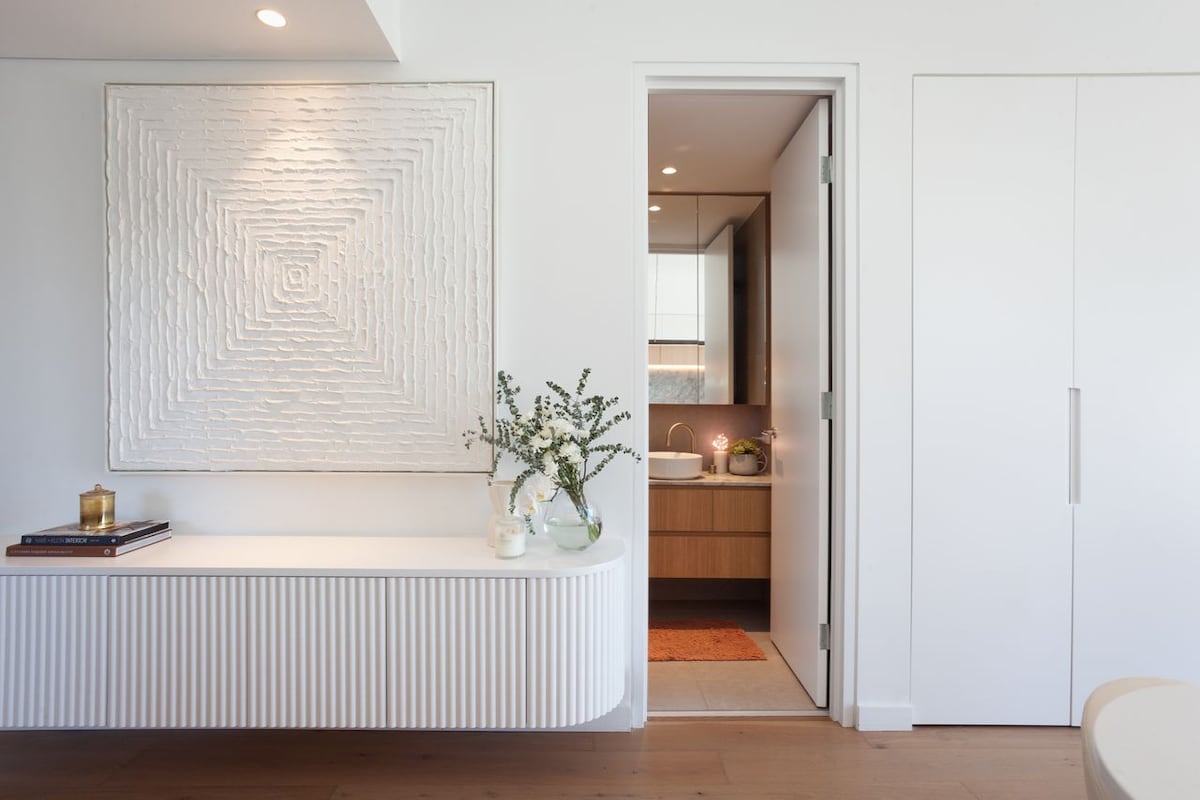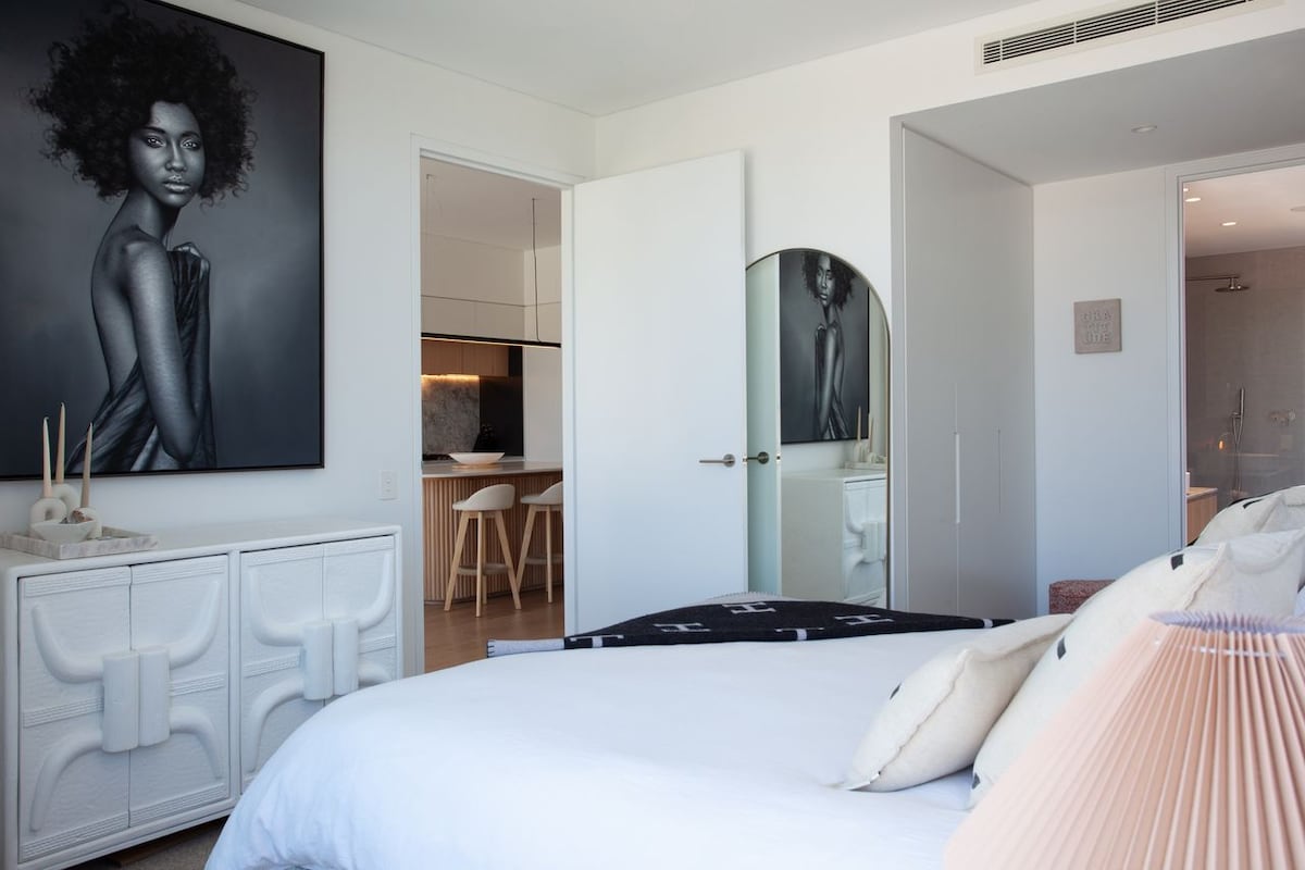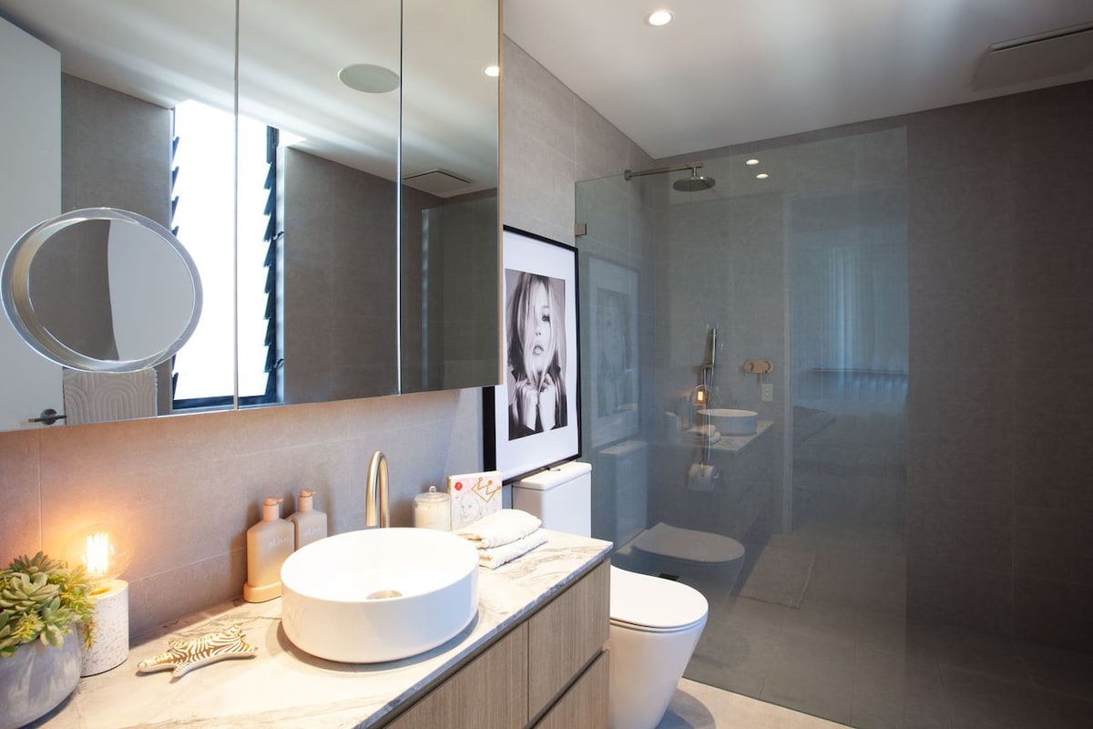 The restful modern elegance continues across three bedrooms, perfectly appointed to offer space, style, and tranquillity. The master bedroom is a private haven with its own private ensuite, featuring a luxurious shower. A timeless monochrome scheme accentuates a King-bed, adjacent to a second set of sliding doors opening onto the balcony area. The second and third bedrooms are equally fabulous, one featuring a restful neutral scheme and built-in corner shelving, and the second showcasing bright modern art next to built-in wardrobe storage. A family bathroom is also at your disposal, where dramatic, under-cabinet lighting accentuates the opulent finishes of this spa-like retreat.