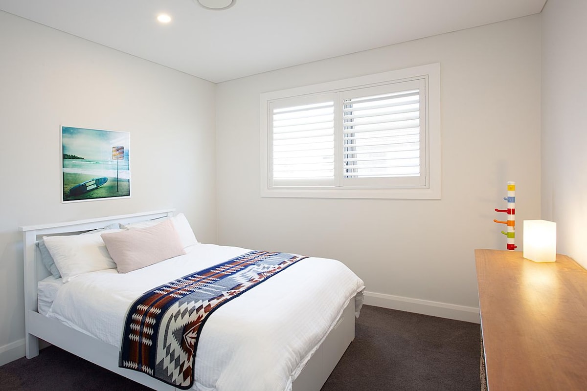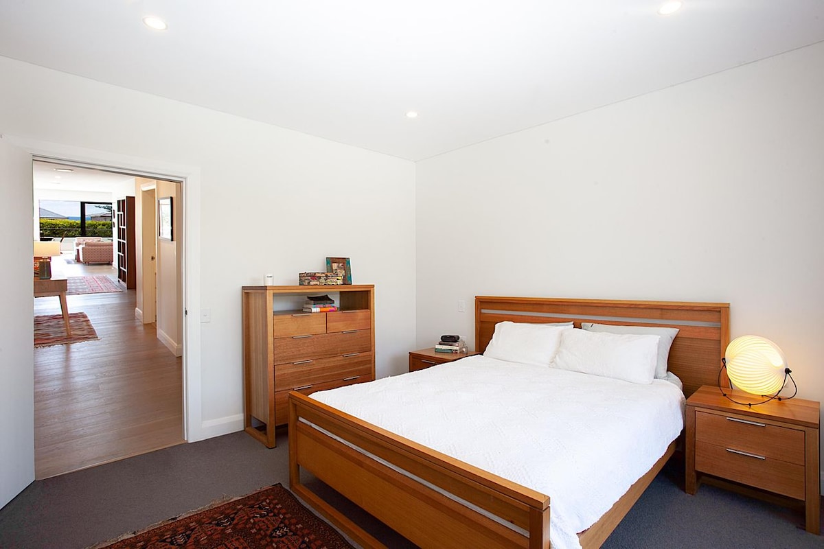The heart of this dreamy apartment is the open-plan living space, which blends seamlessly onto the spacious balcony. To best take in the ocean views the kitchen is set back in the living space, separated by a fresh white breakfast bar which doubles as a preparation space for cooking if you need it. There is also a natural wooden dining table, seating up to six, atop a traditional rug in the centre of the room. Surrounding another gorgeous rug is a cosy seating area, the perfect place to relax with friends or snuggle up to enjoy a film. Tucked away in the rear of the single-level apartment are three large bedrooms, each with large comfy beds and plenty of natural light.