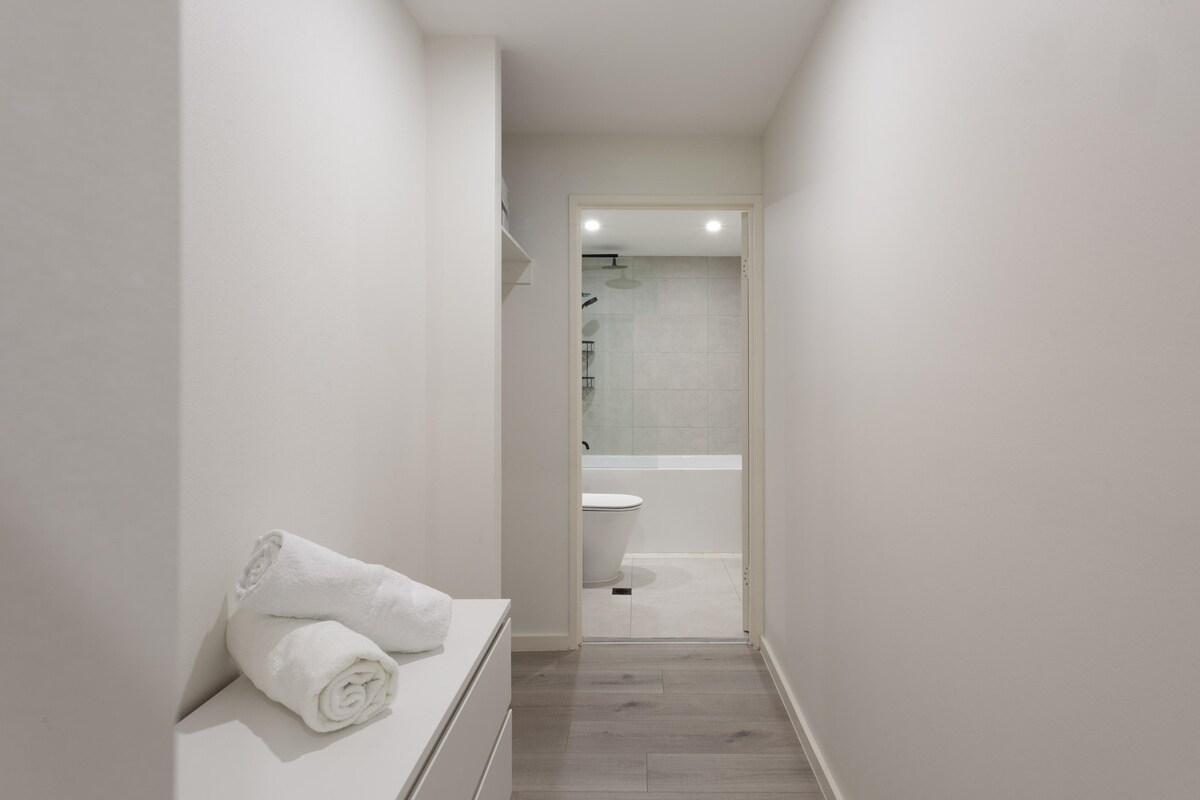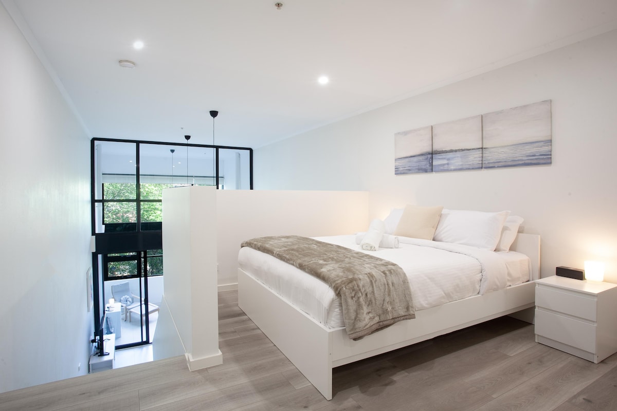Cleverly spacious, this minimal apartment embraces light and leafy views. A dramatic, black-framed floor-to-ceiling window opens onto a private covered balcony, flooding this home with light and style. Intelligent design choices can be found throughout this urban loft; sliding doors separate your rooms, and a mezzanine bedroom is found atop the pristine living space. Glass tables and white furniture deliver a chic and well-thought-out space; dining on your balcony with a park view is as divine as working from your laptop on the comfortable sofa.