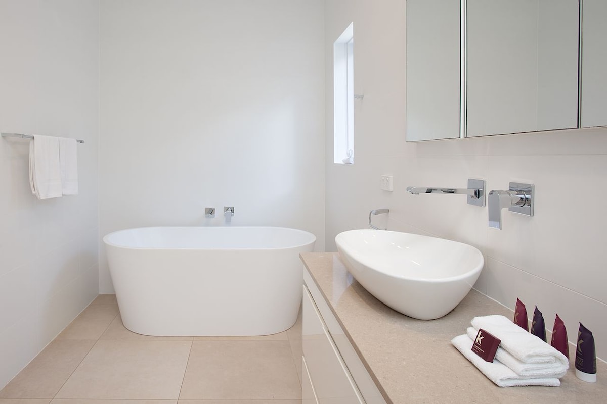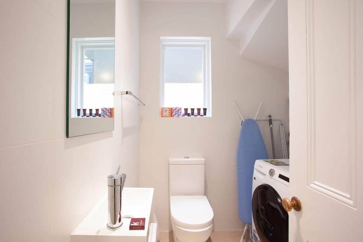 Sleeping up to 8 guests, the brilliant elegance of this home is only enhanced as you ascend to the first floor. The master bedroom is a restful retreat, where wooden floors and white walls form the perfect backdrop for the soft contemporary art, and a Scandi-style monochrome rug, in front of the gorgeous, traditional tiled fireplace. You can sink into a King-sized bed here, plus, you have a private balcony to enjoy a morning coffee. The second bedroom boasts a queen bed with an oak bed frame and a matching side table. A restful grey colour scheme has been applied here, evoking a stylish sense of calm. This serenity continues into the final full bedroom, where a Split-King has been presented as two single beds which can be made up as a king on request. If you have a larger group, there is also the option to make use of a sofa bed in the lounge. This home also boasts two bathrooms. On the first floor, you’ll find a modern-traditional bathroom with a deep, freestanding tub. On the ground floor, there is a practical second bathroom, with a toilet and walk-in shower.
