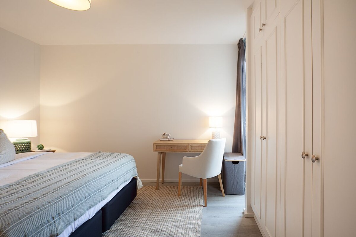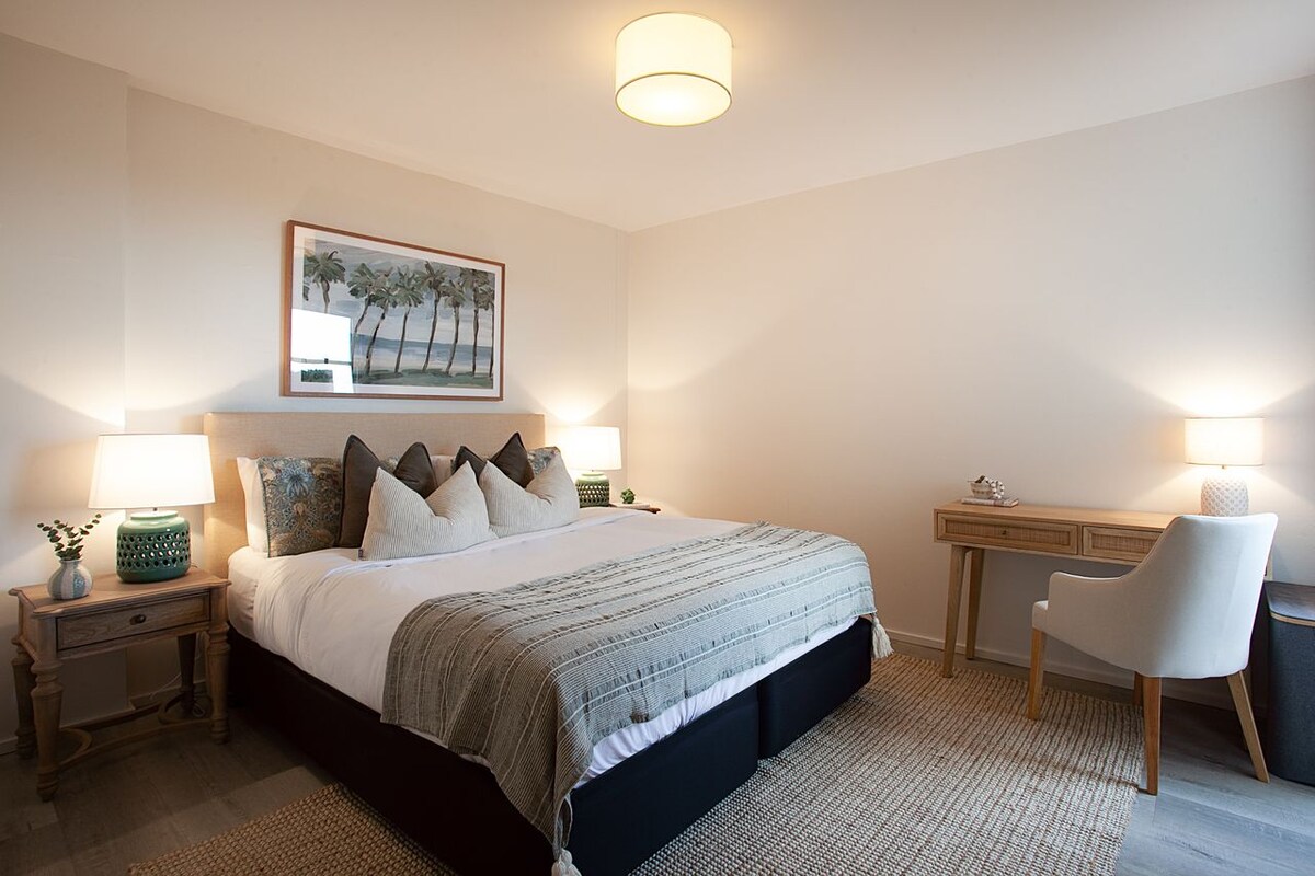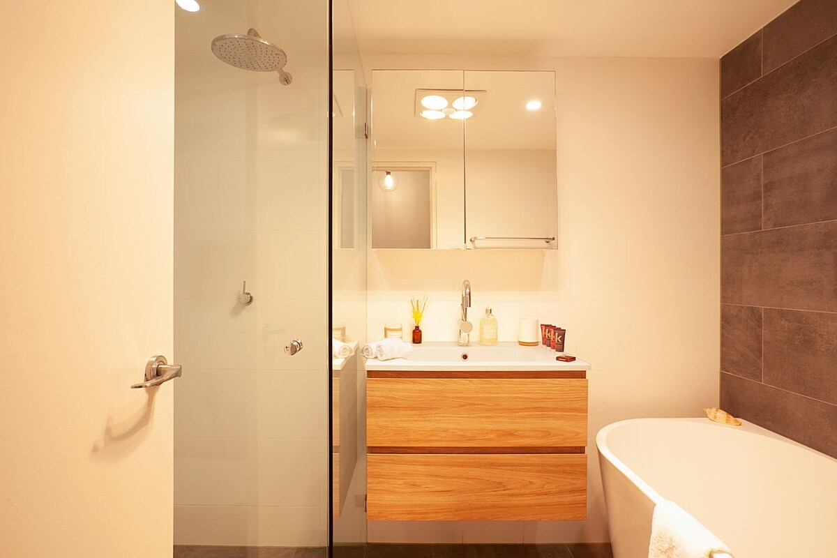 The master bedroom is large, bright, and airy, with its sumptuous king-size bed and luxury linen. The bedroom offers an abundance of storage space for your luggage and personal items and includes a desk and chair perfect for the ‘digital nomads’. The sleek, modern bathroom features a free-standing bath ideal for relaxing. The romantic couple will enjoy the dual shower!