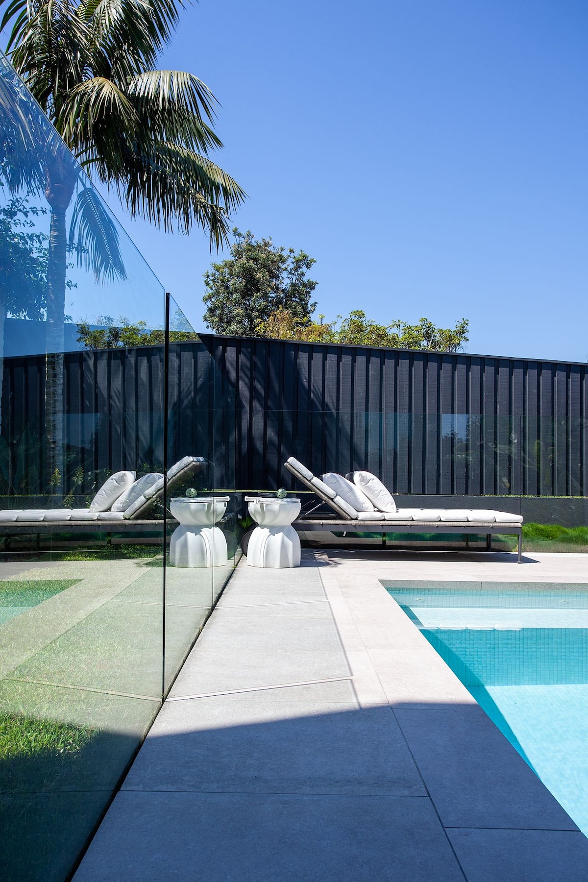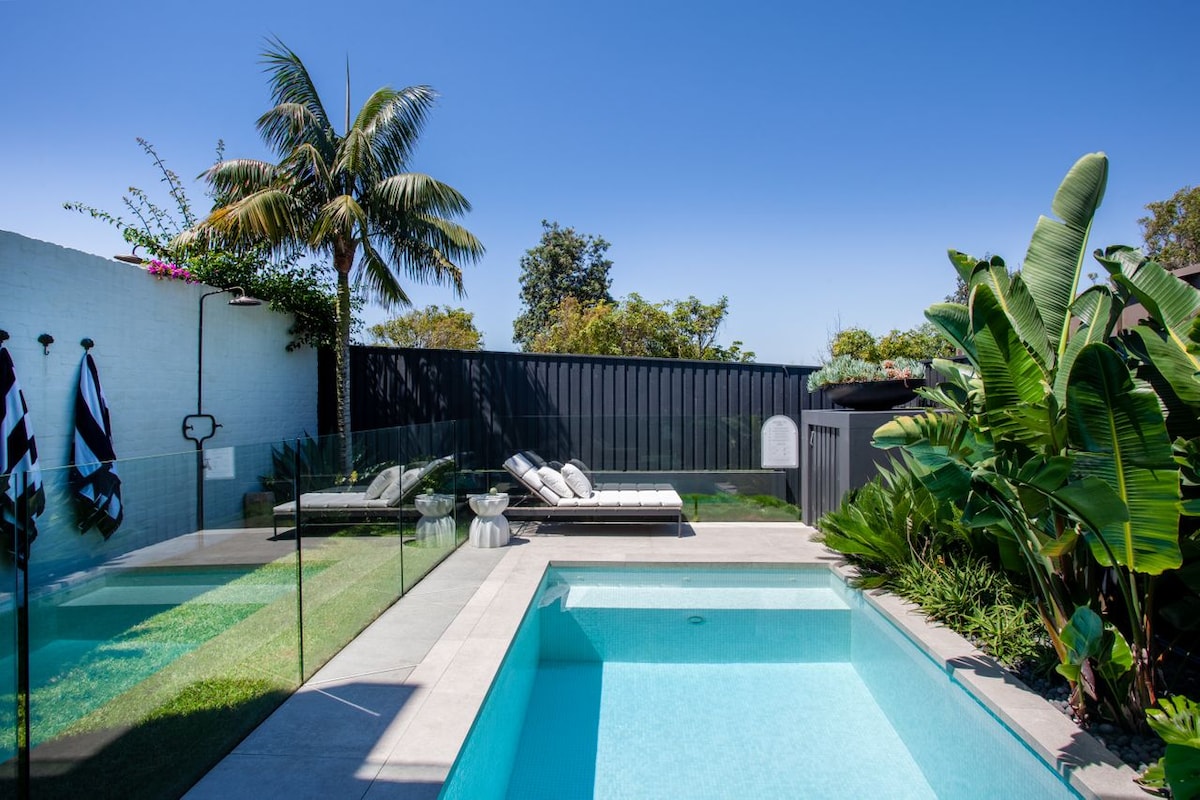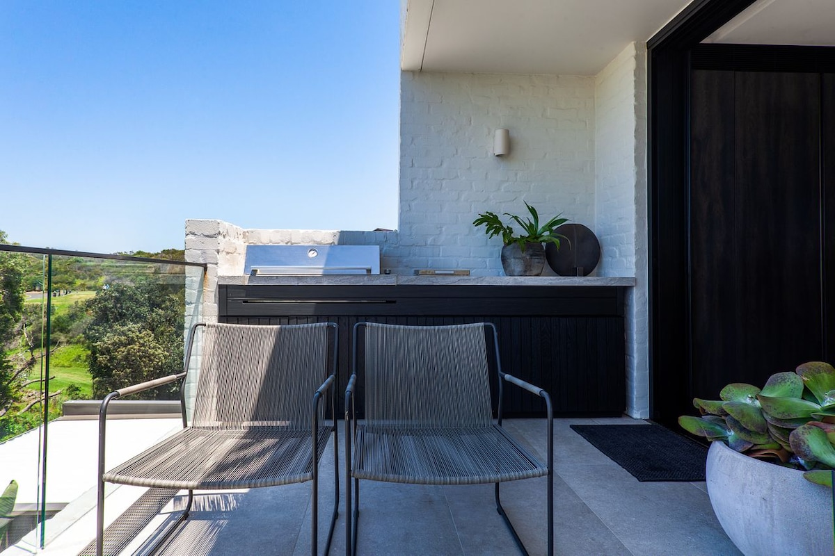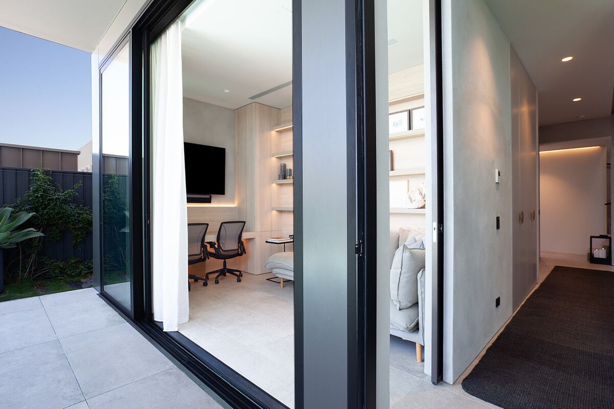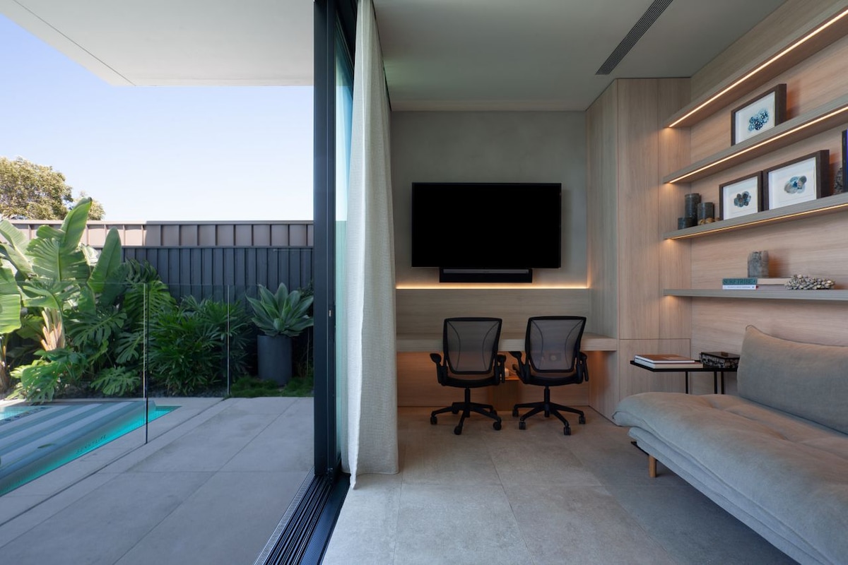 The open-plan living space in this home is a stunning example of innovative modern living. Dark built-in kitchen countertops frame picture windows, ensuring the view takes centre stage. Connecting you seamlessly to the outdoors, the countertop extends onto the covered terrace, creating an outdoor barbecue and prep space that complements the stylish, relaxed seating area. For more formal dining, head inside where you’ll find a dining table seating ten, surrounded by a clever mix of built-in banquette seating and contemporary dining chairs. A serene L-shaped cream sofa cradles the back corner of the room, overlooking a wall-mounted TV and fireplace. If you need additional room to spread out, a second sofa awaits in the boutique office space. This thoughtfully designed room includes desk space with two office chairs for working and doubles as a second sitting room, offering a shaded retreat with pool views through floor-to-ceiling glass doors. And that pool we mentioned? It’s completely private and surrounded by perfectly manicured lawns, loungers, a hanging egg chair, and outdoor showers with hot or cold water. It’s the ideal spot to spend a relaxed day in the sun, with a cool cocktail as an accompaniment.