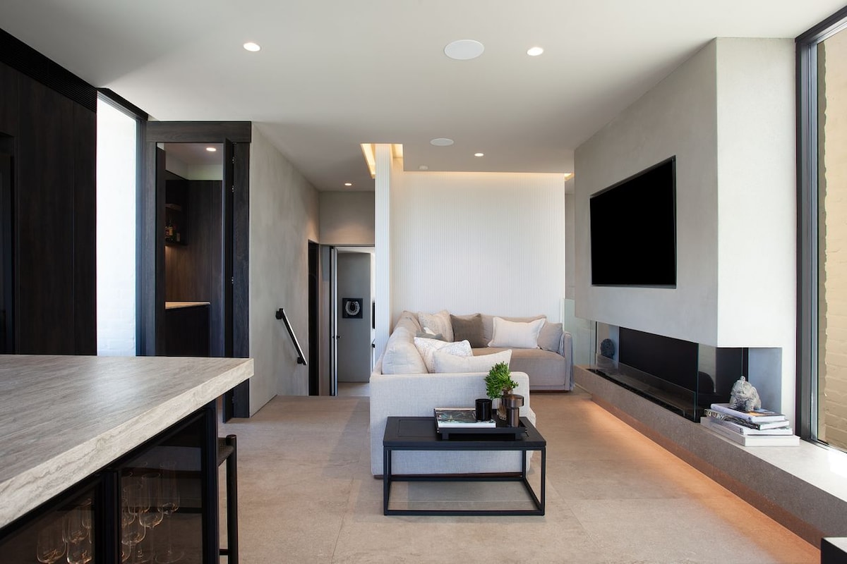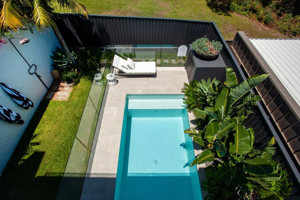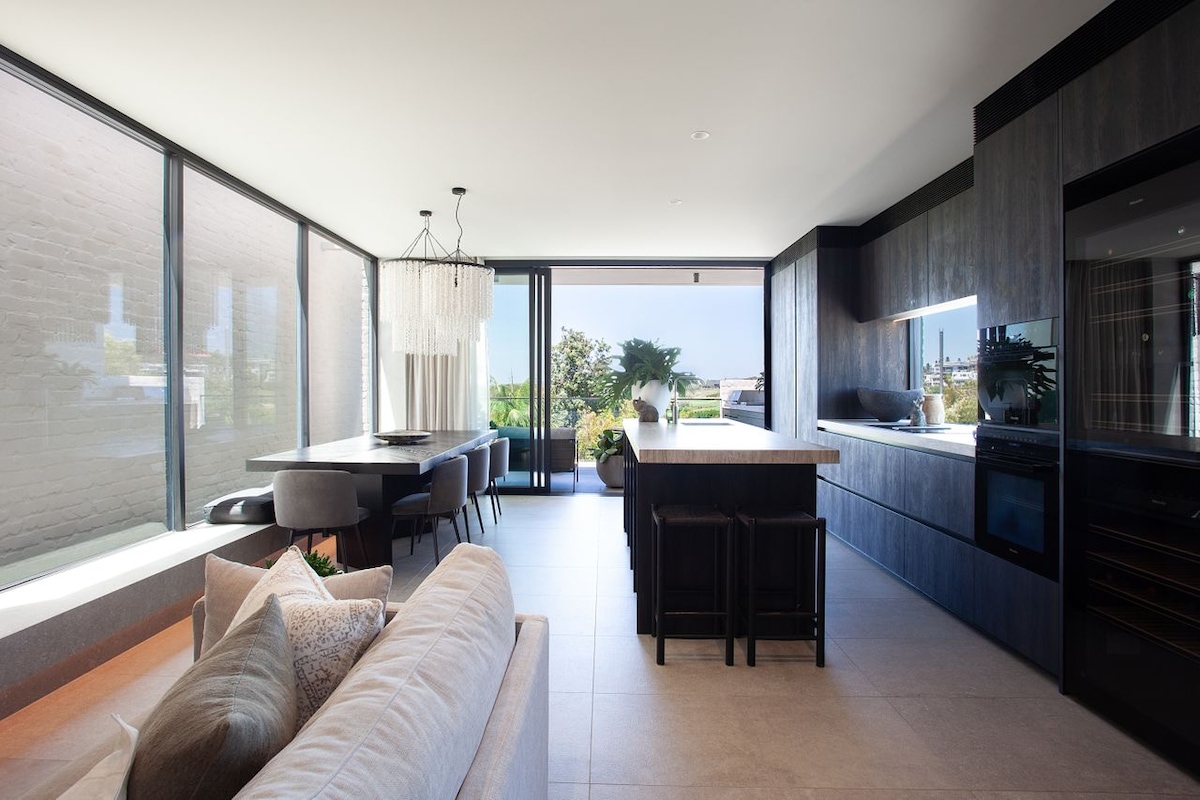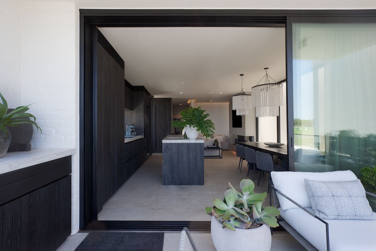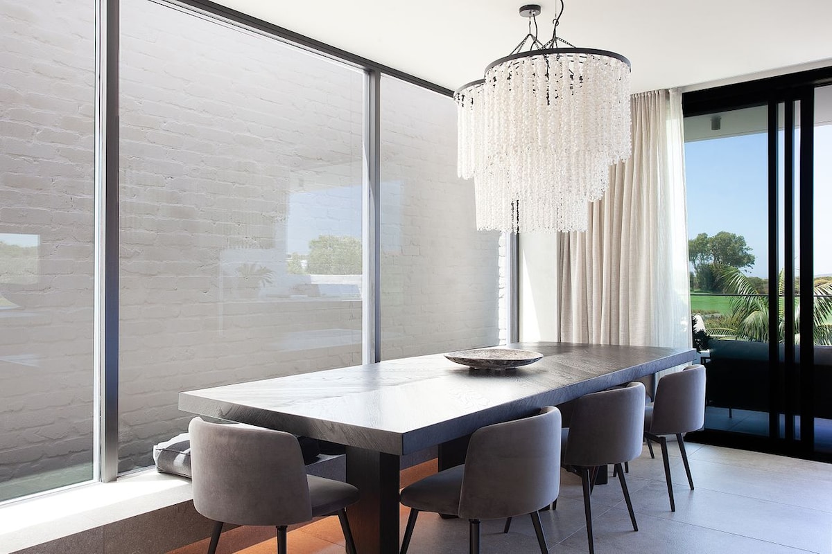 The open-plan living space in this home is a stunning example of innovative modern living. Dark built-in kitchen countertops frame picture windows, ensuring the view takes centre stage. Connecting you seamlessly to the outdoors, the countertop extends onto the covered terrace, creating an outdoor barbecue and prep space that complements the stylish, relaxed seating area. For more formal dining, head inside where you’ll find a dining table seating ten, surrounded by a clever mix of built-in banquette seating and contemporary dining chairs. A serene L-shaped cream sofa cradles the back corner of the room, overlooking a wall-mounted TV and fireplace. If you need additional room to spread out, a second sofa awaits in the boutique office space. This thoughtfully designed room includes desk space with two office chairs for working and doubles as a second sitting room, offering a shaded retreat with pool views through floor-to-ceiling glass doors. And that pool we mentioned? It’s completely private and surrounded by perfectly manicured lawns, loungers, a hanging egg chair, and outdoor showers with hot or cold water. It’s the ideal spot to spend a relaxed day in the sun, with a cool cocktail as an accompaniment.