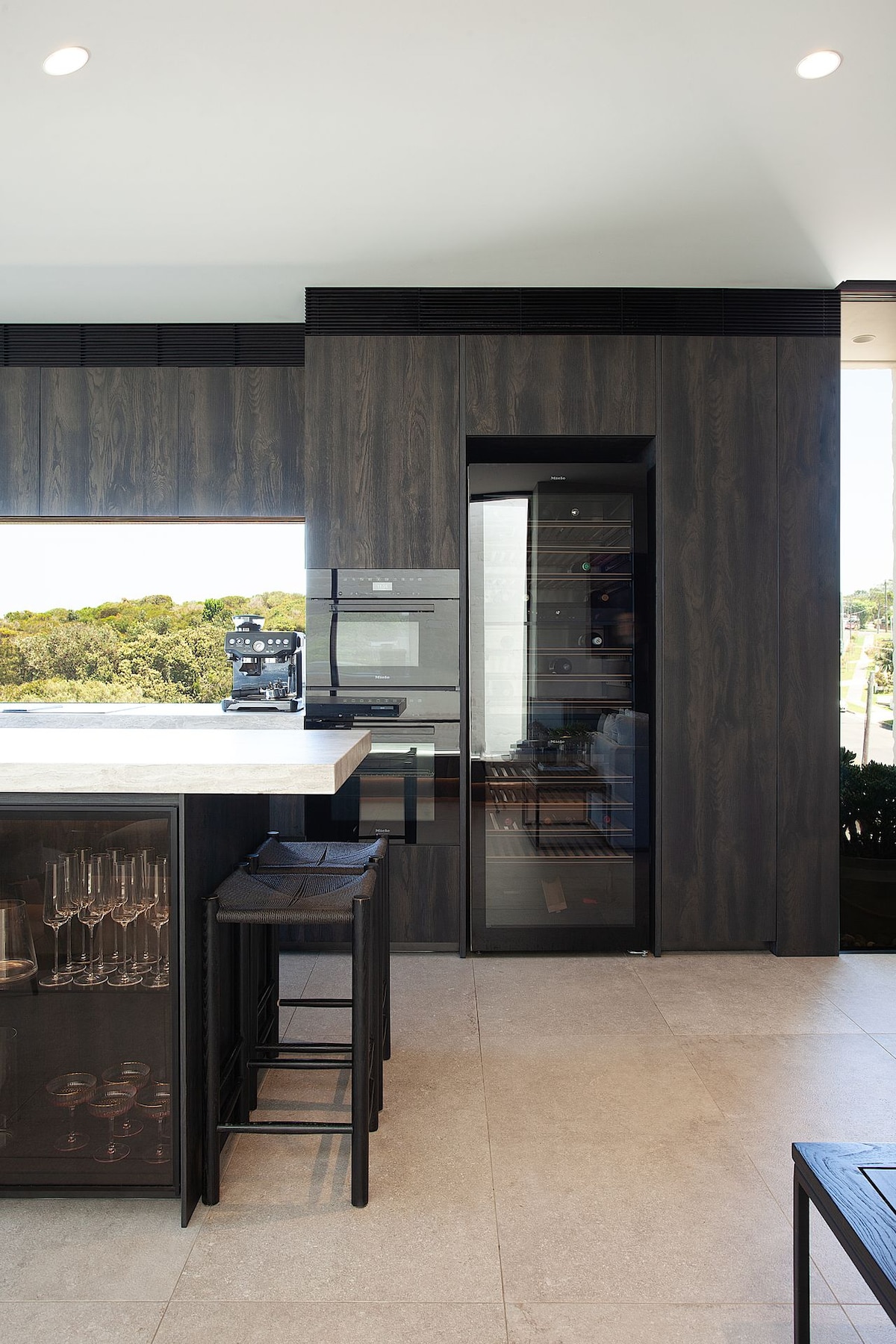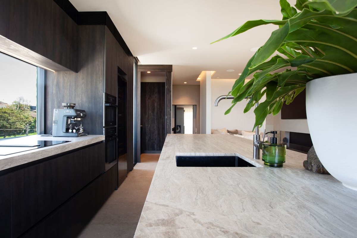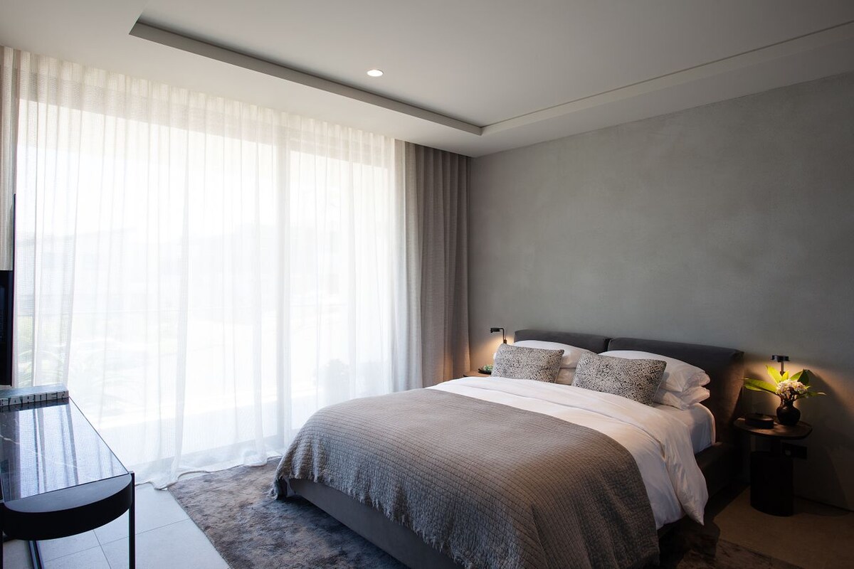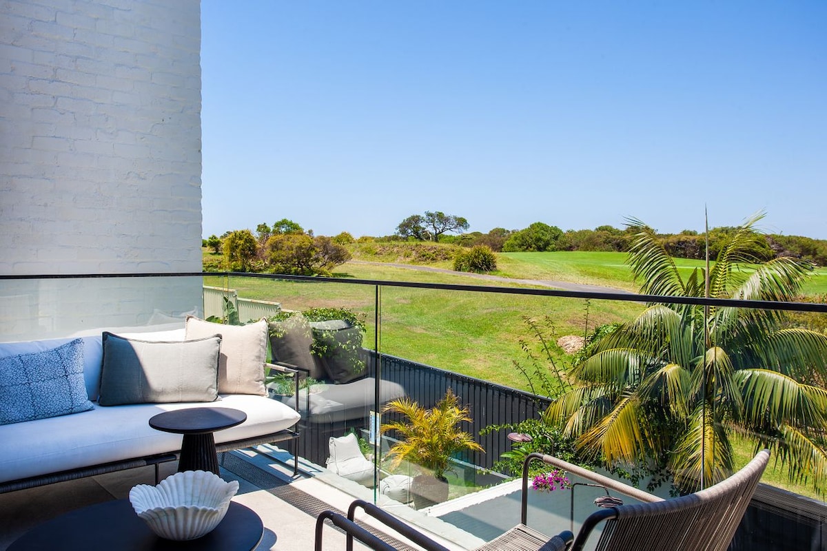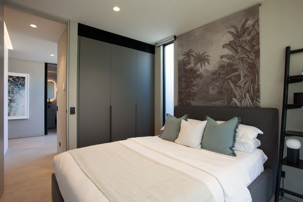 The open-plan living space in this home is a stunning example of innovative modern living. Dark built-in kitchen countertops frame picture windows, ensuring the view takes centre stage. Connecting you seamlessly to the outdoors, the countertop extends onto the covered terrace, creating an outdoor barbecue and prep space that complements the stylish, relaxed seating area. For more formal dining, head inside where you’ll find a dining table seating ten, surrounded by a clever mix of built-in banquette seating and contemporary dining chairs. A serene L-shaped cream sofa cradles the back corner of the room, overlooking a wall-mounted TV and fireplace. If you need additional room to spread out, a second sofa awaits in the boutique office space. This thoughtfully designed room includes desk space with two office chairs for working and doubles as a second sitting room, offering a shaded retreat with pool views through floor-to-ceiling glass doors. And that pool we mentioned? It’s completely private and surrounded by perfectly manicured lawns, loungers, a hanging egg chair, and outdoor showers with hot or cold water. It’s the ideal spot to spend a relaxed day in the sun, with a cool cocktail as an accompaniment.
