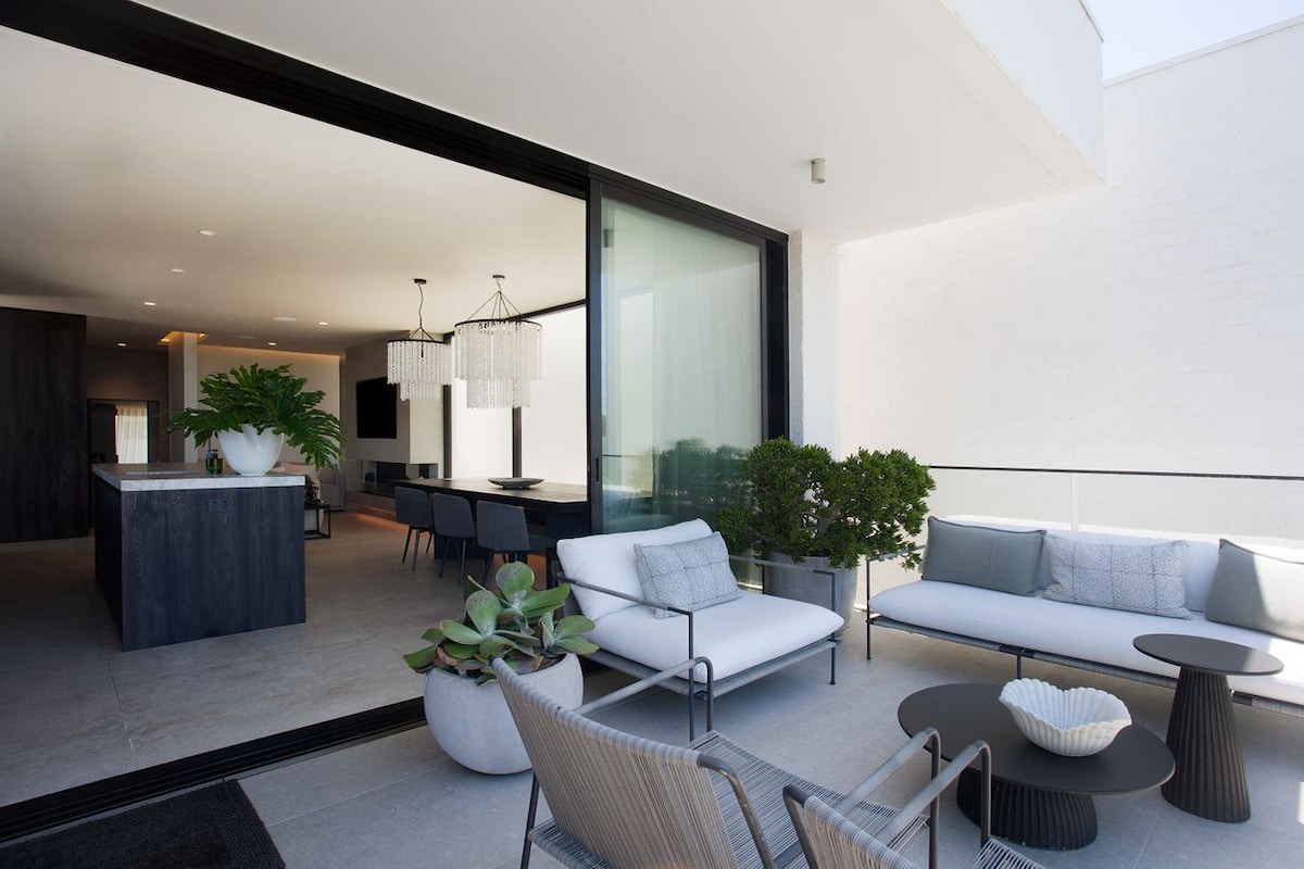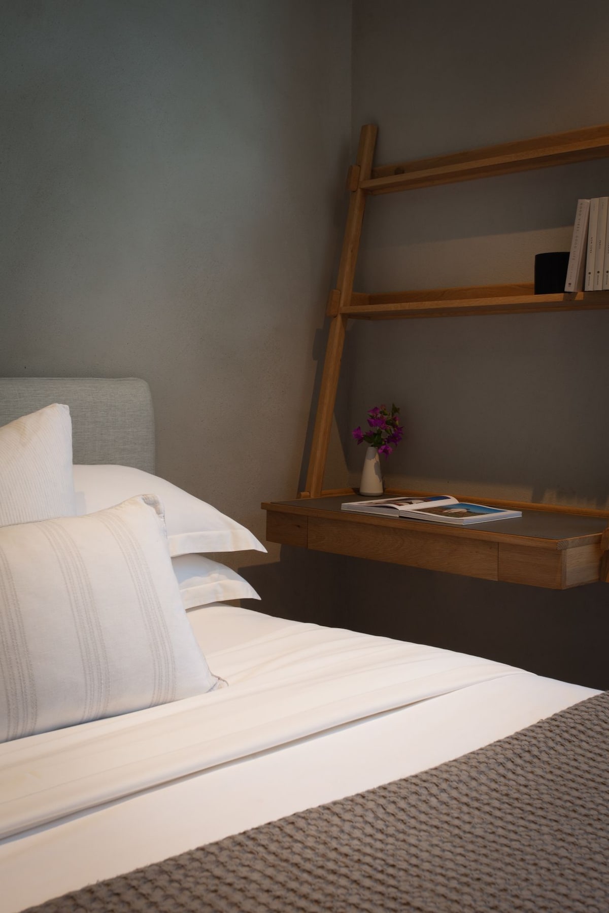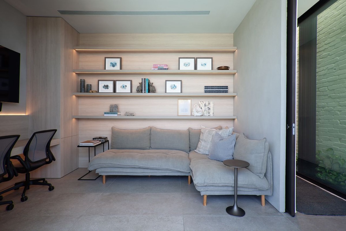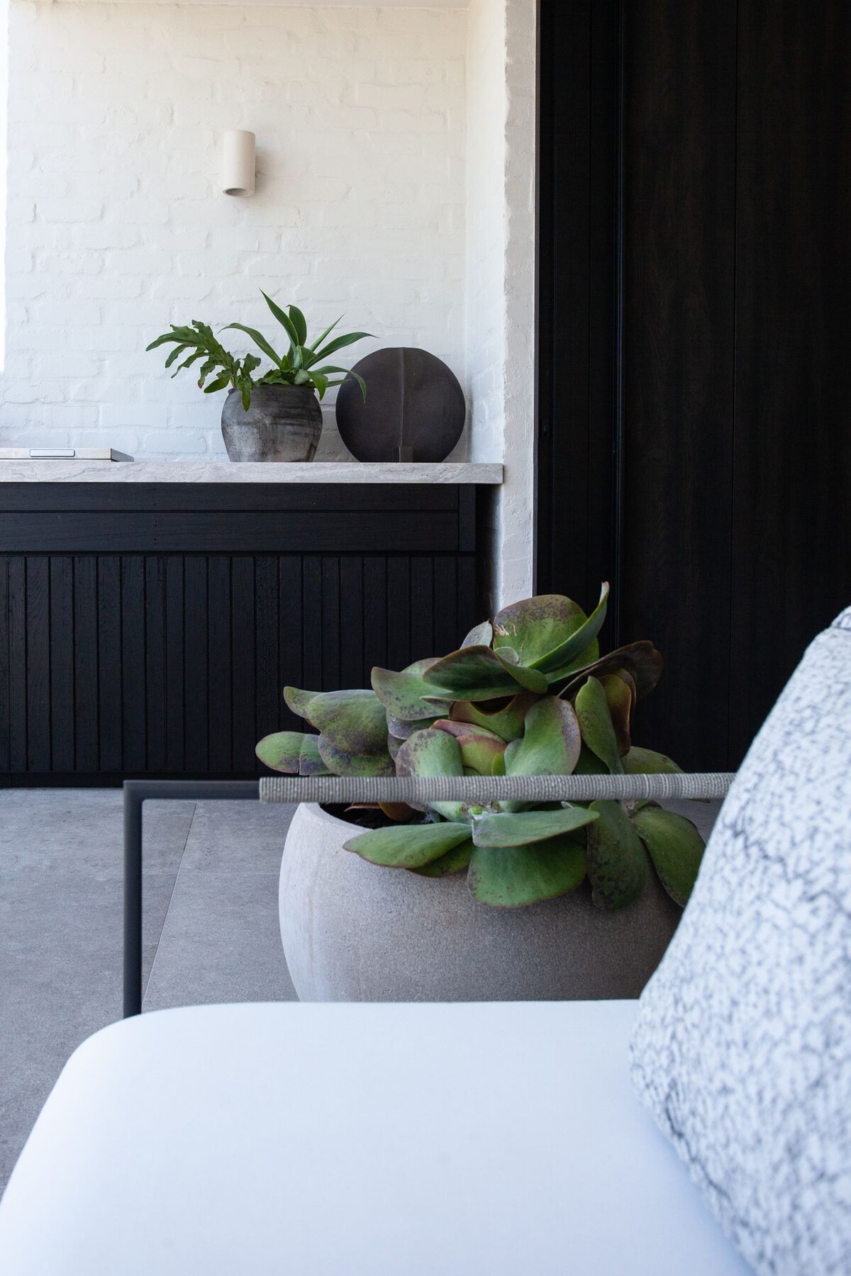 The open-plan living space in this home is a stunning example of innovative modern living. Dark built-in kitchen countertops frame picture windows, ensuring the view takes centre stage. Connecting you seamlessly to the outdoors, the countertop extends onto the covered terrace, creating an outdoor barbecue and prep space that complements the stylish, relaxed seating area. For more formal dining, head inside where you’ll find a dining table seating ten, surrounded by a clever mix of built-in banquette seating and contemporary dining chairs. A serene L-shaped cream sofa cradles the back corner of the room, overlooking a wall-mounted TV and fireplace. If you need additional room to spread out, a second sofa awaits in the boutique office space. This thoughtfully designed room includes desk space with two office chairs for working and doubles as a second sitting room, offering a shaded retreat with pool views through floor-to-ceiling glass doors. And that pool we mentioned? It’s completely private and surrounded by perfectly manicured lawns, loungers, a hanging egg chair, and outdoor showers with hot or cold water. It’s the ideal spot to spend a relaxed day in the sun, with a cool cocktail as an accompaniment.