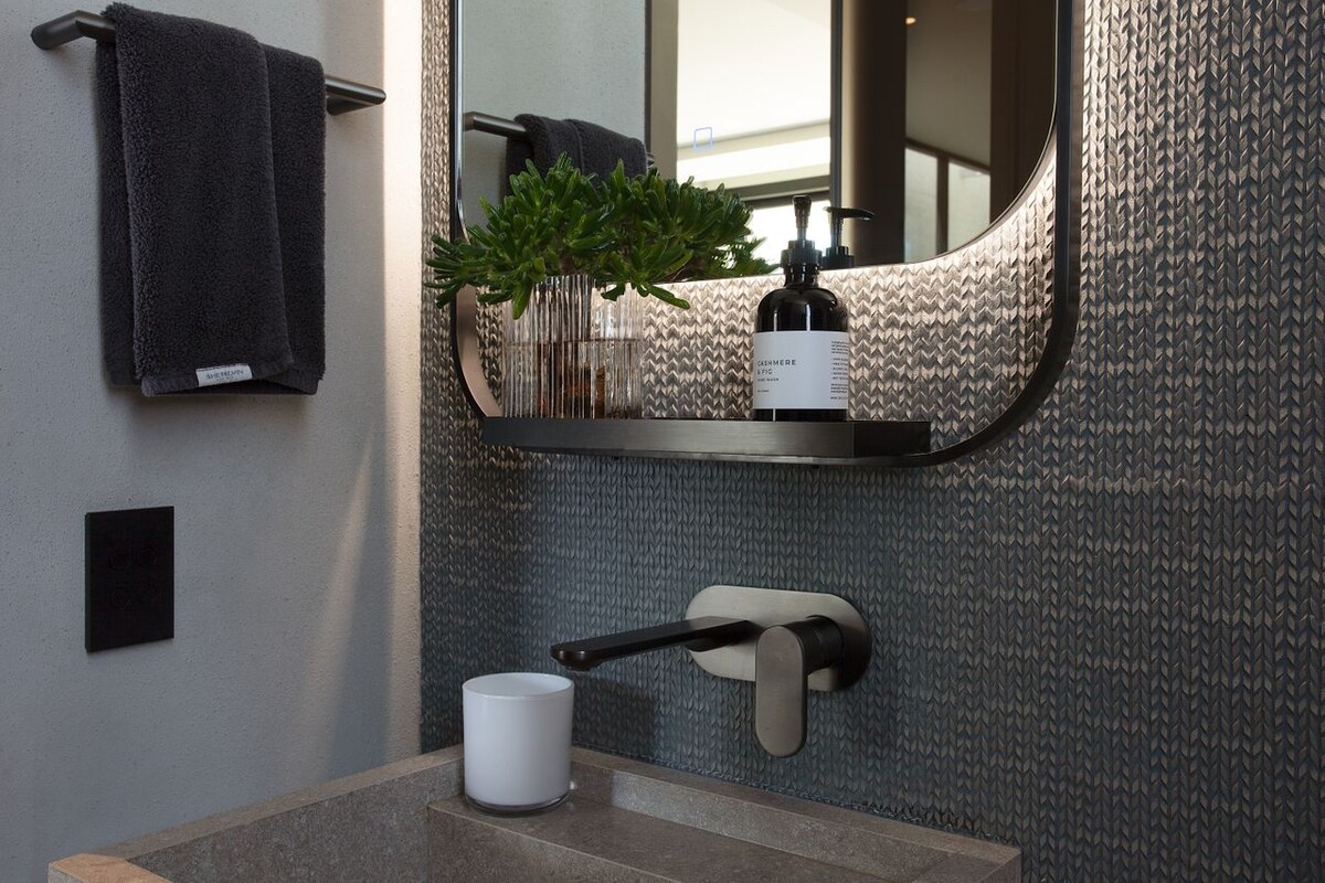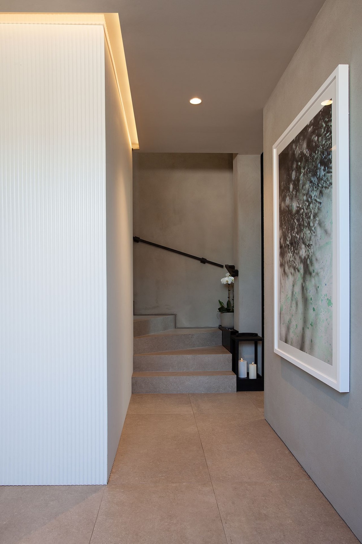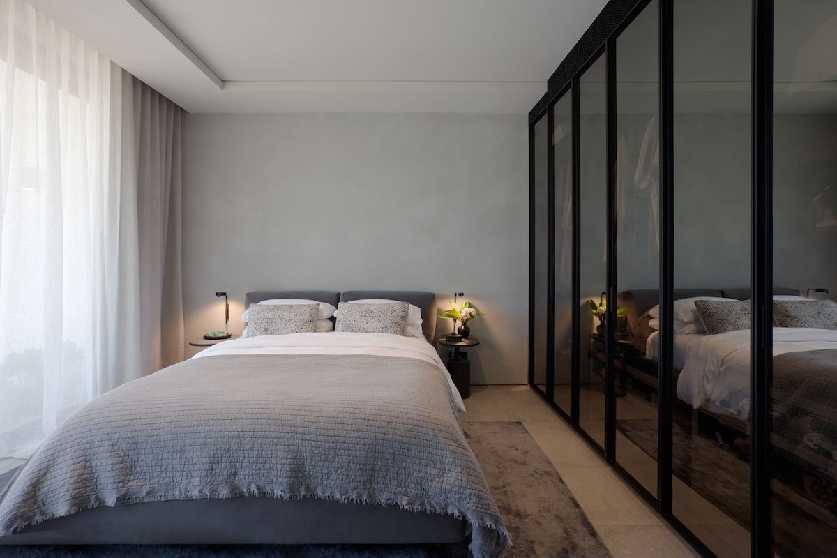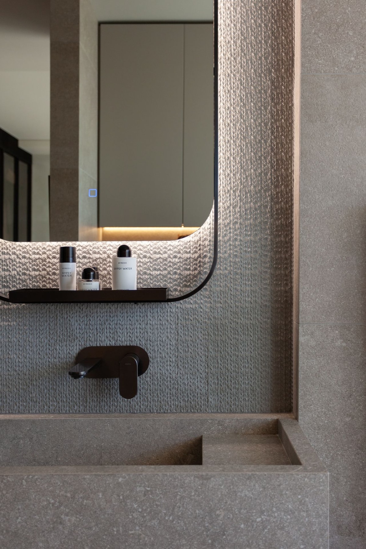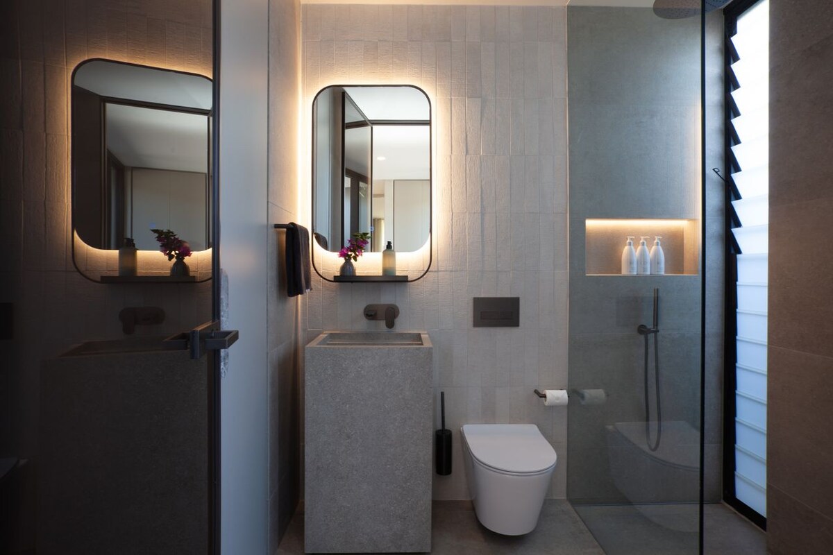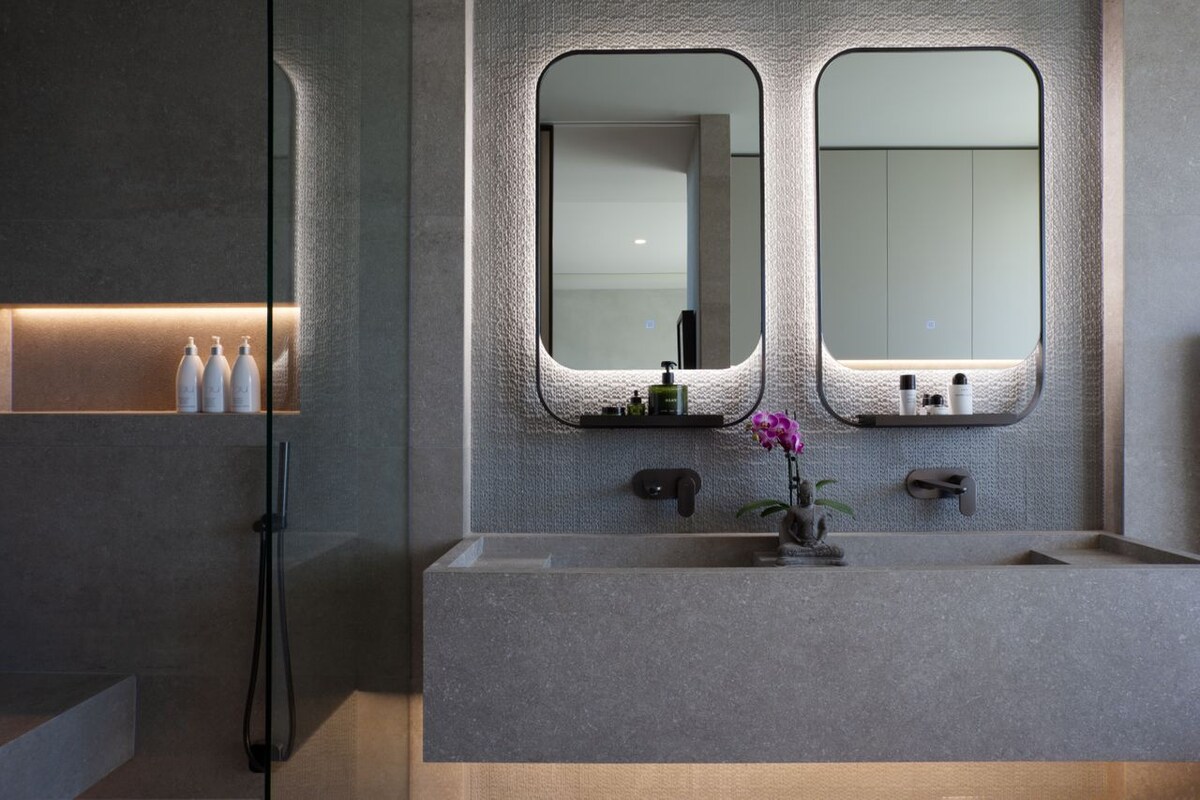 The modern bedrooms in this home are a flawless example of ambient lighting paired with raw materials. Concrete walls are softened with voile curtains, mirrors, and greyscale modern art, creating a cool, calm, and contemporary aesthetic—perfect for a restful escape. The master bedroom also features an ensuite for total privacy. Two family bathrooms along with a powder room complete this home’s setup. The first is the master ensuite resplendent in Italian porcelain tiles, with a floating stone double vanity, a walk-in shower with a floating stone bench seat and the luxurious option of a steam shower, and a deep freestanding bathtub. The second bathroom is a spa-like retreat, featuring chic tiling, a modern shower and a freestanding stone basin.