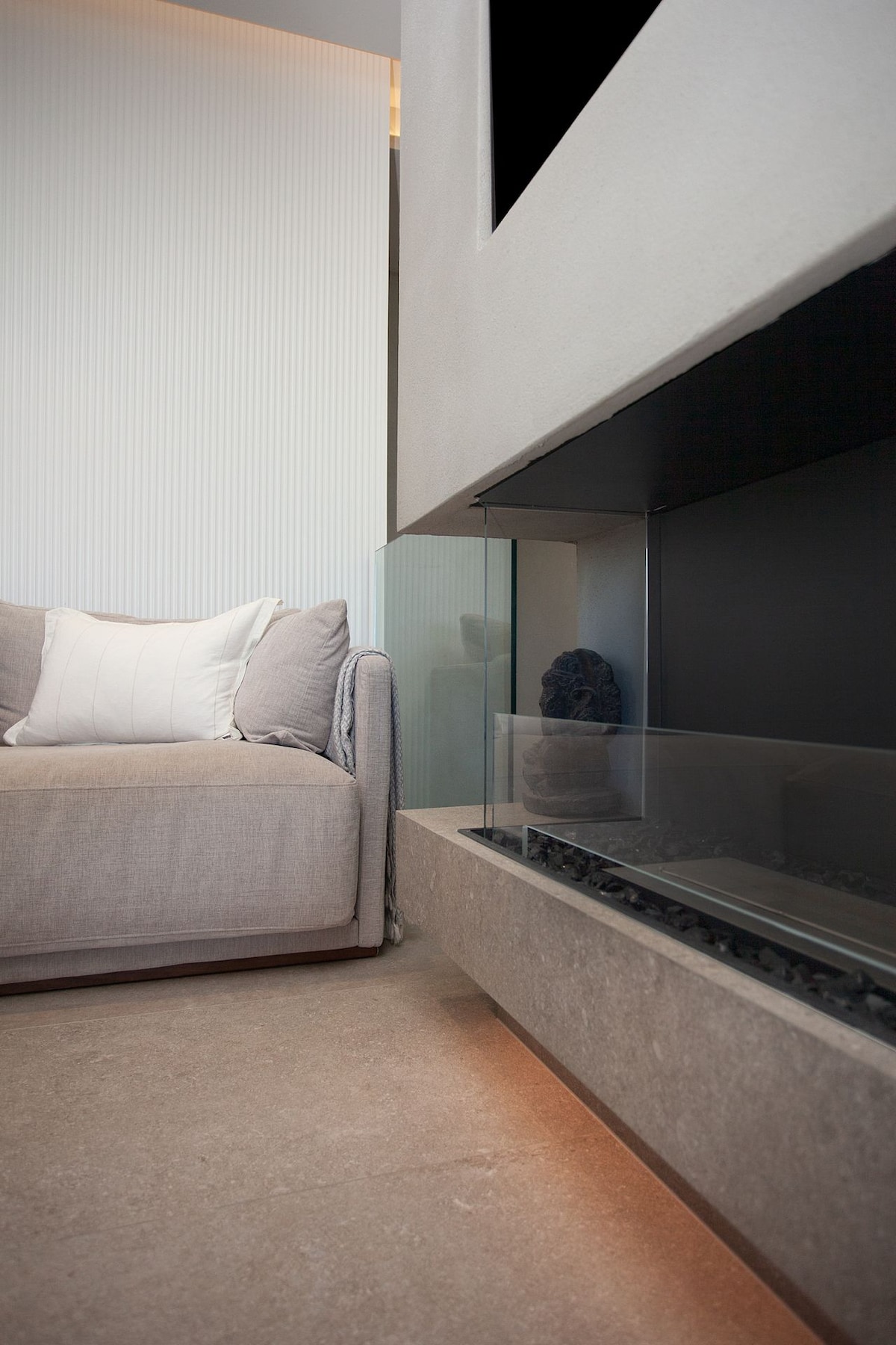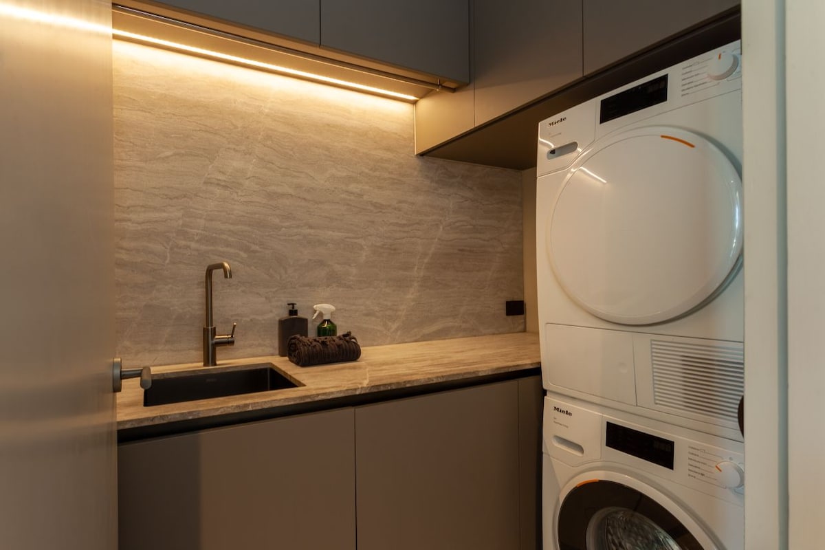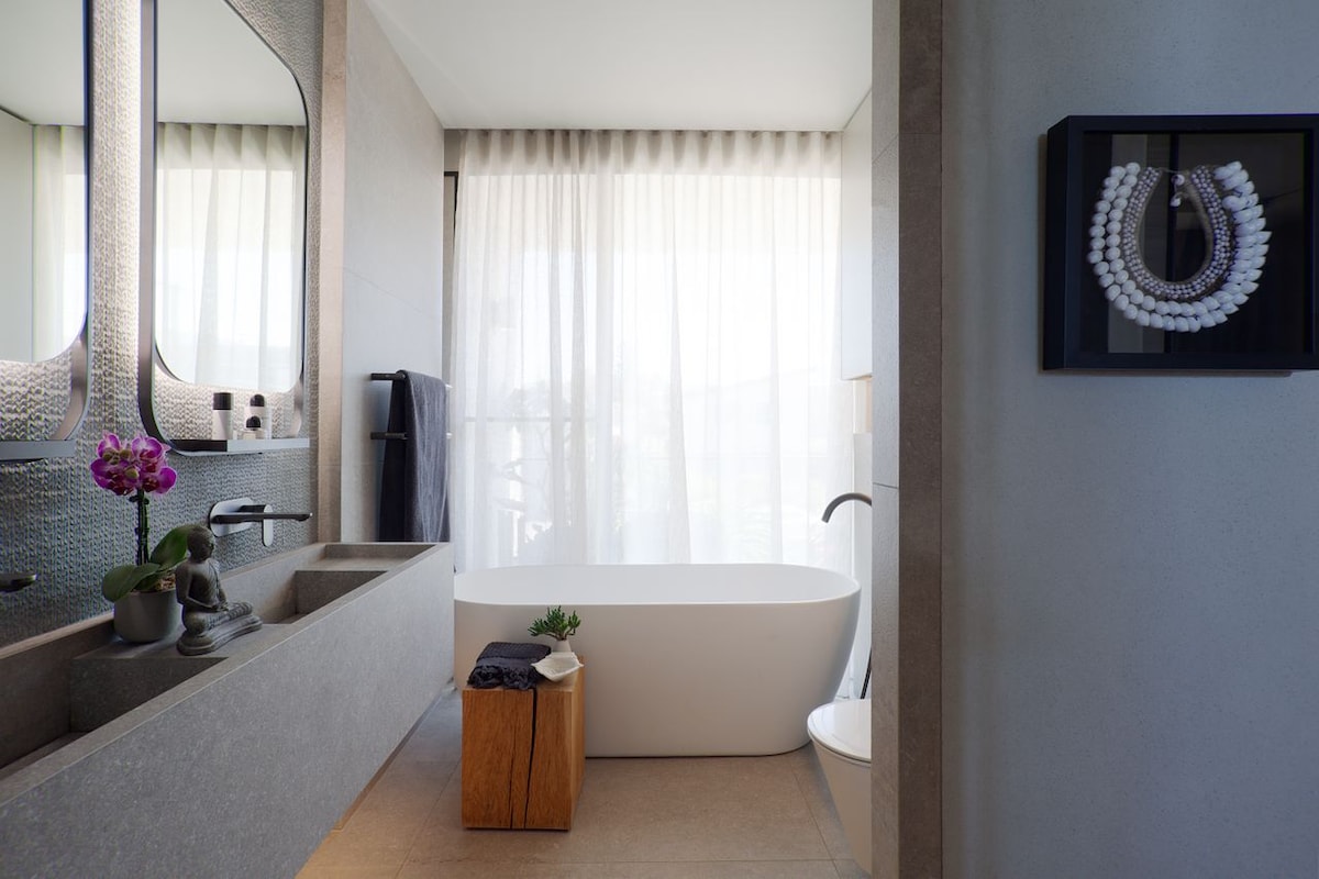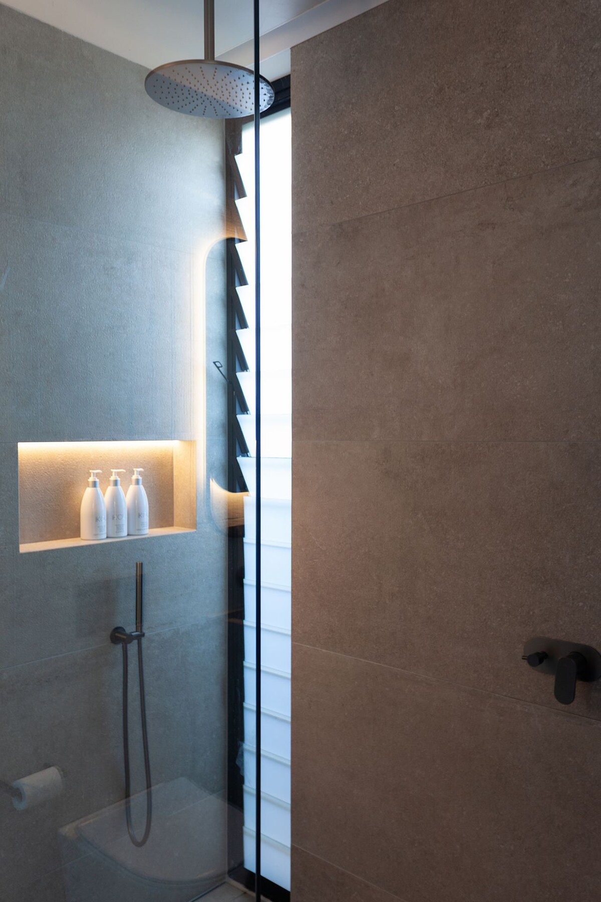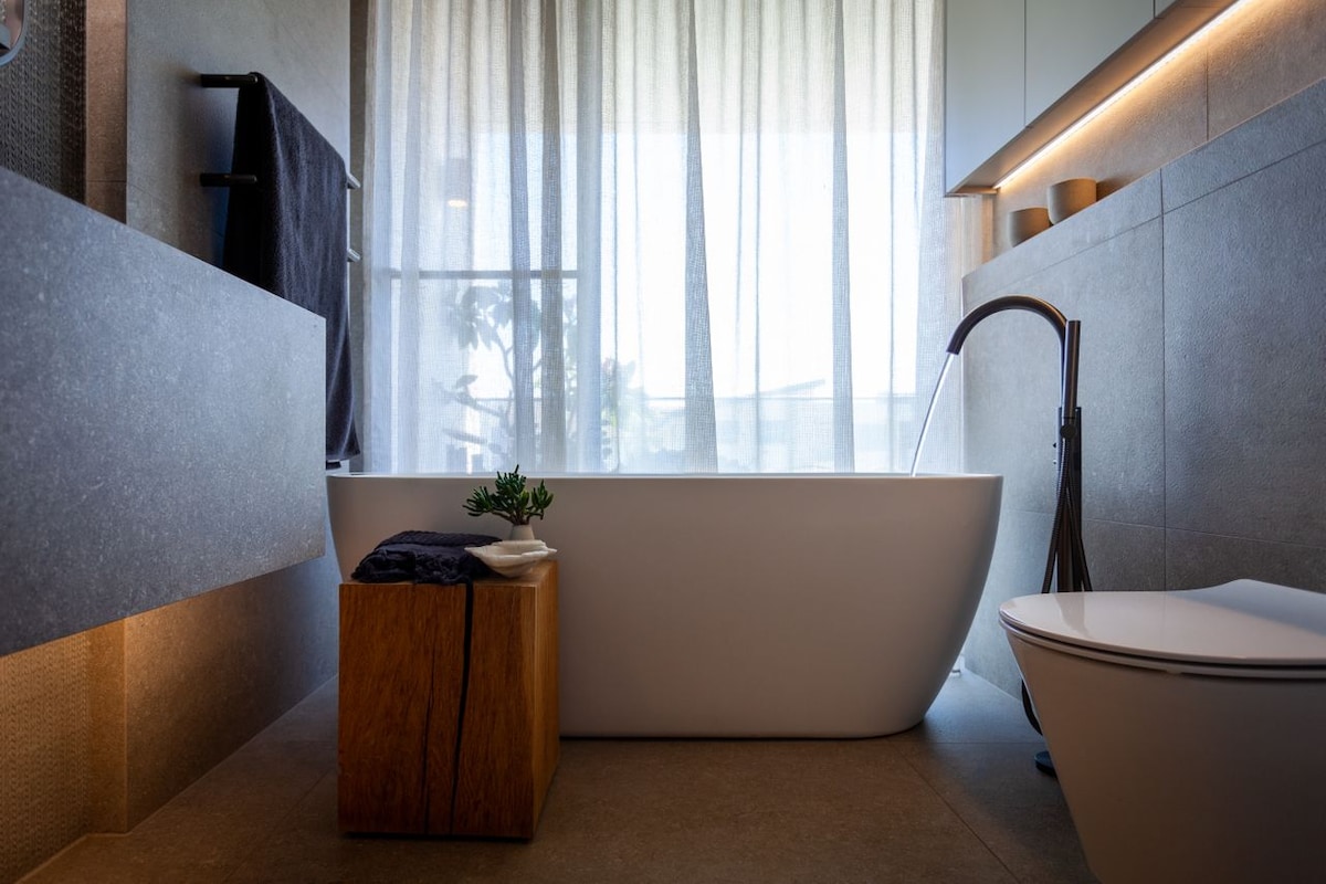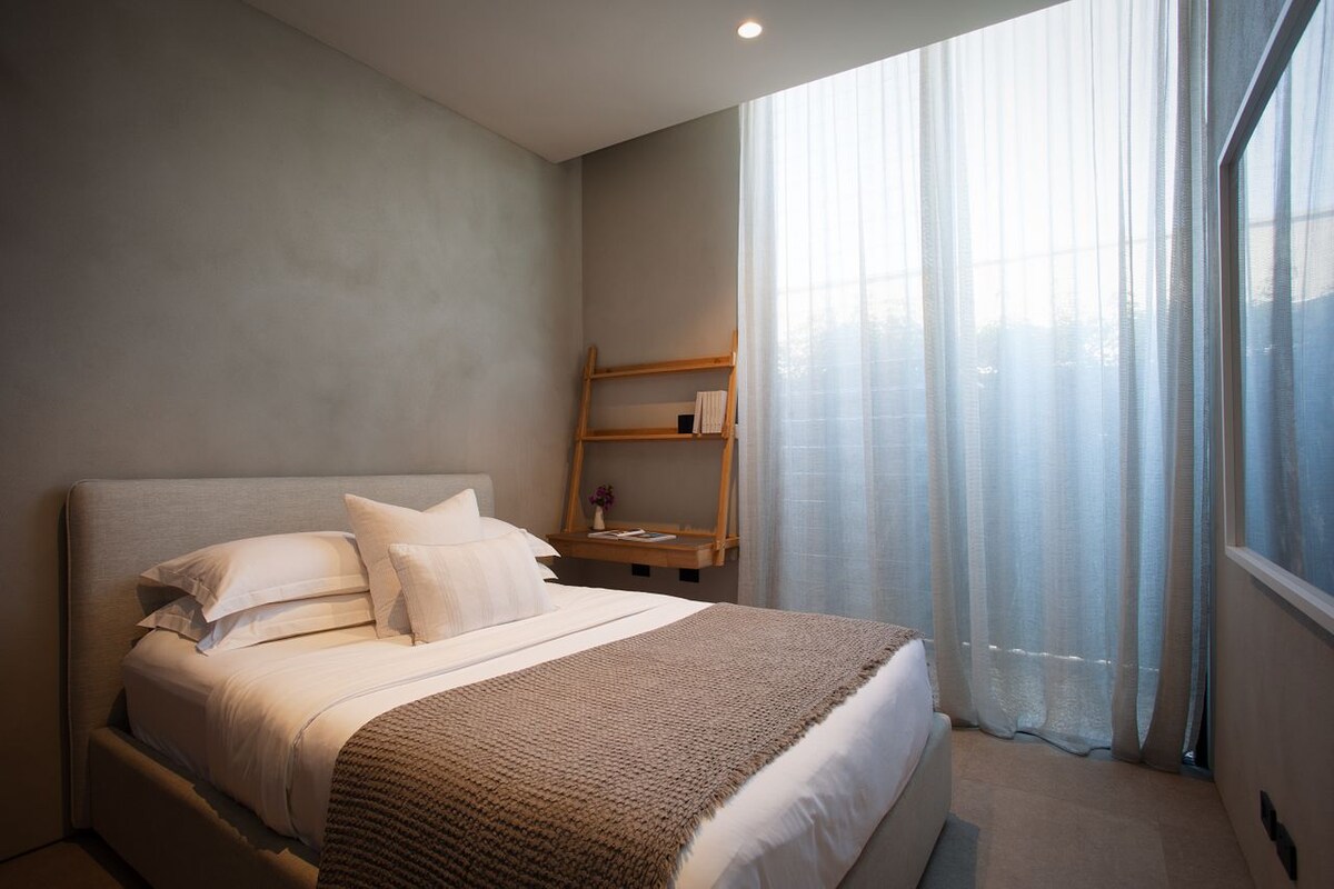 The modern bedrooms in this home are a flawless example of ambient lighting paired with raw materials. Concrete walls are softened with voile curtains, mirrors, and greyscale modern art, creating a cool, calm, and contemporary aesthetic—perfect for a restful escape. The master bedroom also features an ensuite for total privacy. Two family bathrooms along with a powder room complete this home’s setup. The first is the master ensuite resplendent in Italian porcelain tiles, with a floating stone double vanity, a walk-in shower with a floating stone bench seat and the luxurious option of a steam shower, and a deep freestanding bathtub. The second bathroom is a spa-like retreat, featuring chic tiling, a modern shower and a freestanding stone basin.
