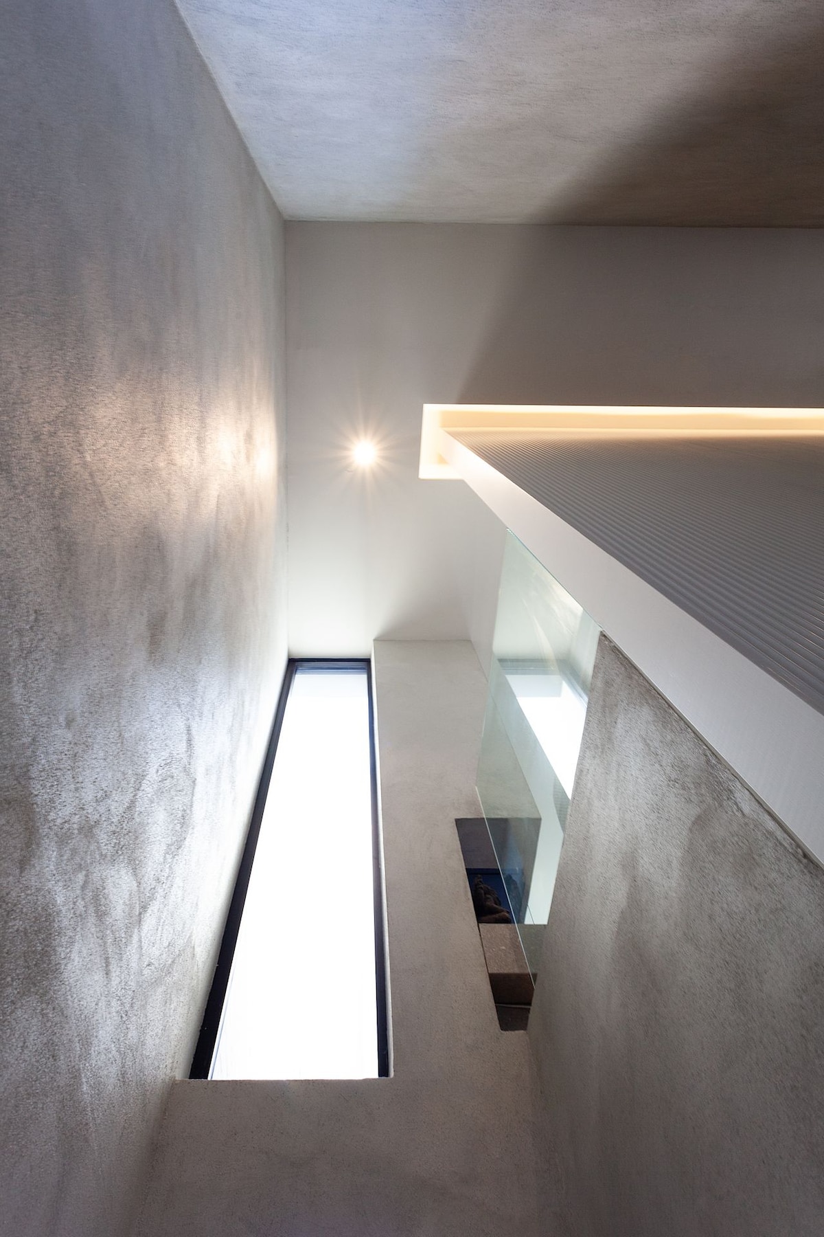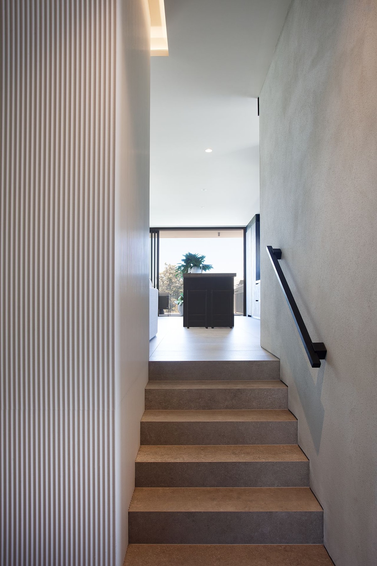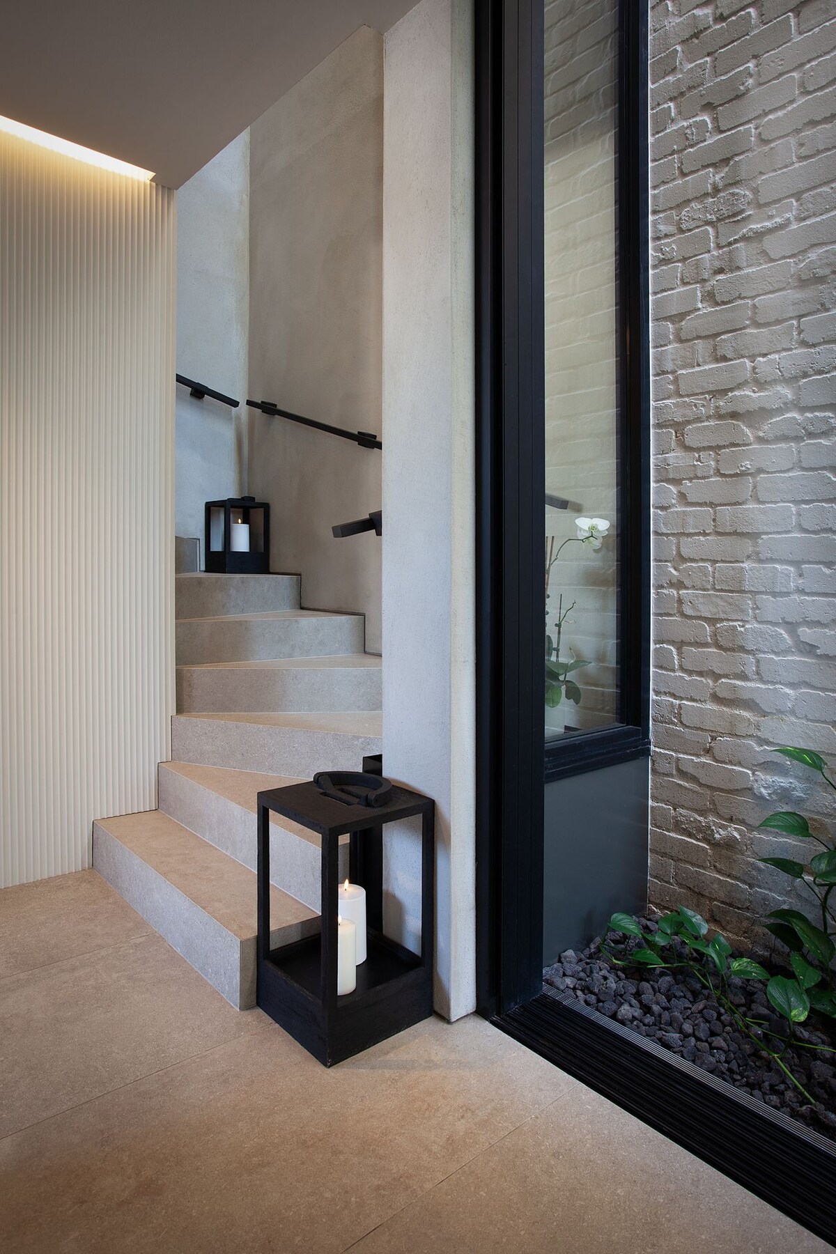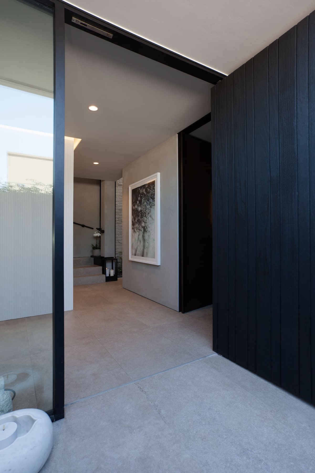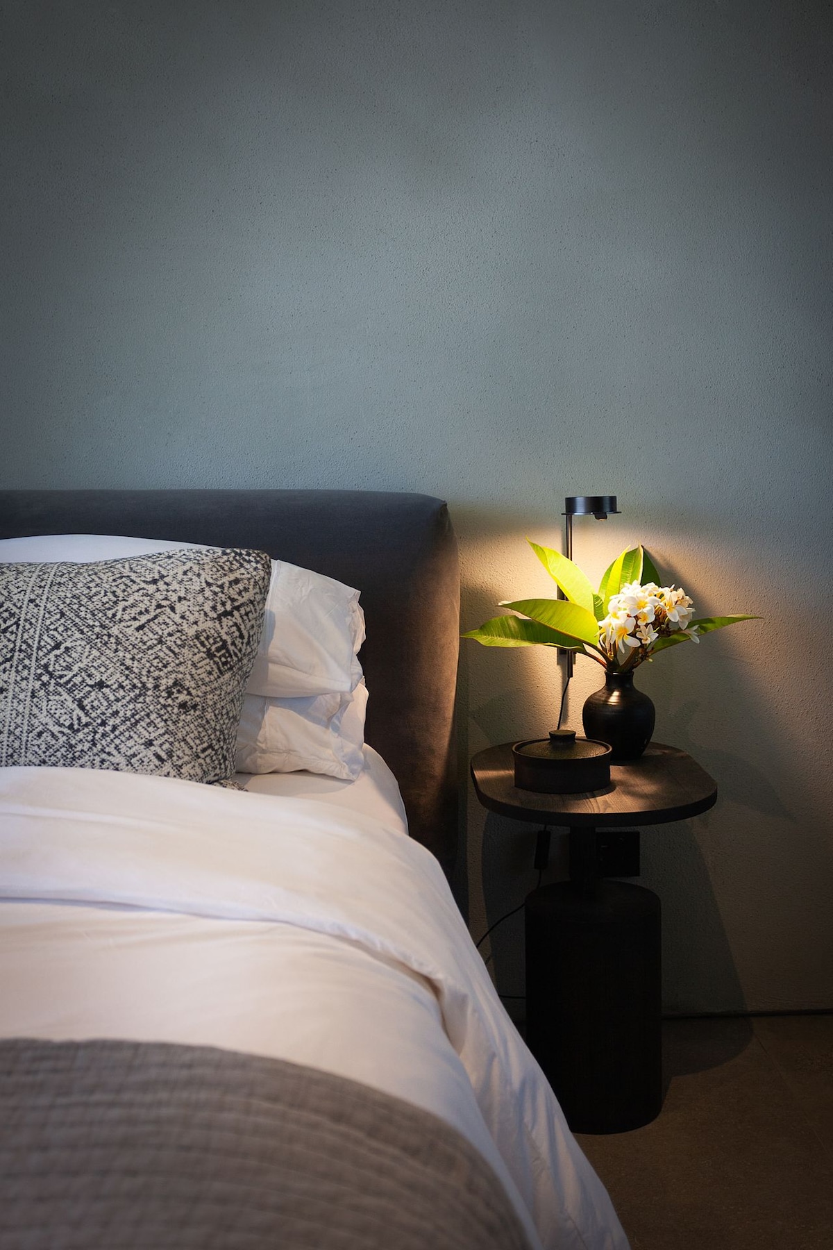 The modern bedrooms in this home are a flawless example of ambient lighting paired with raw materials. Concrete walls are softened with voile curtains, mirrors, and greyscale modern art, creating a cool, calm, and contemporary aesthetic—perfect for a restful escape. The master bedroom also features an ensuite for total privacy. Two family bathrooms along with a powder room complete this home’s setup. The first is the master ensuite resplendent in Italian porcelain tiles, with a floating stone double vanity, a walk-in shower with a floating stone bench seat and the luxurious option of a steam shower, and a deep freestanding bathtub. The second bathroom is a spa-like retreat, featuring chic tiling, a modern shower and a freestanding stone basin.