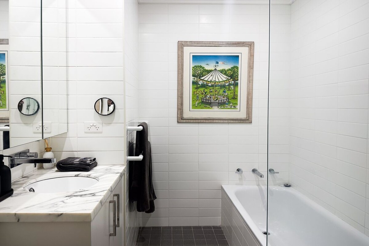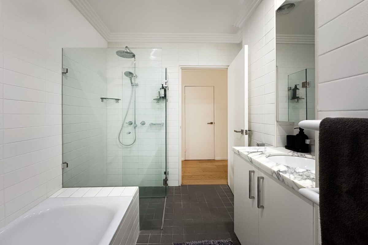 The apartment features a light-filled open-plan living, kitchen, and dining area, designed for both relaxation and functionality. A split-system airconditioning unit in the dining area provides heating and cooling, ensuring year-round comfort. Additional features include an in-unit washer and dryer and secure garage parking, making it a practical choice for extended stays. The queen bedroom is a serene escape, complete with a ceiling fan and a portable fan for added comfort. The bathroom includes both a bath and shower, with the added convenience of a separate toilet.