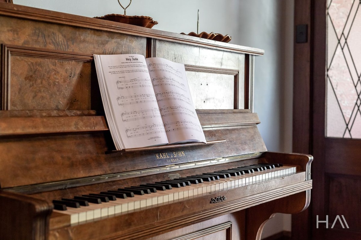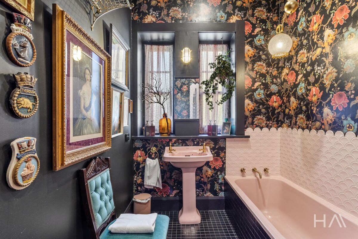 As you enter, you'll be captivated by bespoke wallpaper that adorn every nook and cranny of this home. The living room welcomes you with a cosy fireplace, setting the stage for evenings of warmth and storytelling. A piano beckons music enthusiasts to tickle the ivories and create harmonious memories.