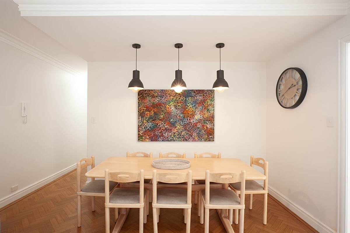 A modern scandi interior welcomes you to this bright apartment. Sunlight floods the living room, bouncing off the stylish pine dining table, with room for up to 8, and a contemporary corner sofa is a perfect place to kick back and watch TV. Fabulous parquet floors lead you through the apartment, into the modern kitchen, where you can cook up a storm. There are 3 good sized bedrooms. For hot summer days, a bright private balcony boasts soft seating and a bistro style dining area, for a charming and colourful casual space.