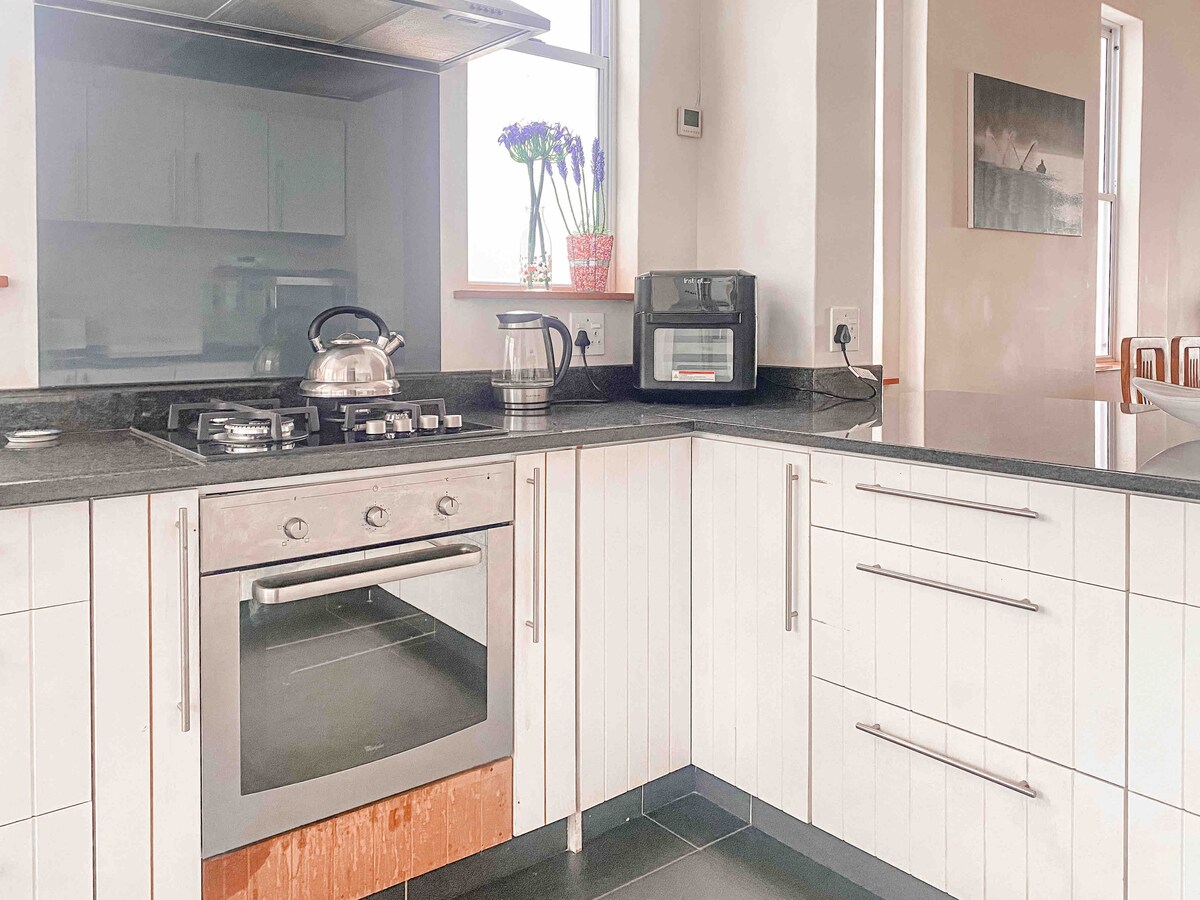 Celebrating a special occasion? We love to help you celebrate so reach out via message and we can help with the arrangements. We've done birthdays, anniversaries and even a cute proposal.Nestled on the mountain in Simon's Town, this picturesque 2-bedroom home boasts breath-taking views of the vast False Bay and bustling Simons Town harbour. The open-plan design seamlessly blends a spacious living area with a fully-equipped, modern kitchen, creating the perfect environment for intimate dinners and hearty conversations.