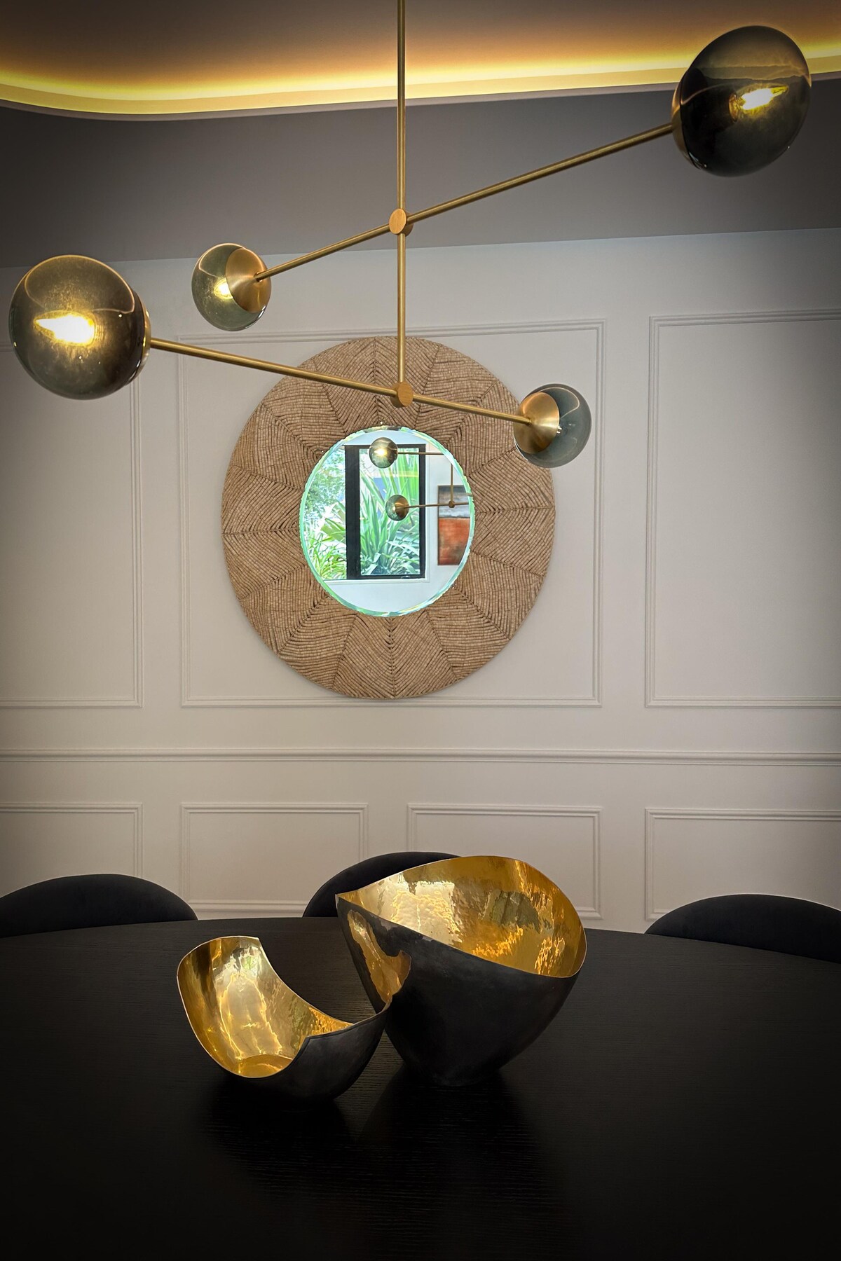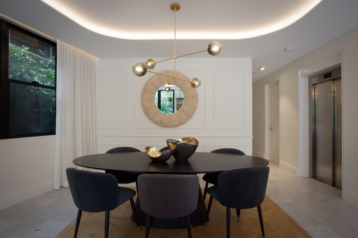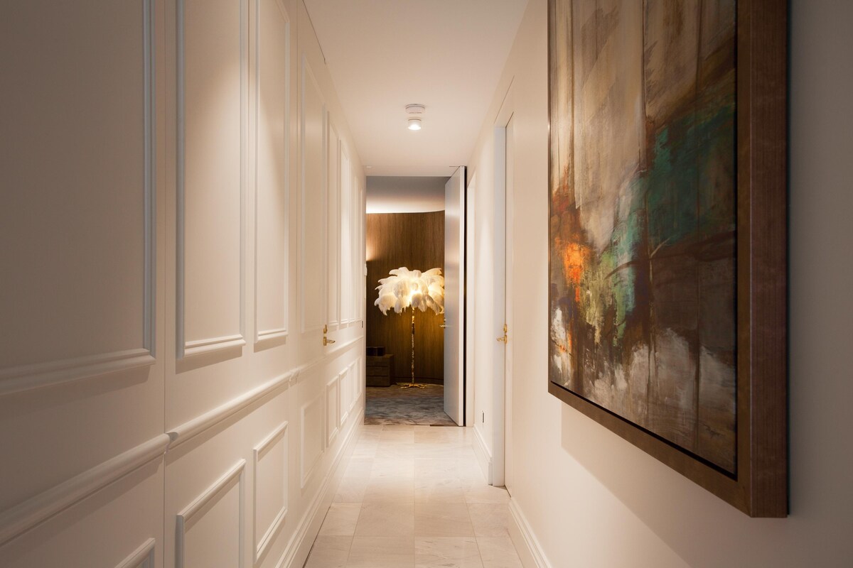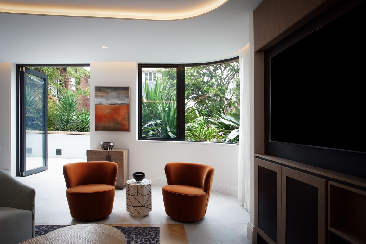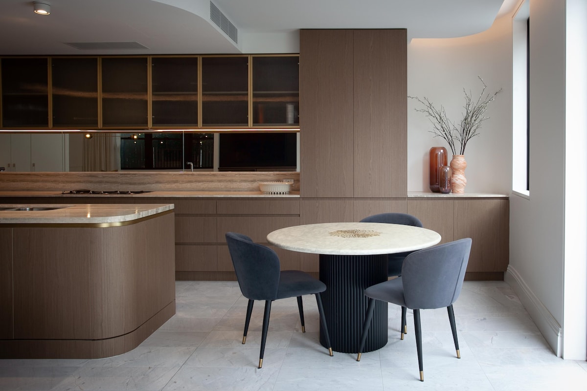 The heart of this upscale residence beats in the expansive open-plan living area, where curved walls create a sense of fluidity and modernity. The ambient space unfolds into a magnificent living room adorned with perfectly curated furnishing. Think orange cocktail chairs around a wall-mounted entertainment system, inviting you to unwind in sheer comfort. Beyond the living area, a formal dining table for six overlooks the sleek kitchen. The culinary connoisseur will delight in the fully equipped kitchen, boasting two ovens, including a conventional option, a gas hob top, and a convenient wine fridge. For warmer days, spill onto the private terrace, the perfect place to unwind with a cool glass of wine.