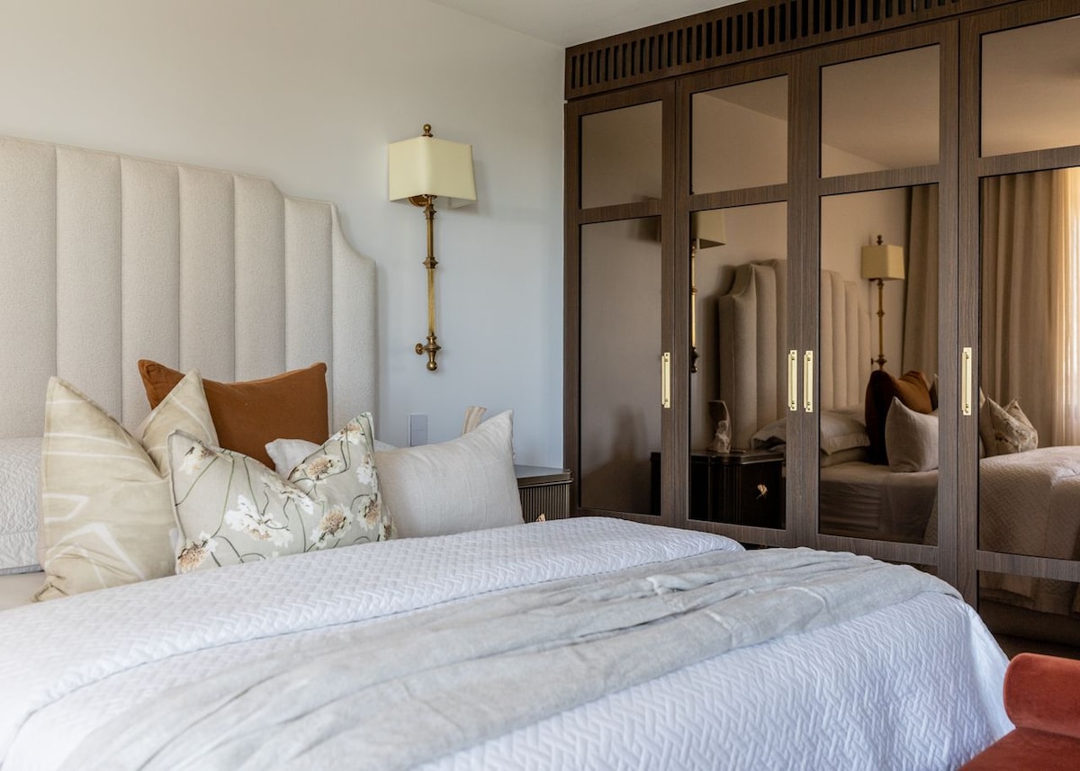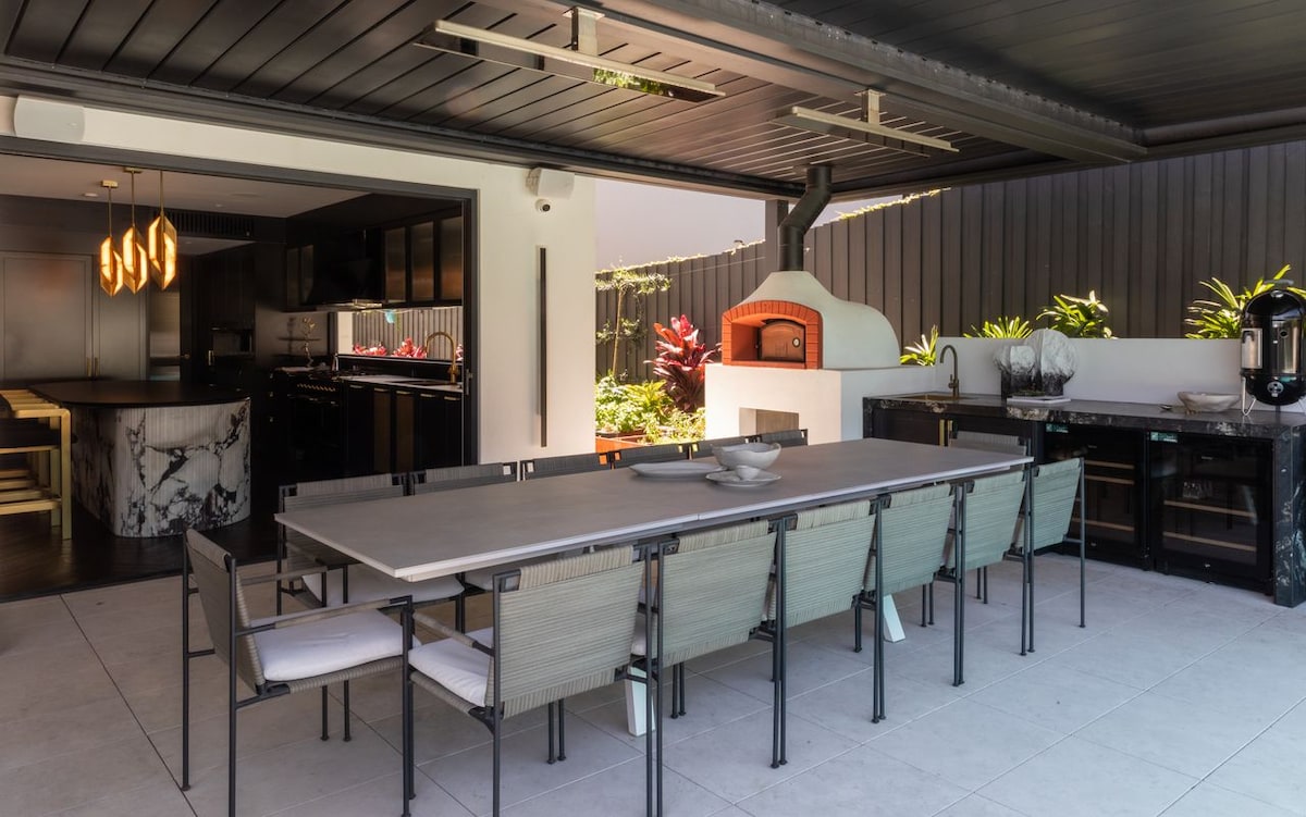 Dine at your choice of formal dining table—indoors or on the shaded terrace. For brunch, take advantage of the fully equipped kitchen with Smeg appliances and spacious butlers pantry. At the end of the day, retreat to one of the sumptuously decorated lounges or indulge in a film on the big screen in the cinema room. The five glorious bedrooms in this home are dripping in style, sophistication, and comfort. The master suite on the first floor features a magnificent king-sized bed and an immaculate ensuite bathroom for your exclusive use. There are three additional opulently designed double bedrooms on this level, each showcasing dramatic headboards, stunning décor, and fabulous views. The final bedroom is located on the ground floor offering the perfect guest suite with an en-suite bathroom. There is also a playful rumpus room perfect for keeping the younger members of the group entertained.