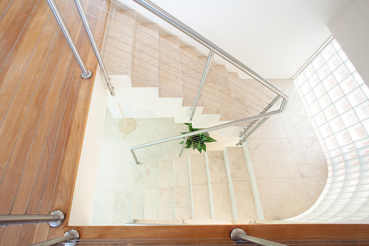 - This home is set across 4 levels accessed via flights of wooden stairs, approximately 16 between each level.