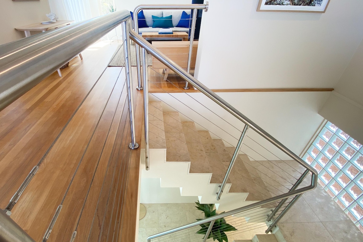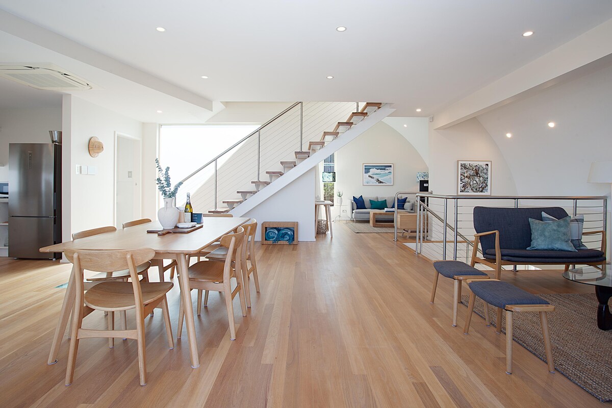 This breathtaking home is the ultimate getaway. The ground floor offers the best in open plan living. Clever zoning separates the living, dining and kitchen, whilst a calming neutral palette connects the space. Iconic scandi chairs surround the formal dining table, and you have a choice of spaces to relax and chat. From this floor, you have access to your spacious balcony, with alfresco dining and stunning ocean views.
