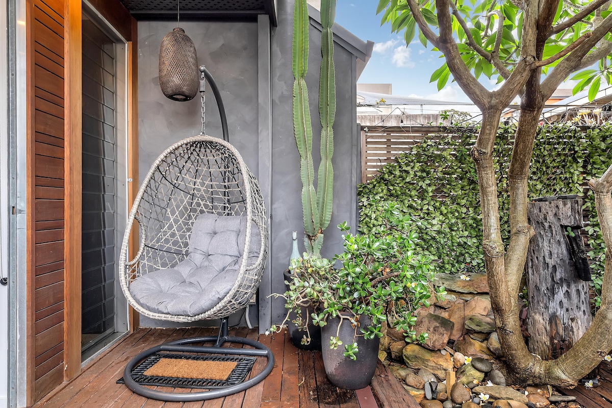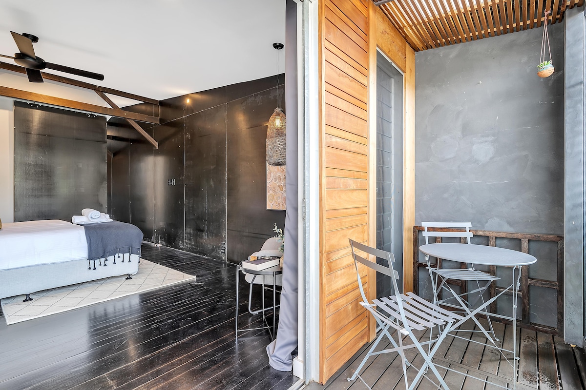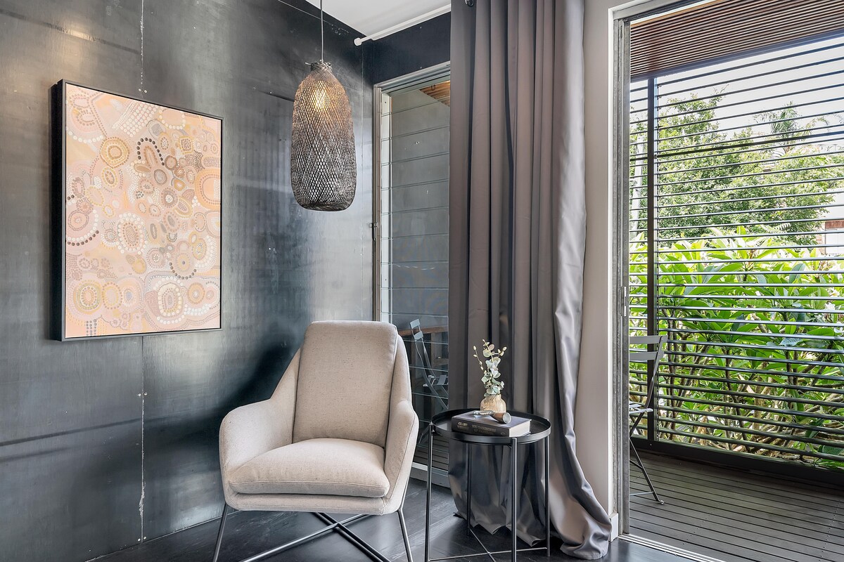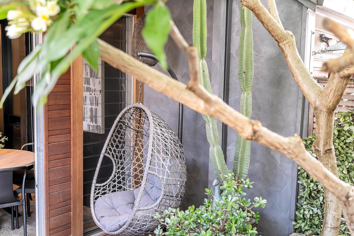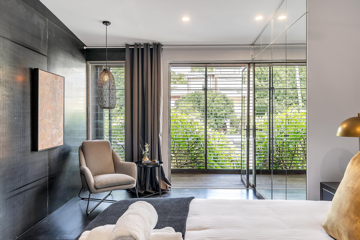 Edgy black walls and atmospheric polished concrete floors lead to the large open-plan living and dining area, where the industrial finish of this 2-storey home is softened by the natural views of your private sunny courtyard garden. Boasting two seating areas centred around a stunning frangipani tree, this is the perfect place to enjoy your morning coffee or a few sundowners on a warm afternoon after a long day of exploring!