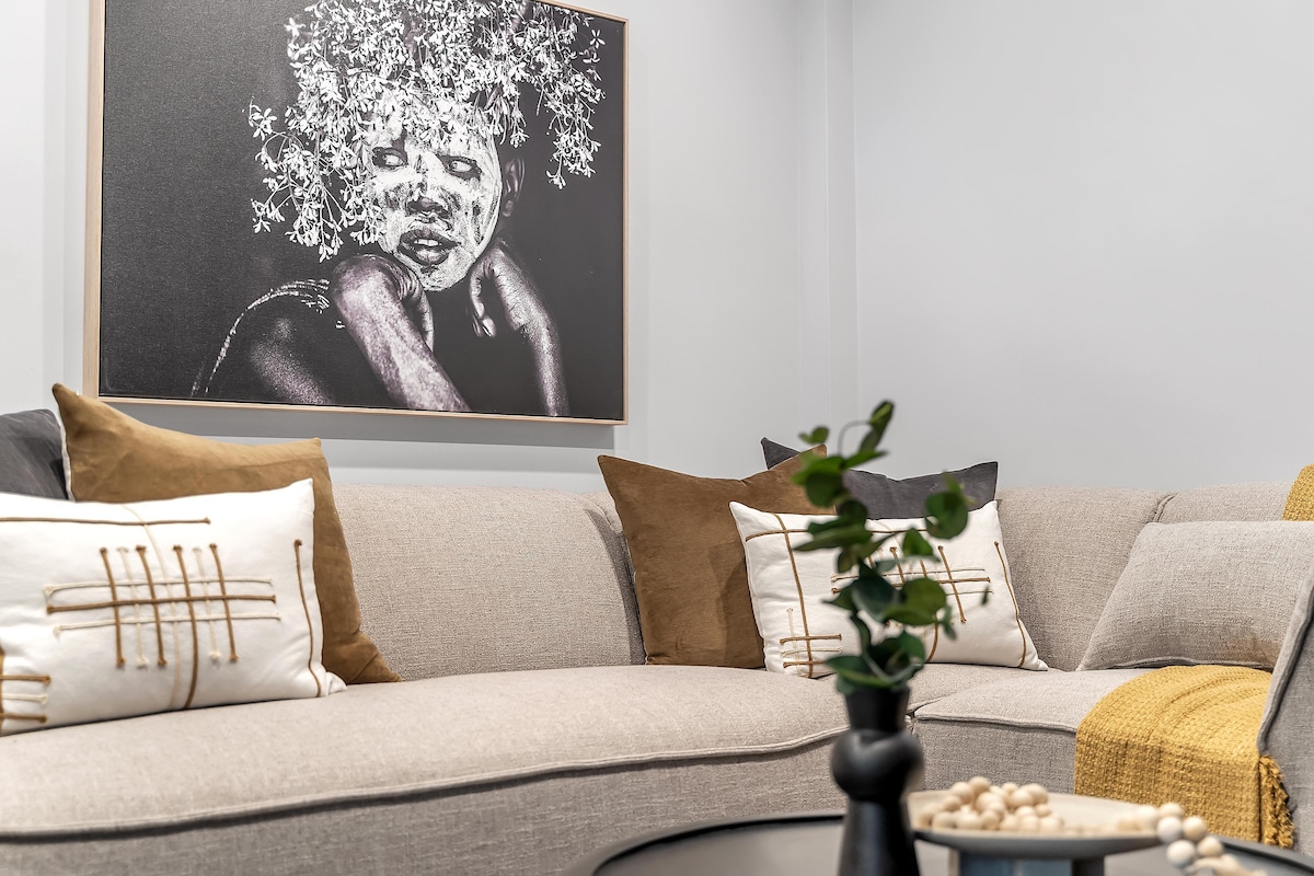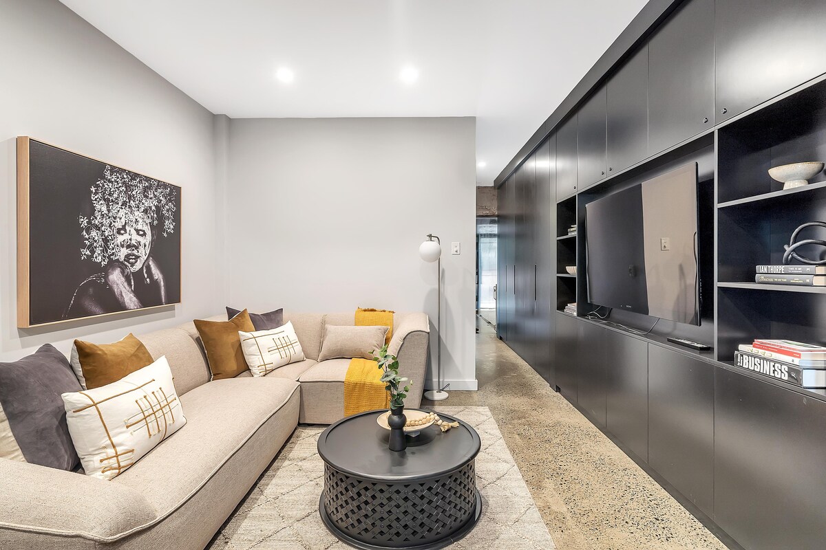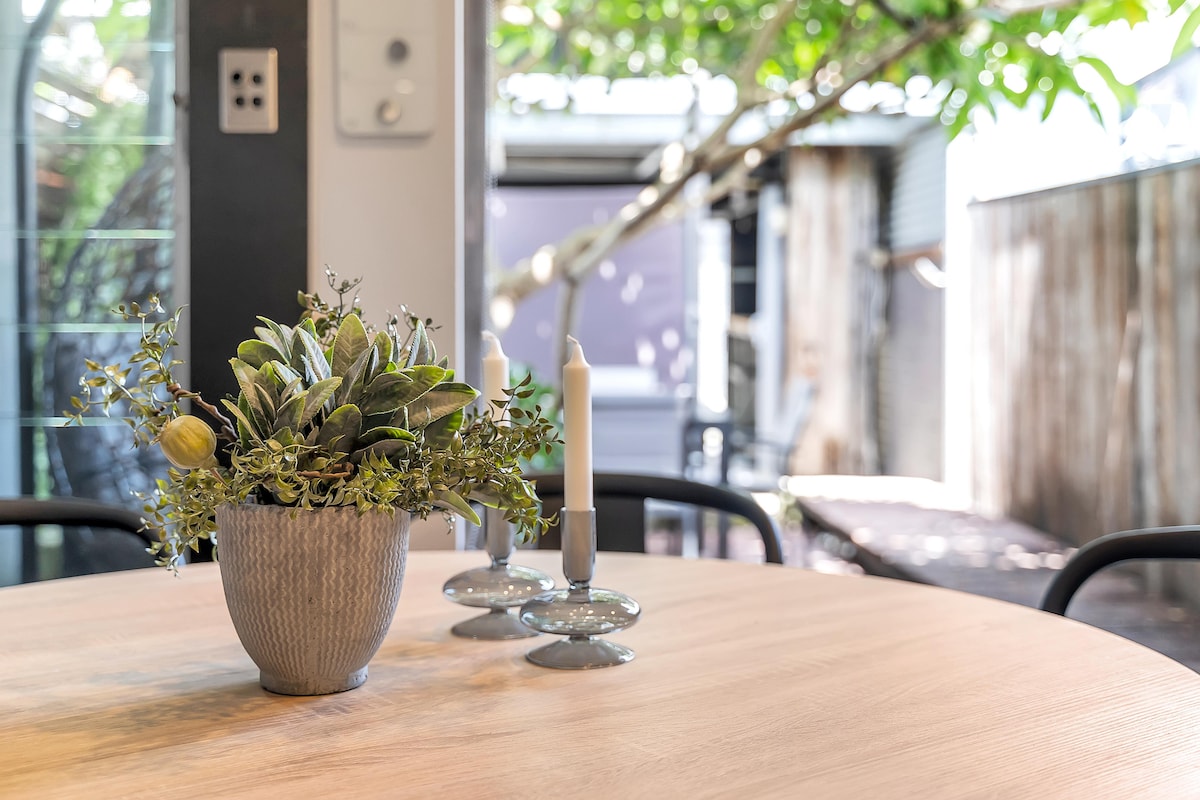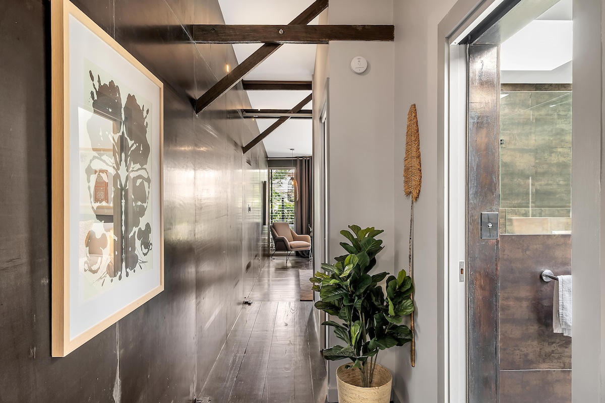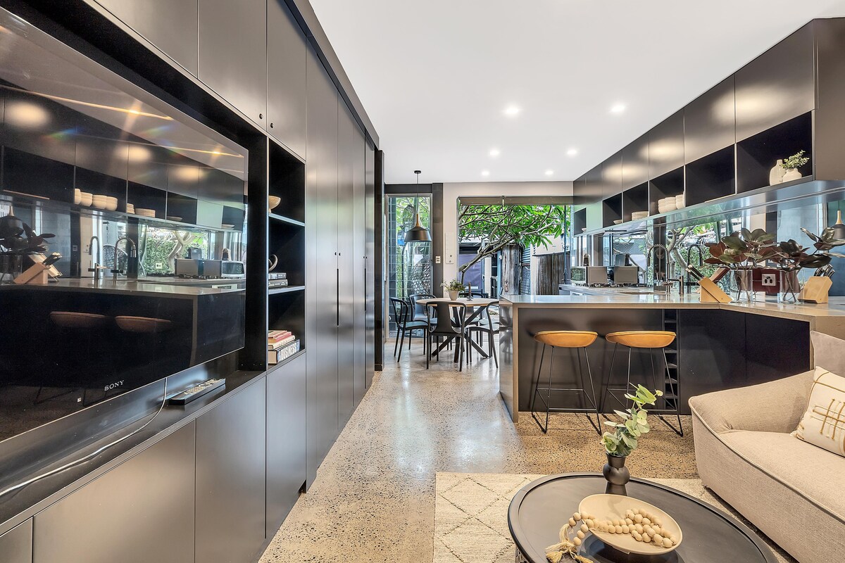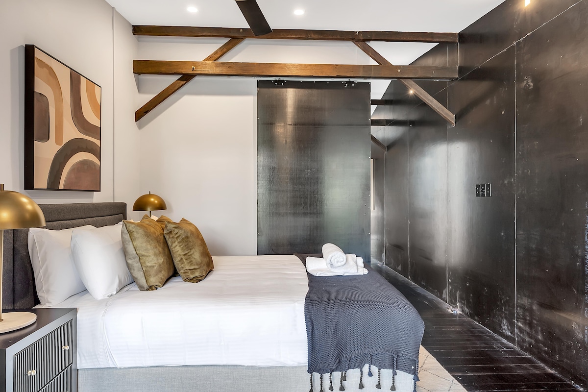 Edgy black walls and atmospheric polished concrete floors lead to the large open-plan living and dining area, where the industrial finish of this 2-storey home is softened by the natural views of your private sunny courtyard garden. Boasting two seating areas centred around a stunning frangipani tree, this is the perfect place to enjoy your morning coffee or a few sundowners on a warm afternoon after a long day of exploring!