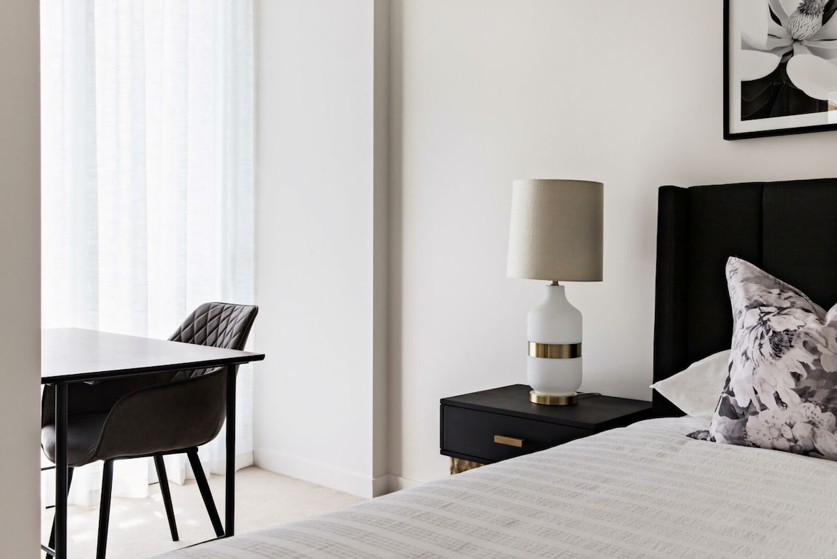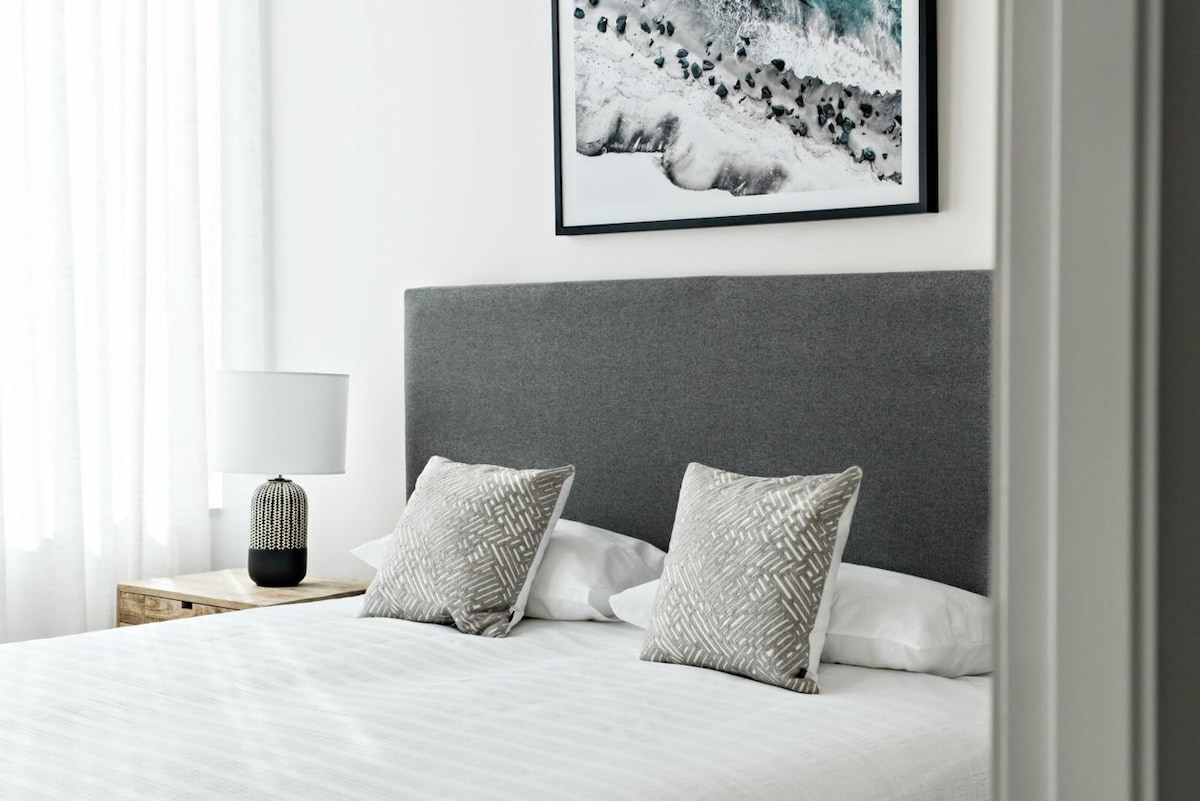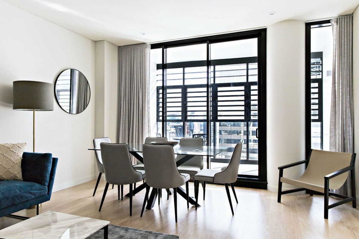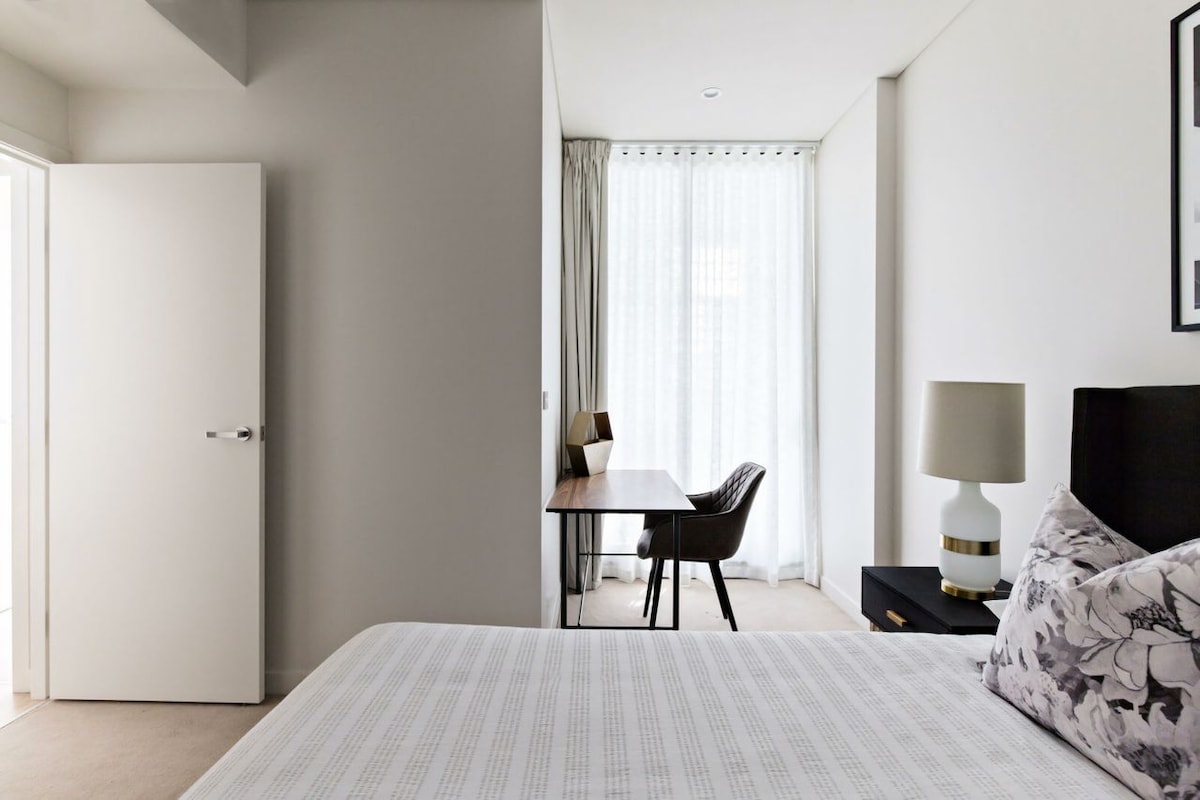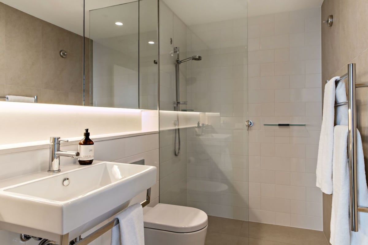 Modern panelling skillfully conceals the kitchen in the open-plan living space that makes up the heart of this home. Soft lighting, crisp white walls and floor-to-ceiling windows create a light and comfortable space, perfect for relaxing after a long day exploring Sydney. You'll have all the space you need, as there are two full bedrooms each with their own bathroom, for your convenience in the mornings!
