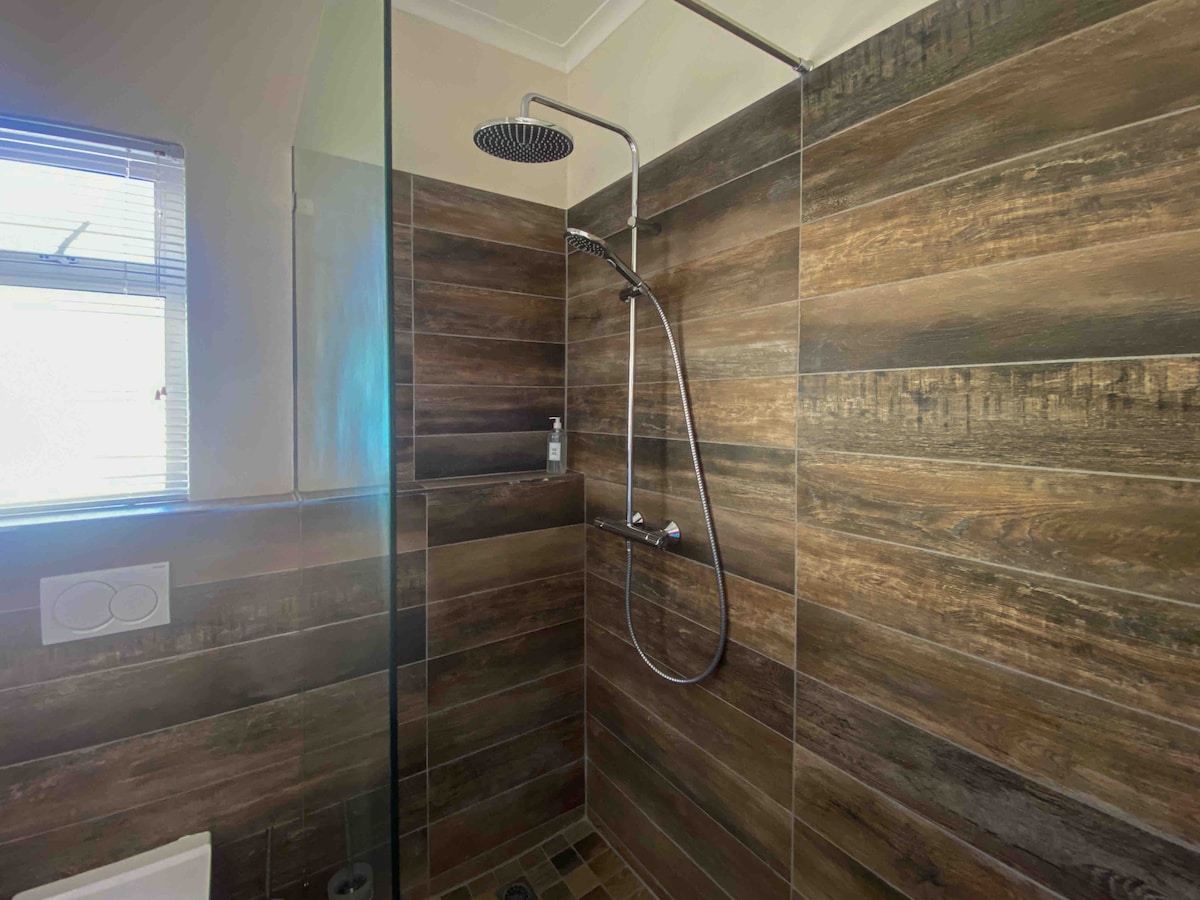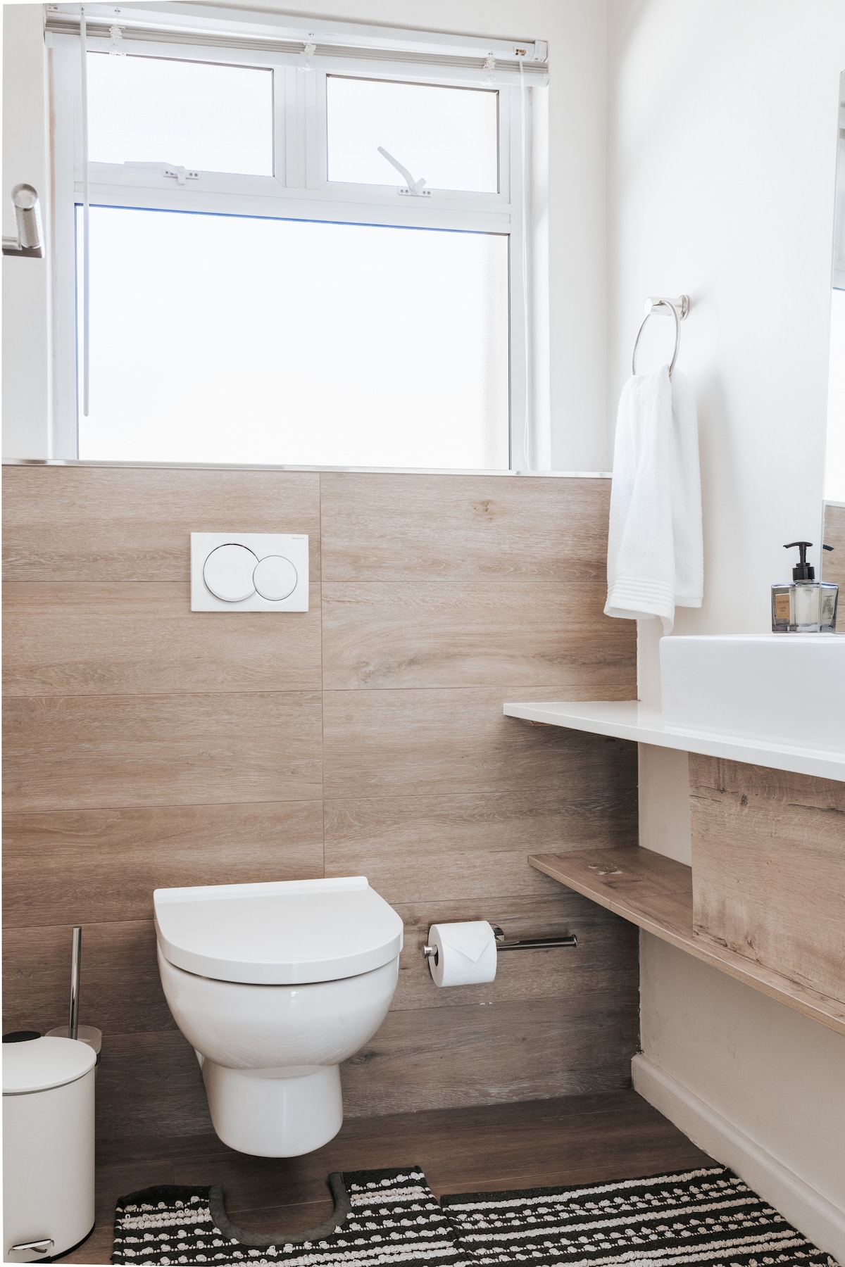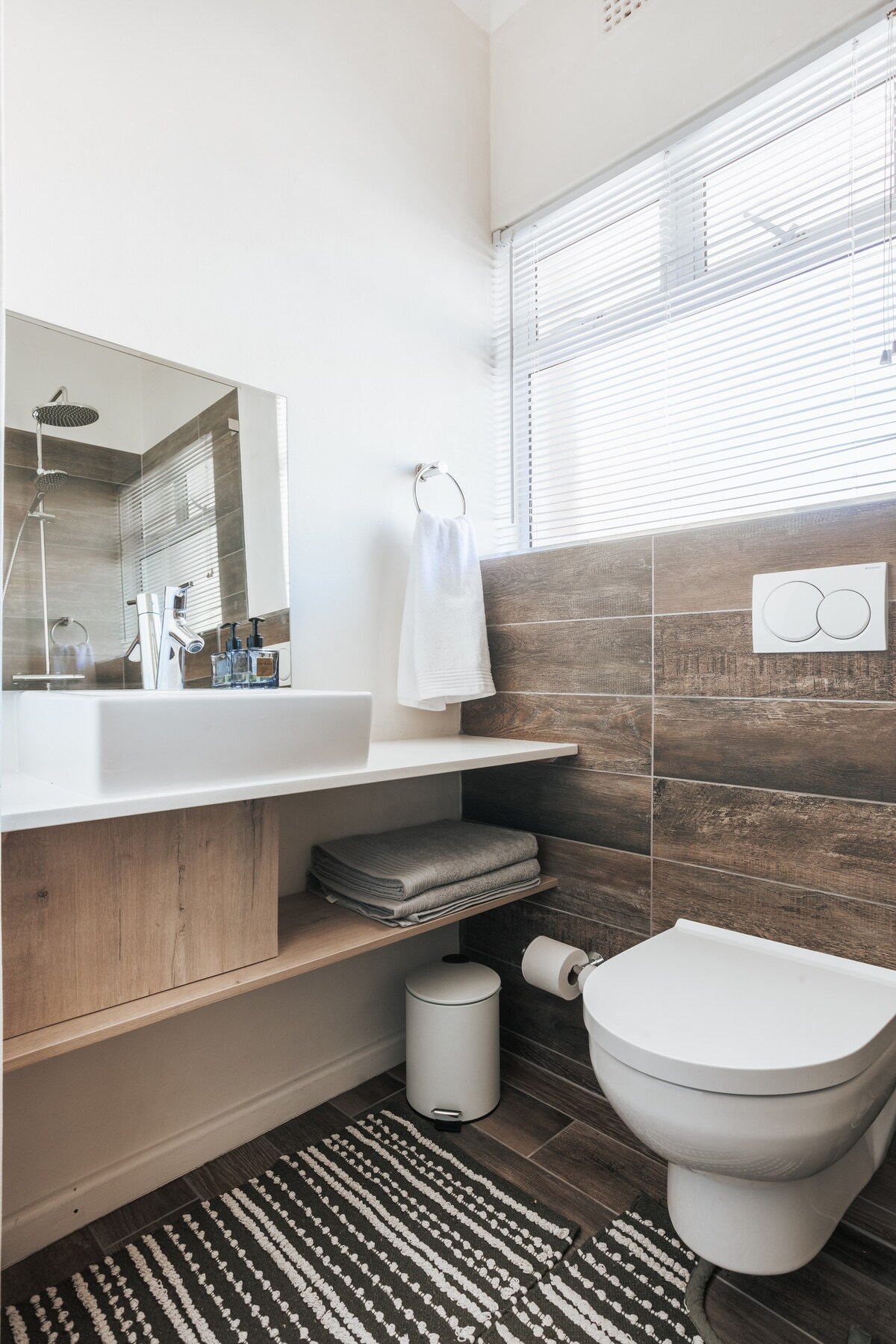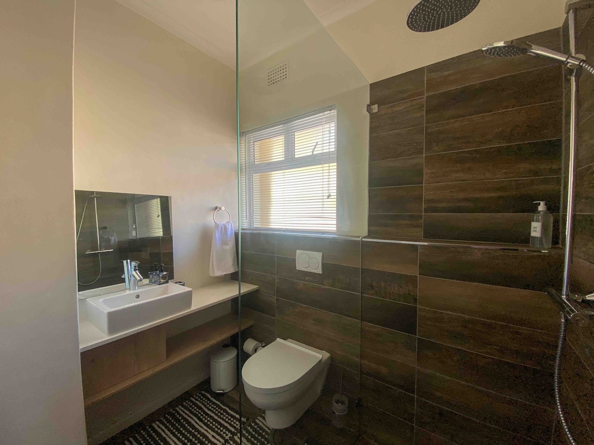 The bathroom is modern and spacious, with a rain shower, toilet, and sink, as well as plenty of space for your toiletries. There is also a guest toilet.
