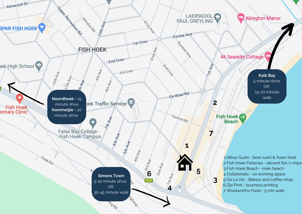 Finally, this apartment is located just 150m from Fish Hoek beach, making it the perfect location for beach lovers. It's also very central to surfing hot spots like Muizenberg and Kommetjie or Noordhoek. There are plenty of shops, cafes, and restaurants nearby, so you'll never be far from everything you need.