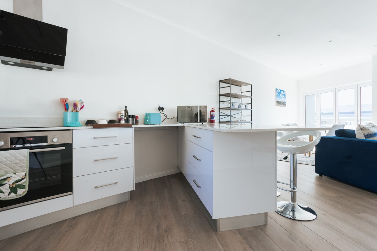The open-plan living area is flooded with natural light, thanks to the large stacking doors and windows that stretch across the room. The comfortable lounge area features a plush couch & armchair, perfect for relaxing after a long day at the beach. The dining area is adjacent, with a stylish table and chairs that can comfortably seat four people. We have also recently added an awesome selection of board games: perfect for those chilly evenings in. There is also an oil heater which can be wheeled around as needed.