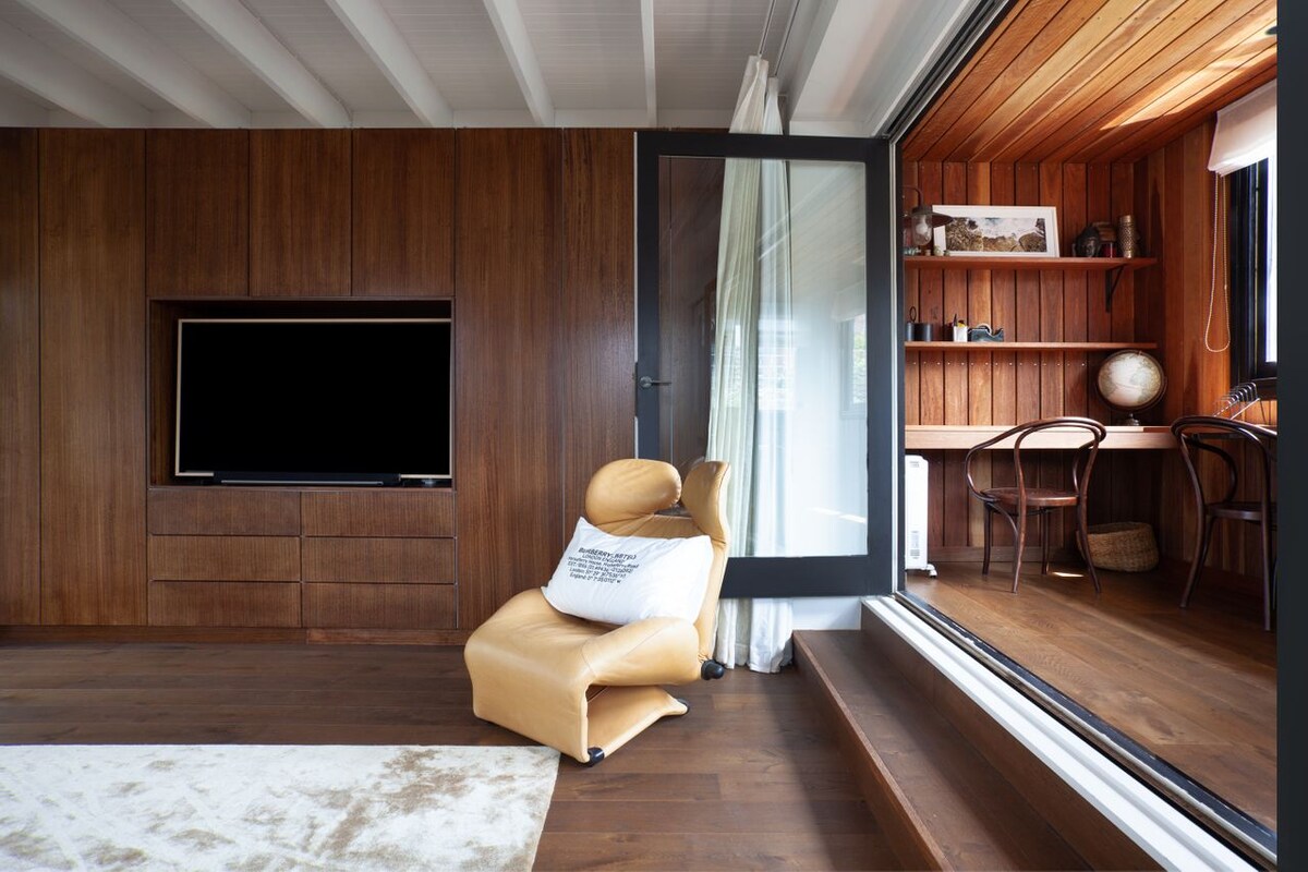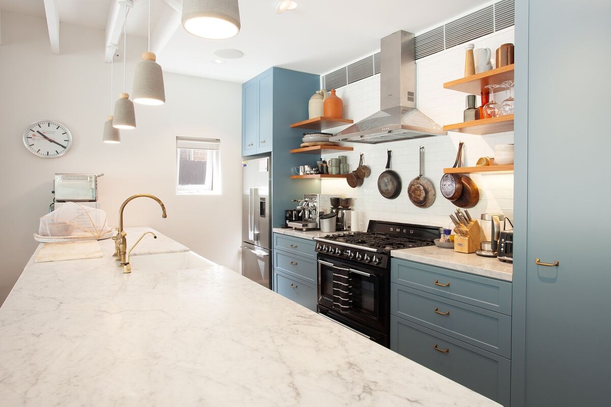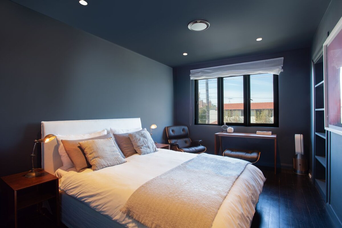 Whatever your group size, the bedroom arrangements don’t disappoint. The master on the top floor is a sanctuary in itself, housing a king bed, opposite a recessed, wall-mounted TV. Walk-in wardrobes are cleverly concealed, and there is a separate study space converted from a balcony, partitioned to the side. You can also access a private ensuite with a full bathtub and shower. The second bedroom on the ground floor is just as comfortable; deep blue walls cocoon a sumptuous queen bed, adding drama and elegance to your spacious room. An Eames-style chair is a designer nod next to the handy desk, and you’ve got plenty of storage with built-in wardrobes and shelves. The final bedroom also on the ground floor is a light and airy king-size bedroom that can be conveniently set up as two singles on request, with built-in shelves for belongings.