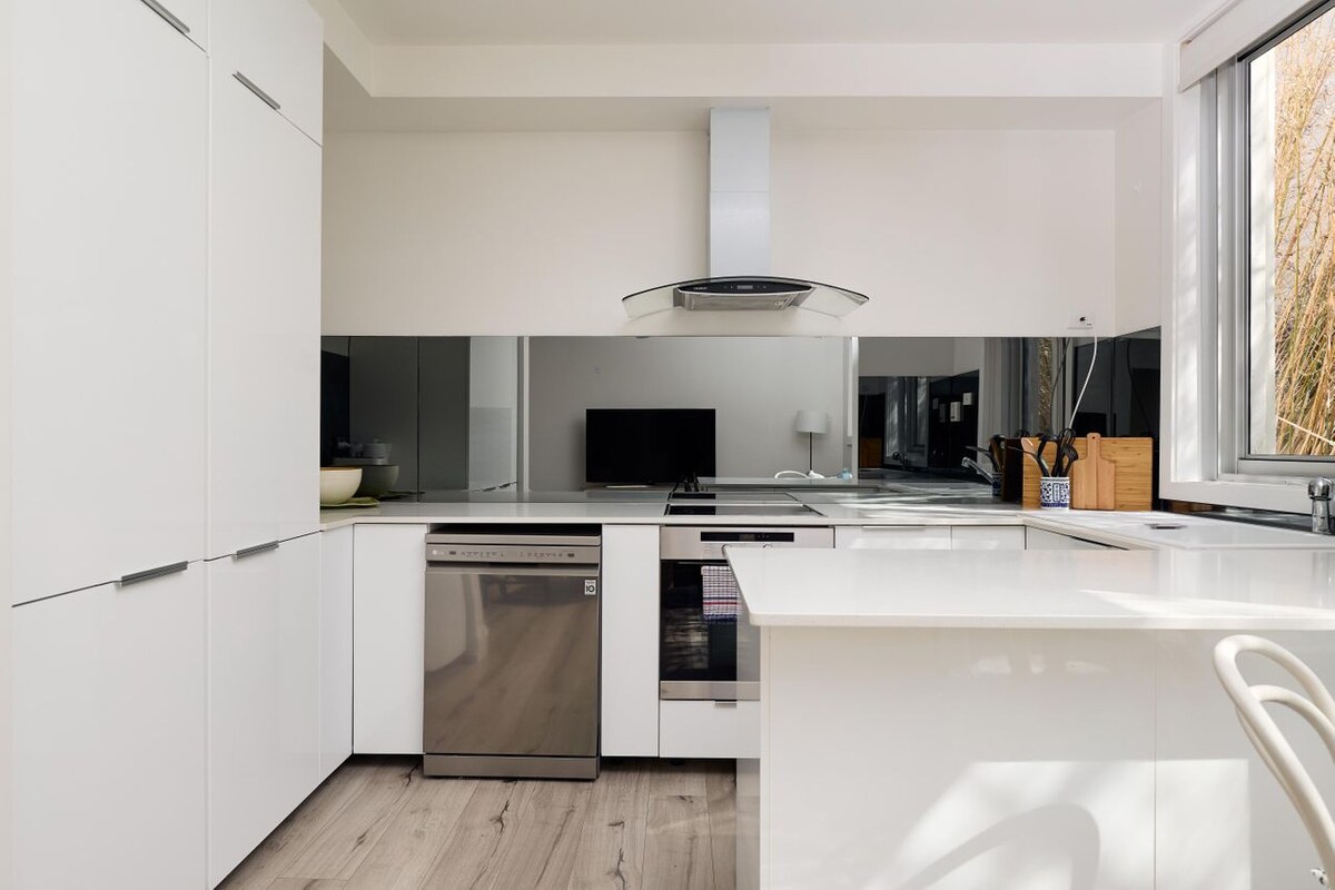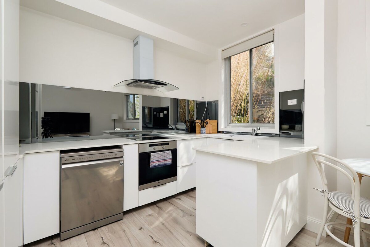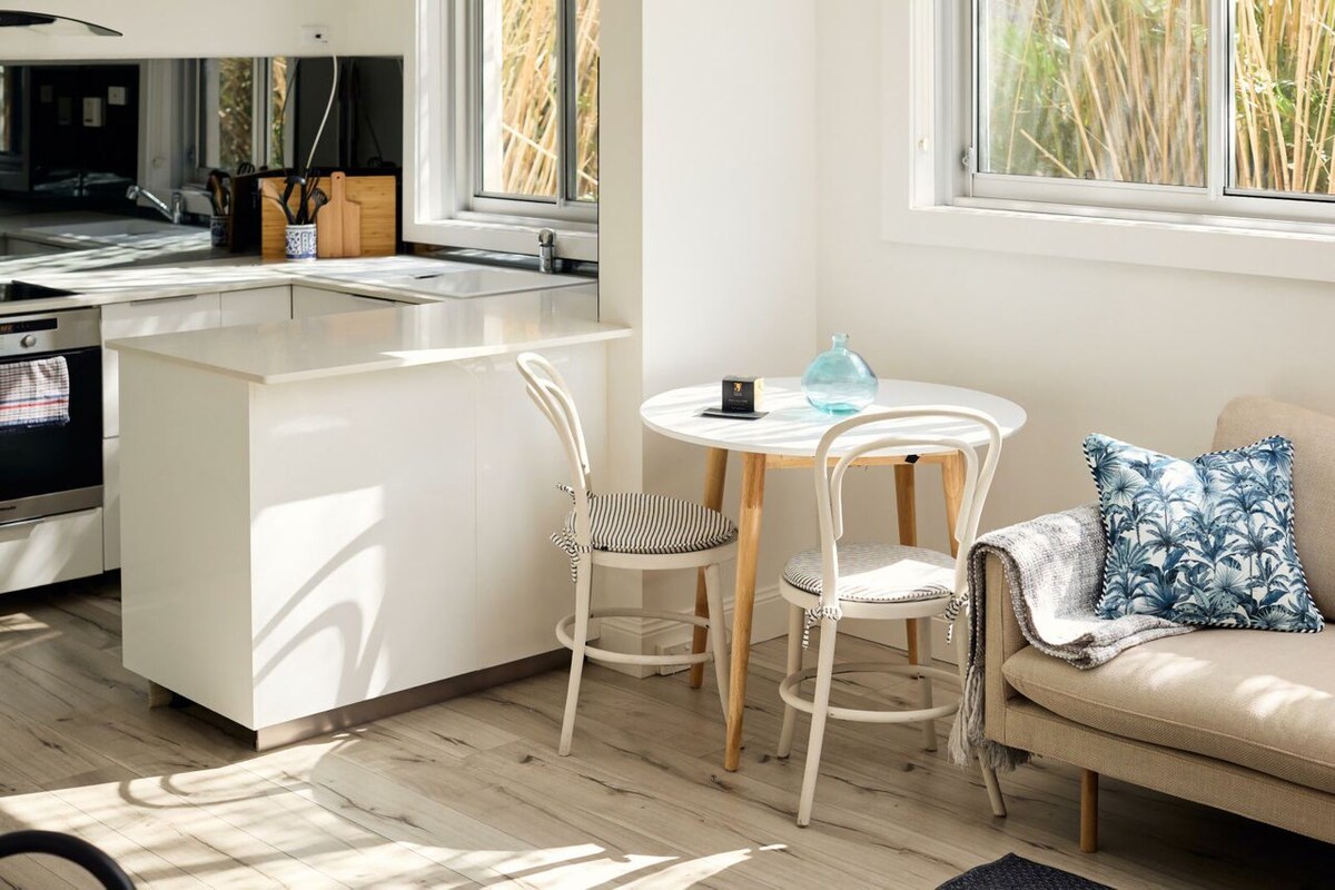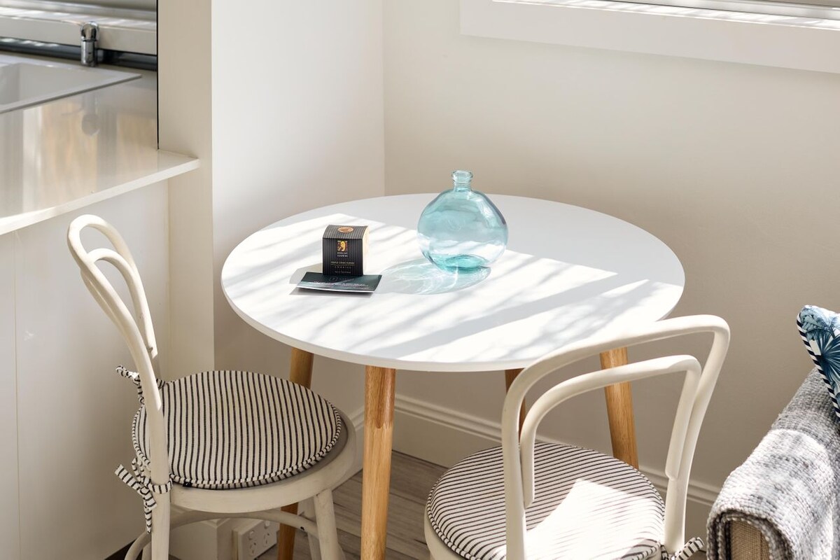 The main living space is stylishly designed in an exemplary instance of small space living. The bijous broken-plan lounge and dining area seamlessly invites you to cook, dine or chill. Large windows flood the room with natural light, and the thoughtfully chosen furnishings provide reams of effortless comfort. This space is perfect for unwinding with a book, catching up on your favourite shows, or sharing meals with loved ones.