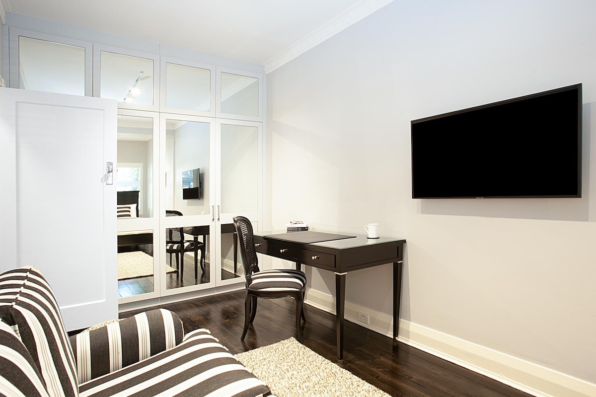 Both bedrooms feature plush queen size beds, with the main bedroom equipped with a sofa, smart TV and desk. Prepare gourmet meals in the beautiful marble kitchen and enjoy a romantic dining setting.Perfect for executive mid - longer-term stays.