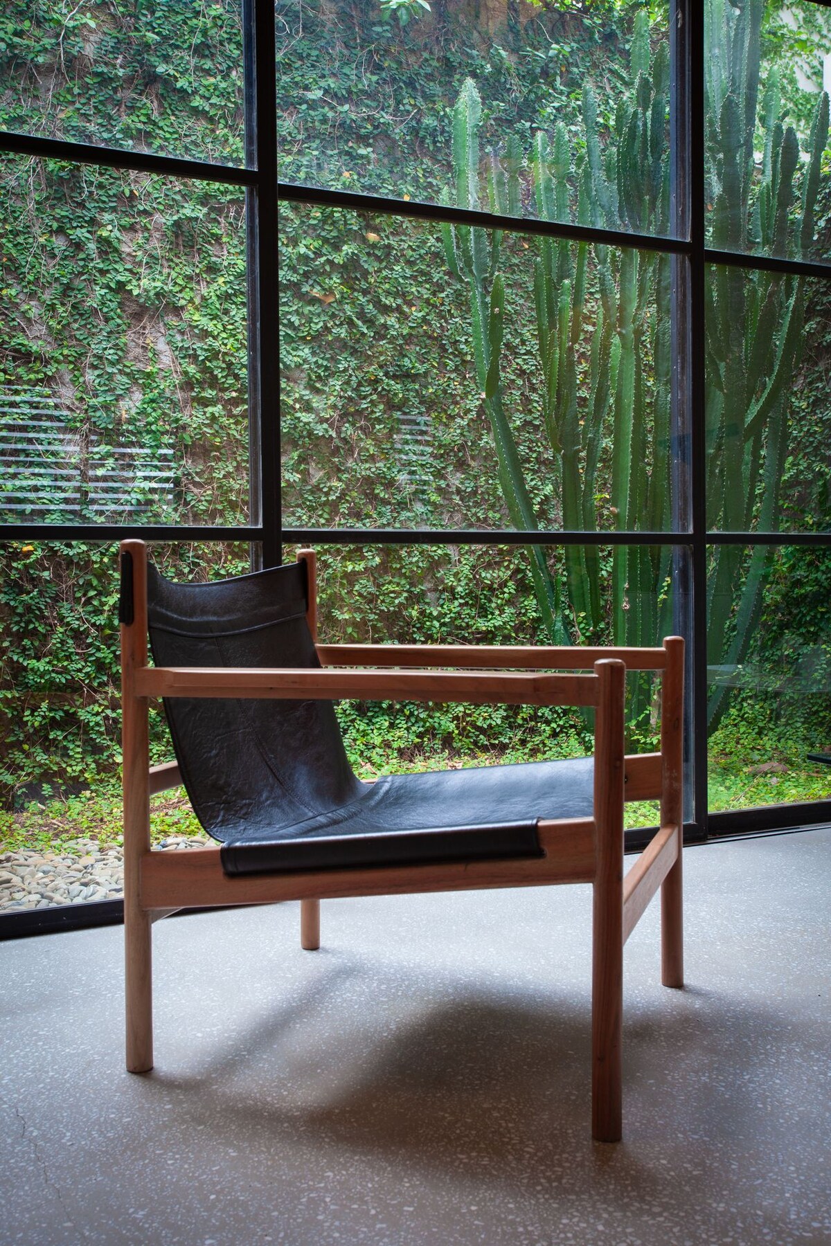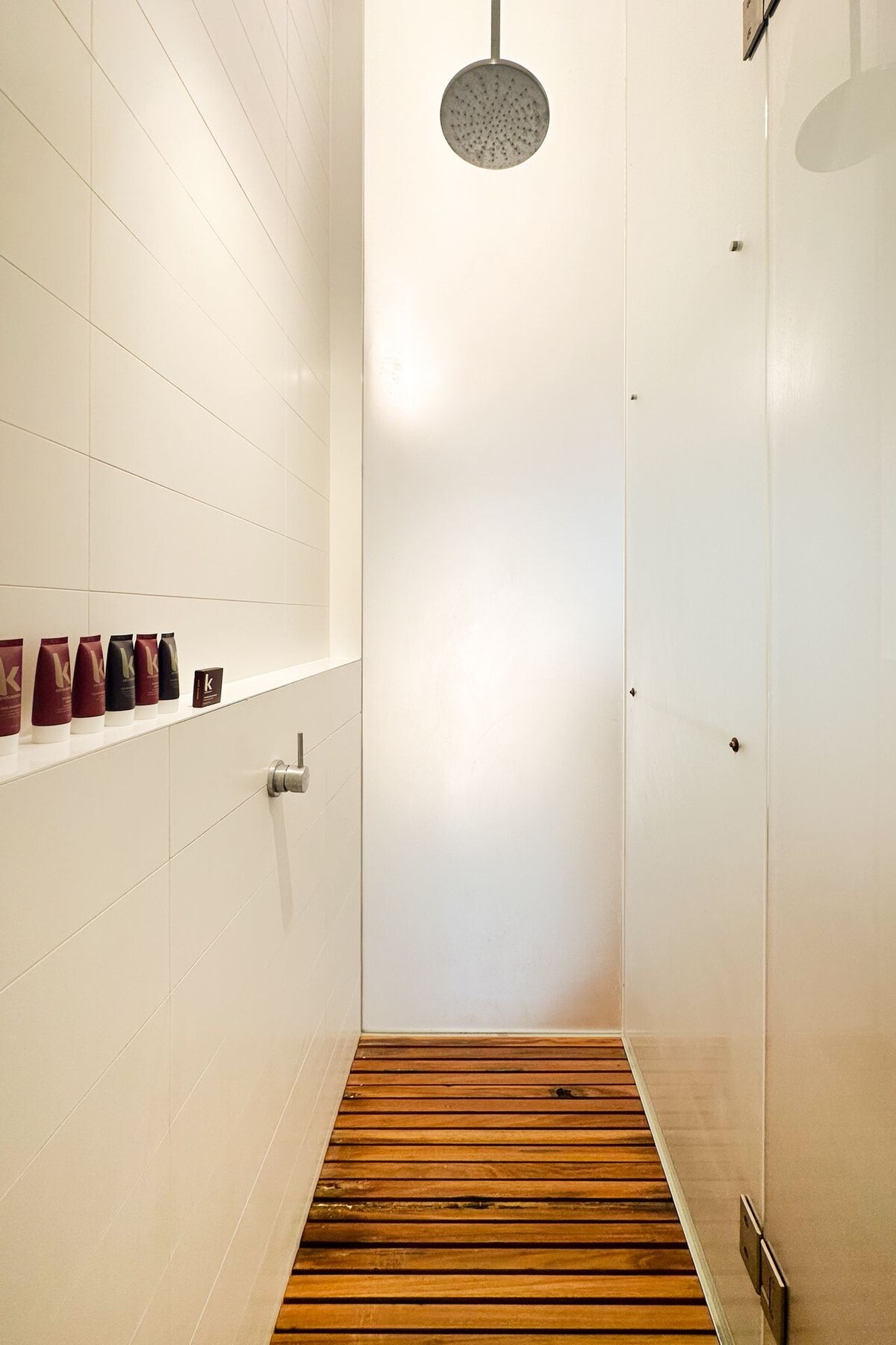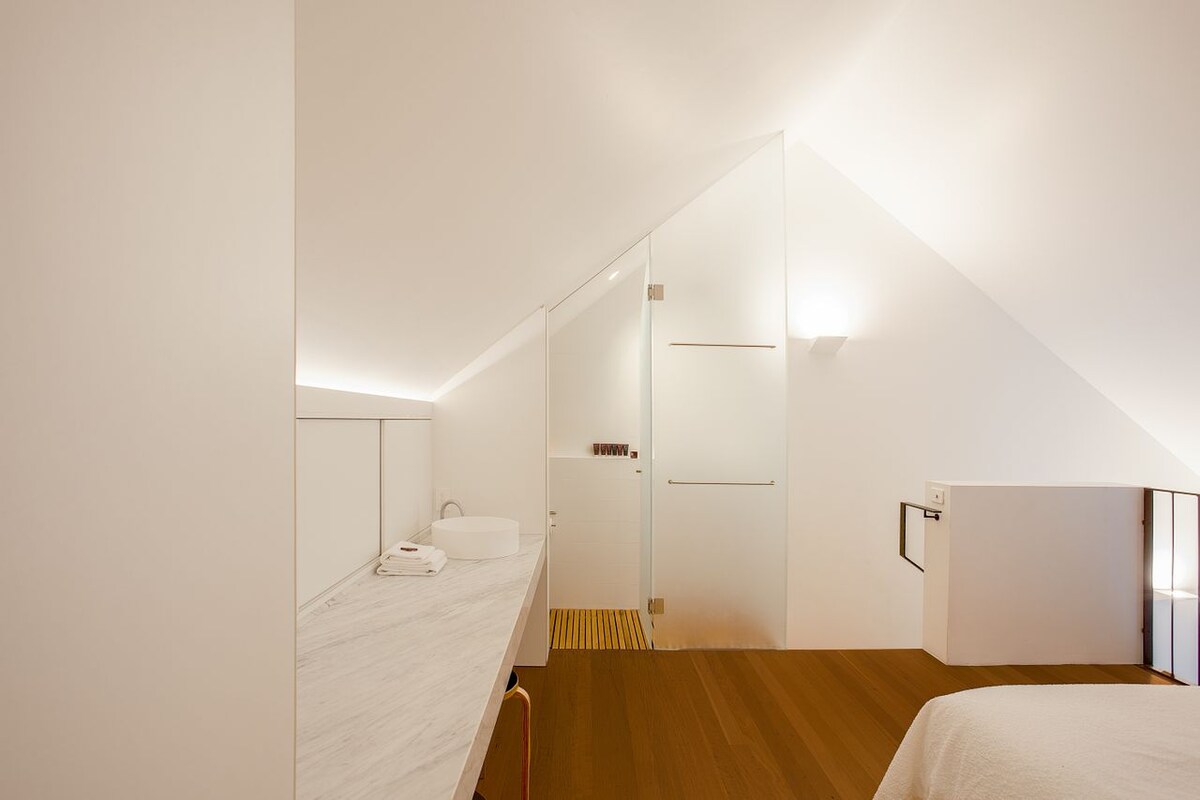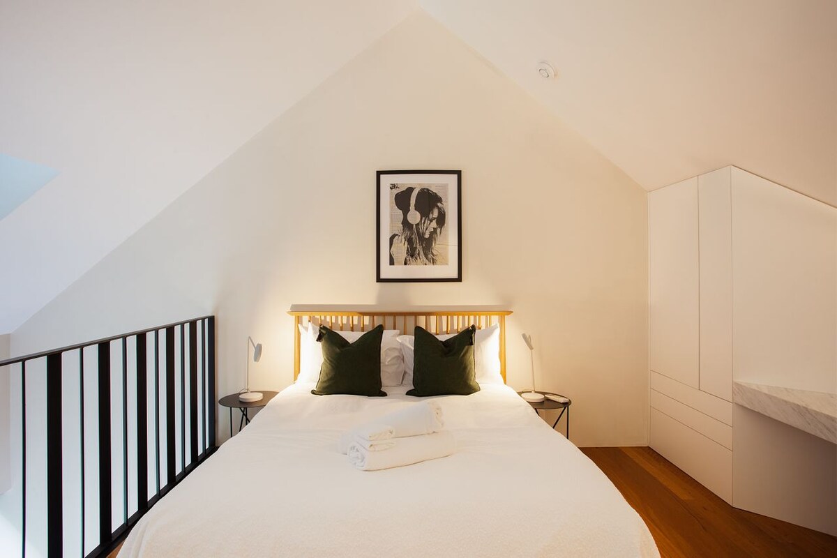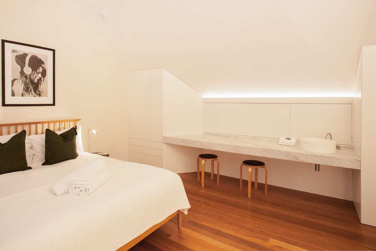 A striking feature, the minimalist stairs lead you upwards, following the black handrail until you reach the bedroom floor. A frosted glass door conceals an en suite, complete with a walk-in shower adjacent to a large built-in marble sink, which also doubles as a luxurious desk. Beyond that, a queen-size bed beckons; its pine headboard adds a Danish-inspired softness to the space, encouraging rest and relaxation.