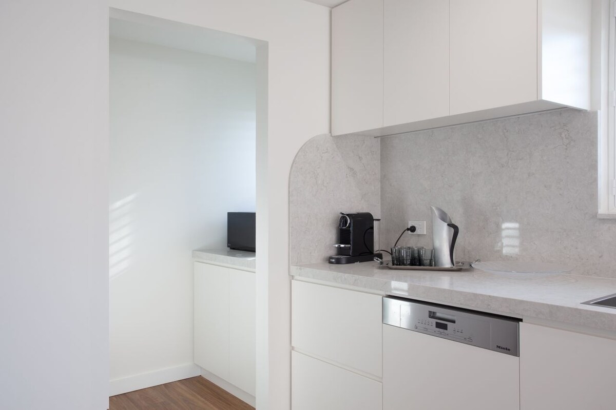 Accessed from a separate private entryway, you’ll arrive at this splendid home with an immediate sense of privacy, serenity and peace. Calm white walls and water views create a flowing interior, with plenty of space for your group. The expansive living space flows organically, from the sleek white kitchen with ample space to prepare a delicious meal atop the granite worktops, traversing you towards a laid-back dining table. Herringbone chairs surround the circular table in a windowed enclave, so you can appreciate those unbeatable views as you start your day with freshly brewed coffee. Moving through the space you’ll discover a sweeping living space, where a statement curved sofa is just waiting to be enjoyed. If you’re working away, a sophisticated light and airy office space is tucked away, giving you the privacy you’ll need whilst keeping you connected to the rest of your superb space. The office located in a sunny enclave of the lounge area offers yet another dreamy space from which you can admire your iconic surroundings.
