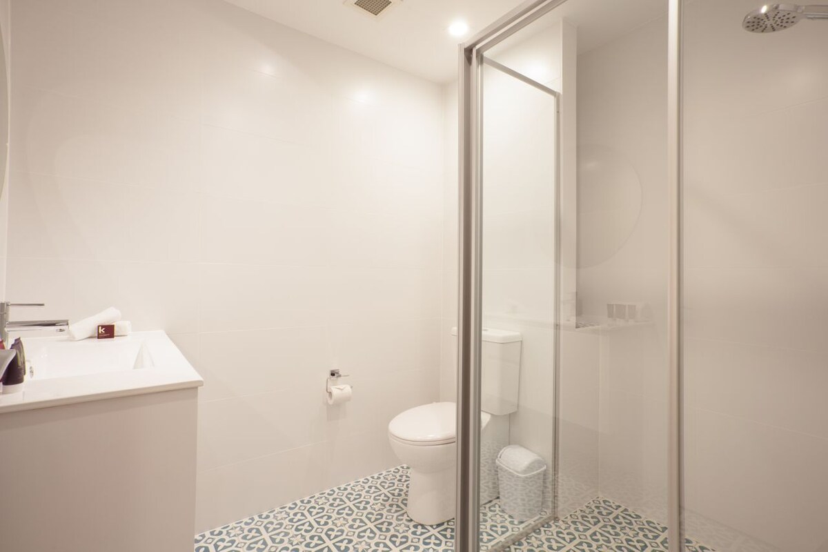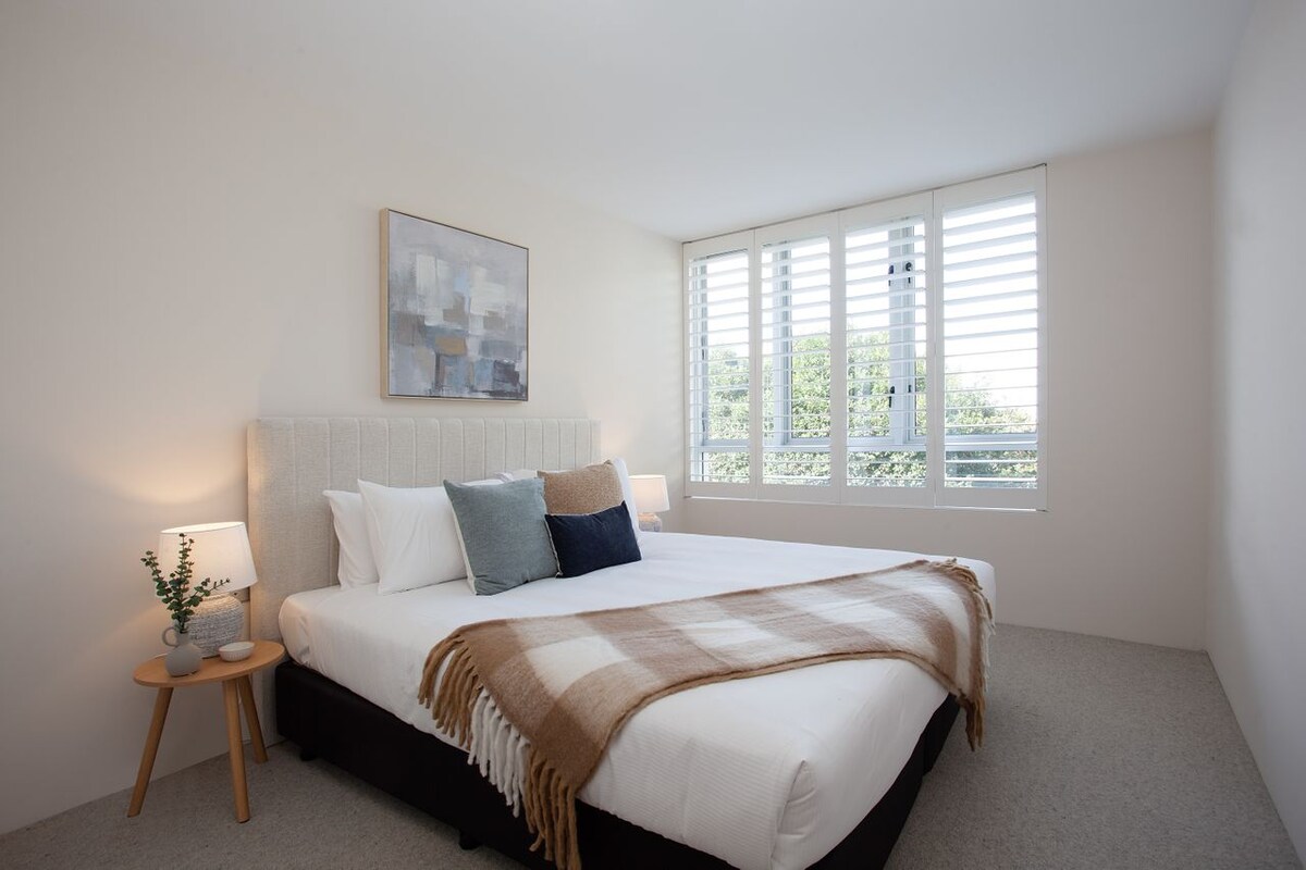 The spacious master bedroom offers a serene retreat at the end of a fulfilling day. Fitted shutters cast calming shadows over the king bed, which sits below serene contemporary art. The built-in wardrobes are a seamless and stylish way to store your belongings without interrupting the relaxed vibes. A large bathroom with a walk-in shower completes this apartment - the ideal escape in bustling Bondi.