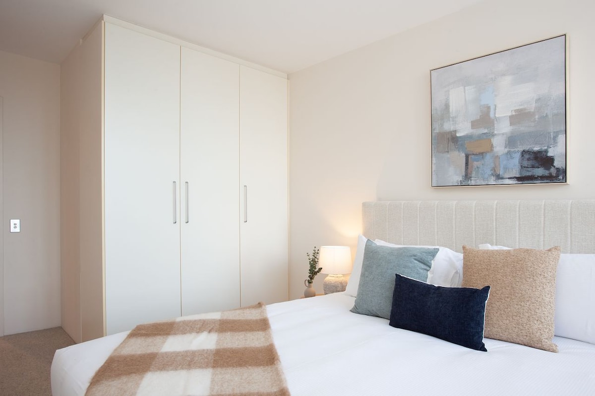 As you enter this apartment, you’ll arrive into the chic open-plan living and entertaining area. The pristine white-gloss kitchen welcomes you, hiding your amenities behind a splashback doubling as a divider. Boasting a gas hob, microwave and full-sized refrigerator, plus a hidden laundry cupboard, this apartment provides every modern convenience, perfectly arranged to enhance the natural flow of this interior. Past the kitchen, the room expands, encompassing a dining table for four. The relaxing living space follows. Soft sofas are arranged around the stylish coffee table, perfectly positioned for unwinding in front of the TV or admiring your view onto your private covered balcony beyond. On warm days, throw open the floor-to-ceiling doors and let the air blow across the balcony into your living space, or spill out for an evening drink, making use of the contemporary outdoor suite. If you’re staying for longer, and bringing work with you, a quiet desk space and a second sofa work well as an office, or just a cosy reading nook or escape for meditative contemplation. For larger groups, the sofa converts into an extra bed if needed.