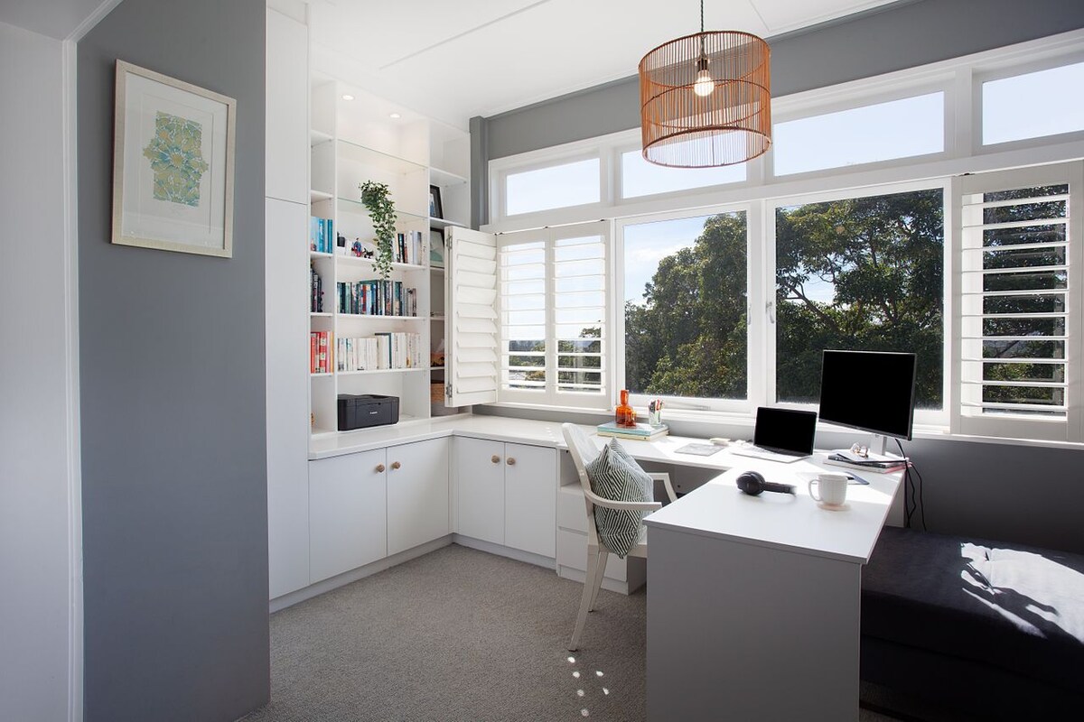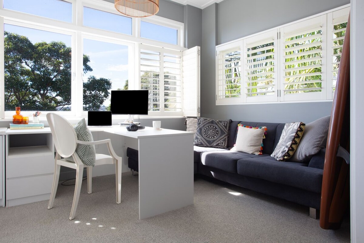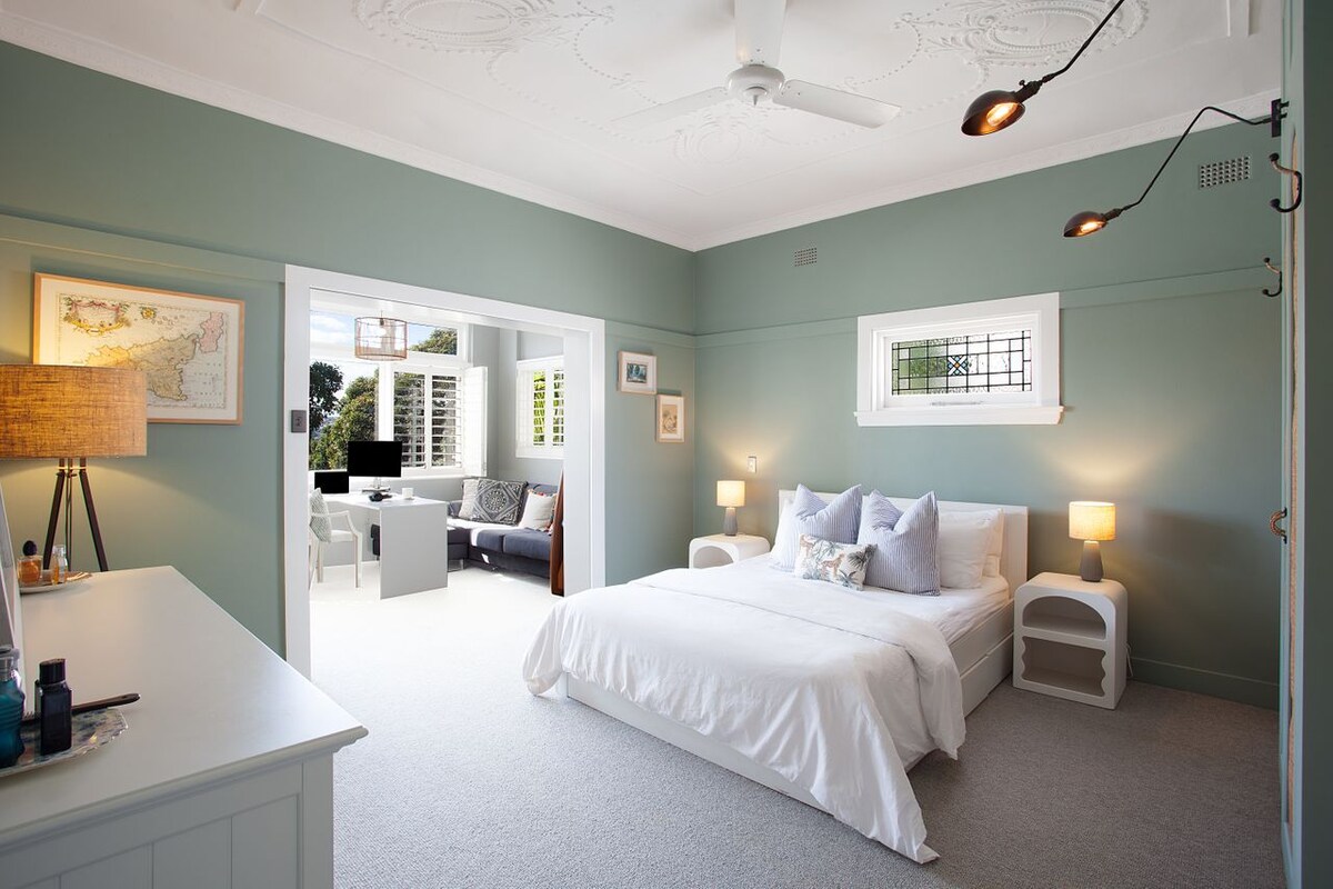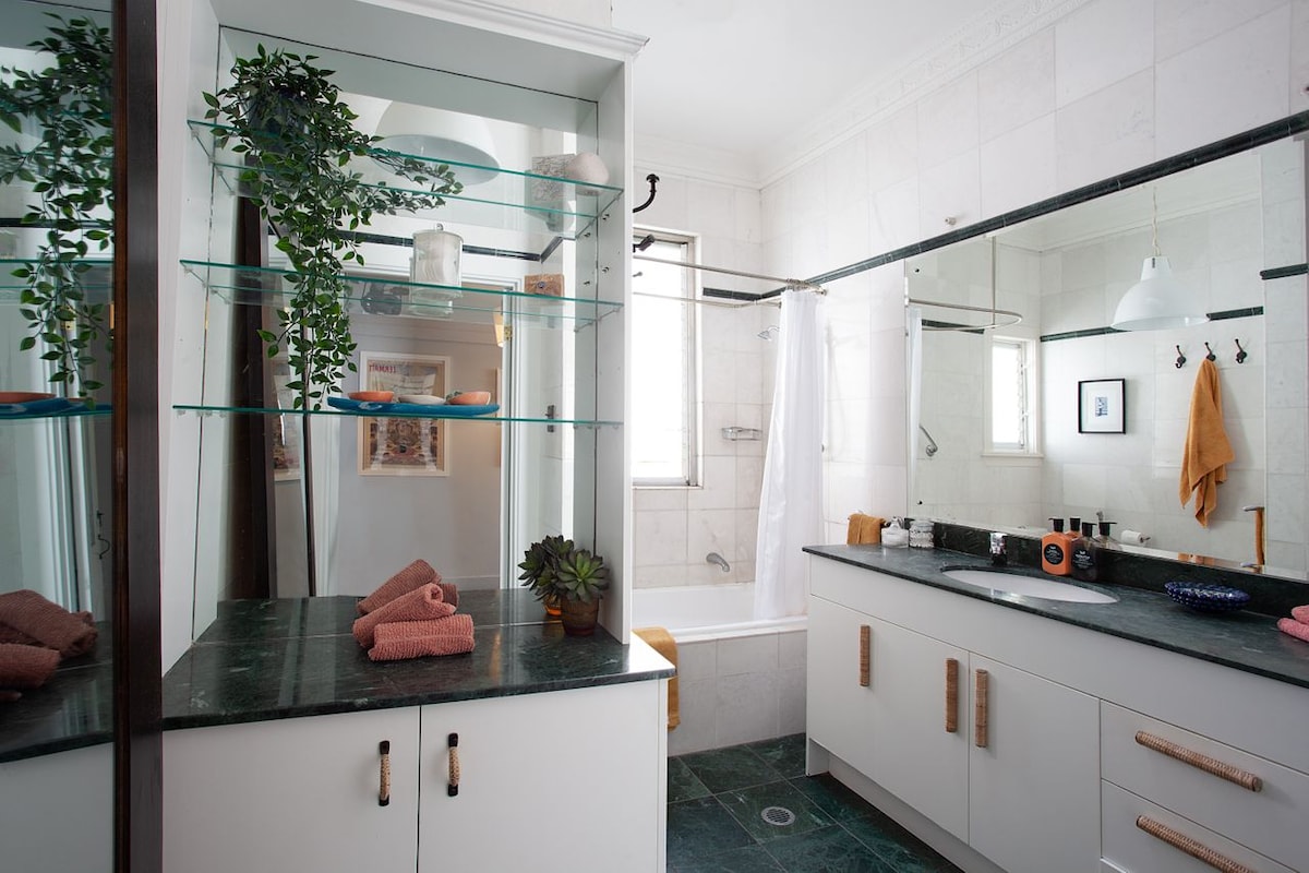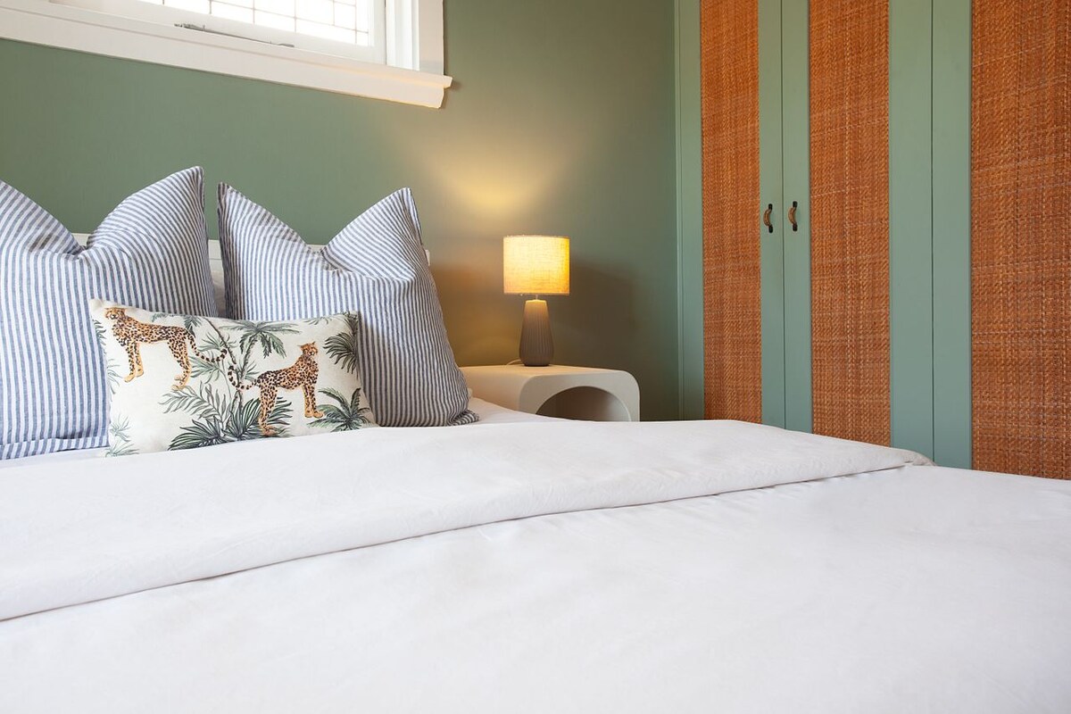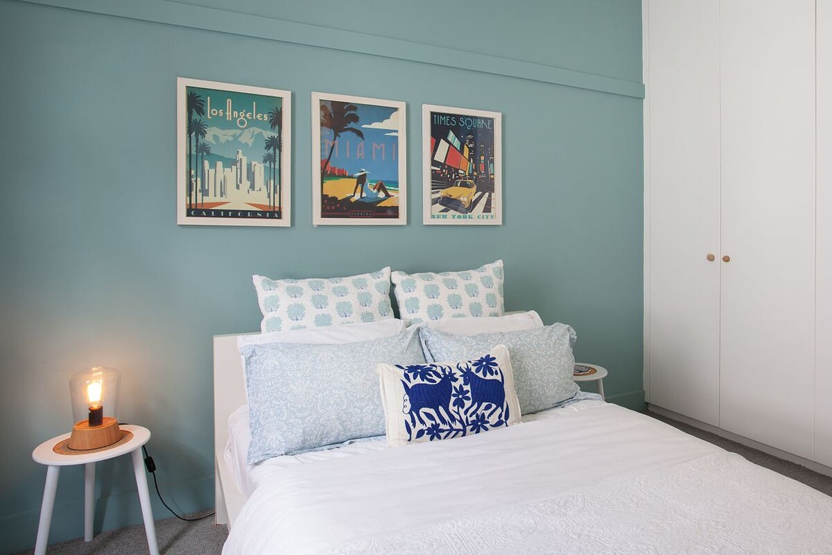 The master bedroom is a peaceful, sage green suite, where an alcove cocoons a stylish office and seating area, perfect for a work-away stay. A ceiling fan above the bed is primed to deliver a soft evening breeze as you sink into the sumptuous Queen bed. The second bedroom also boasts a Queen bed, surrounded by cheerful modern art prints and built-in robes providing ample storage. The bedrooms share a delightful family bathroom adorned with plants and complete with a full bathtub and shower over the bath, promising relaxation.