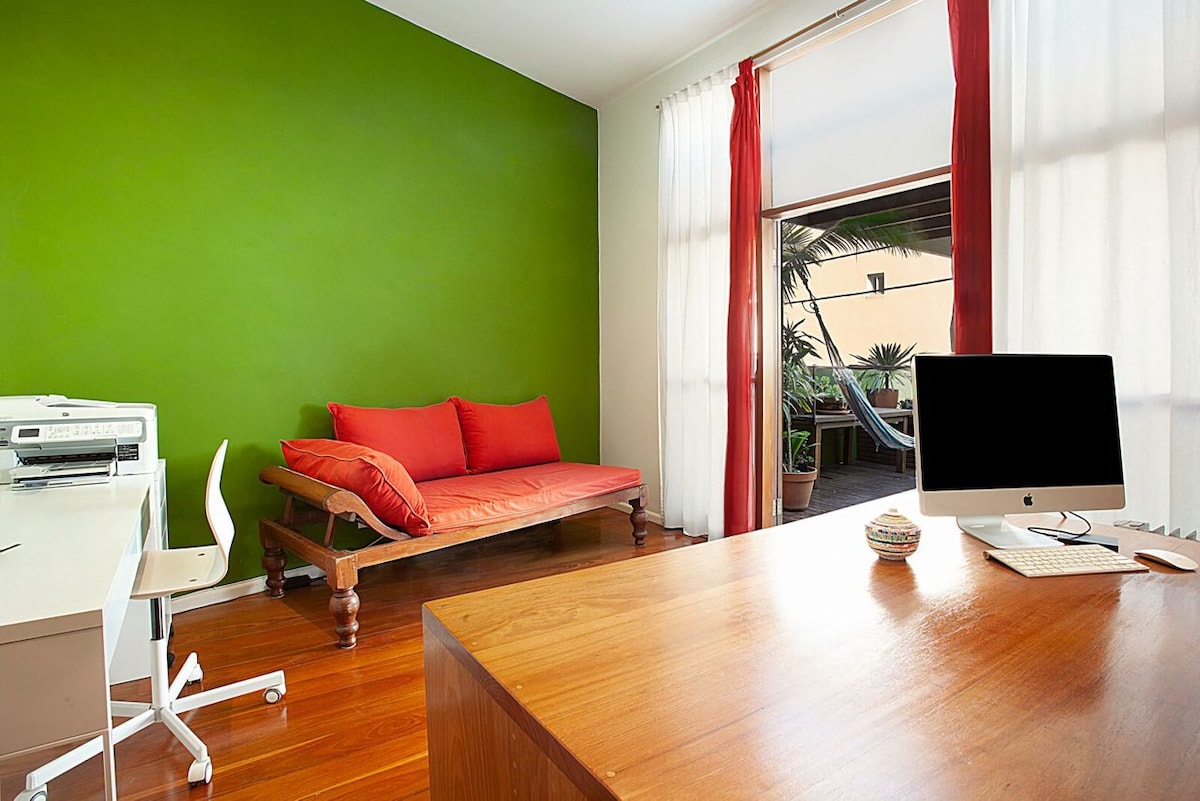 The first-floor bedroom features a queen-sized bed with ornate wood headboard and impressive bookshelf. There is a separate sofa bed on this level in the study/third bedroom, and an eye-catching bathroom that features a claw foot bathtub with overhead shower.