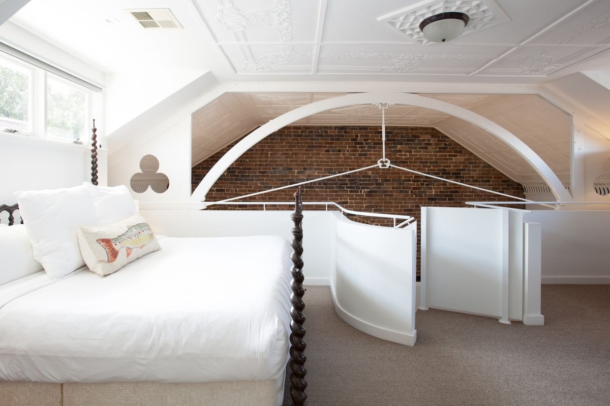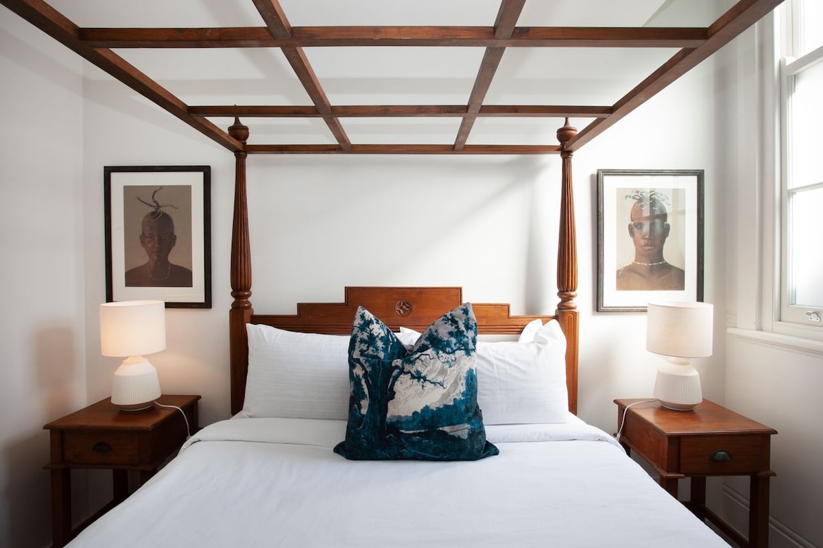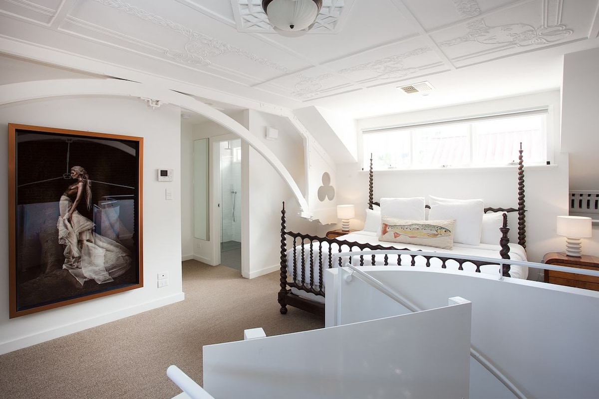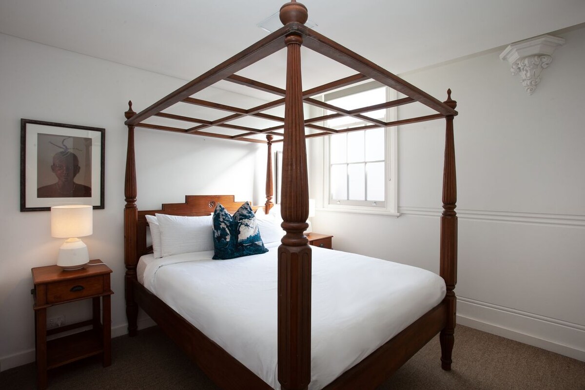 Ascending the striking spiral staircase will take you to the mezzanine level, home to the master bedroom. A truly unforgettable room, traditional corniced ceilings beam down on a sumptuous ebony bed frame, previously owned by actor Errol Flynn, adding a touch of stardust to your escape. The master boasts the added benefit of access to an ensuite bathroom, and a study - ideal for longer stays. Two further bedrooms can be found on the ground floor; the choice between a fantastic hardwood, Queen-sized four poster or a French Sleigh double is best left settled by your esteemed guests!