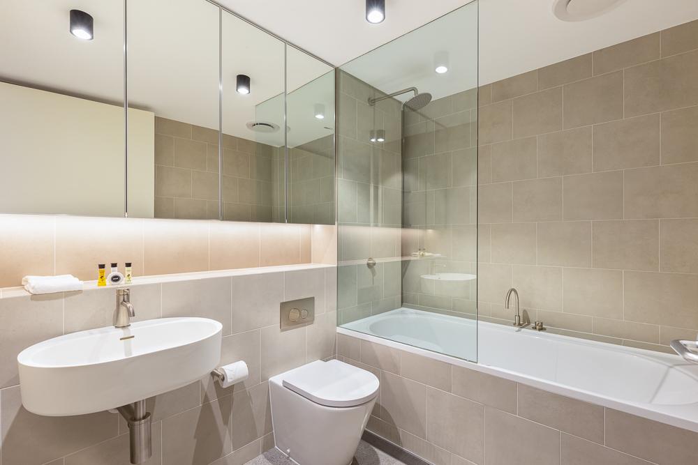The elegantly tiled second bathroom contains a shower overhead of the bathtub to peacefully laze and soak in (perhaps to ease tired muscles after a day shopping up a storm in the nearby boutiques).