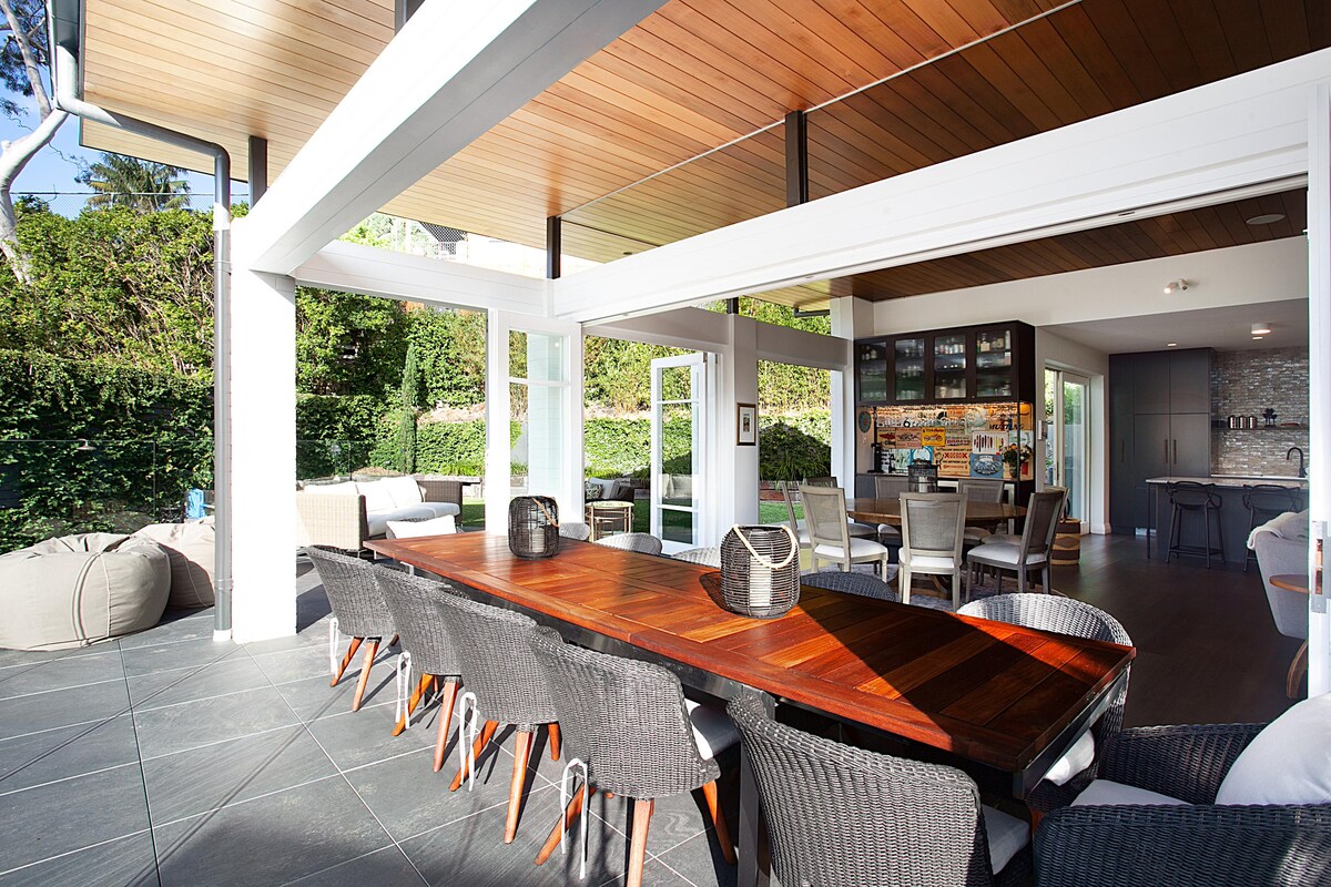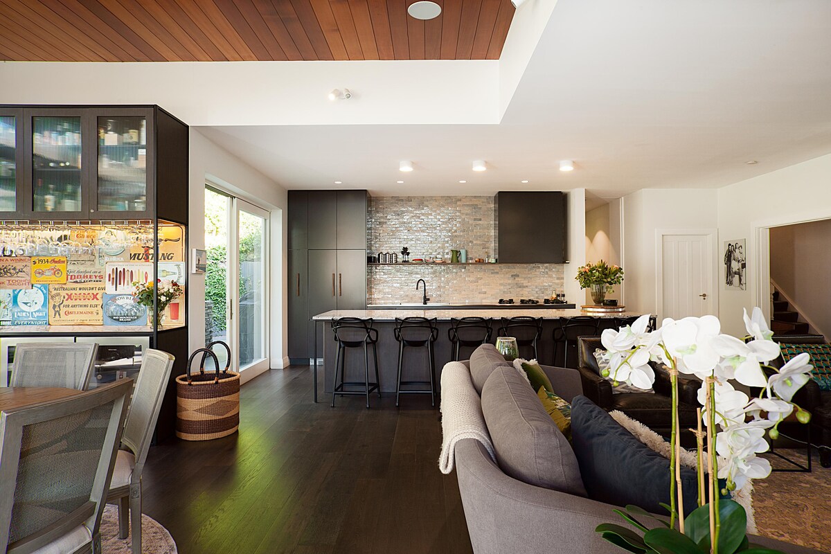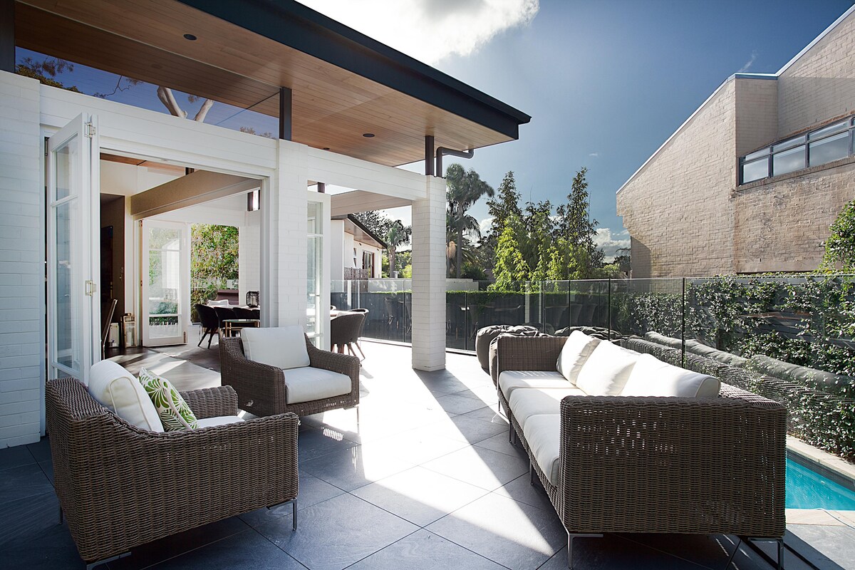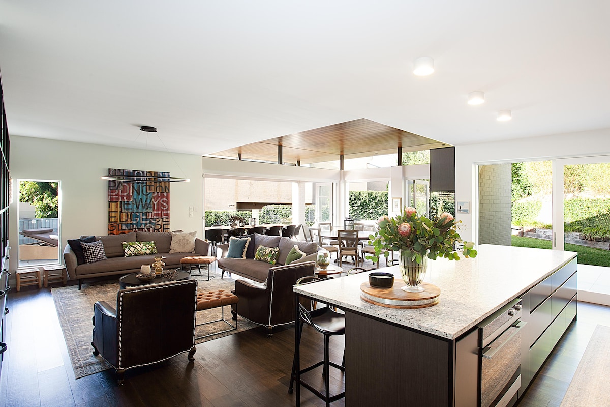 A superb example of broken plan living creates distinct entertaining spaces, each with its luxurious charm, whilst keeping you connected to the rest of the space. Think grand marble-topped breakfast bar overlooking a chic sofa arrangement next to statement modern art and lighting; follow the room around and you'll find a formal indoor dining table and a luxe cocktail bar. Full-sized sliding doors surround the space, extending your relaxation into the sublime fenced garden, and inviting you to make use of the barbeque, alfresco table and of course your private pool. Offering peace and privacy alongside unbeatable space and delights this is the perfect place for a family to relax and unwind. Encourage your teens to command the barbeque whilst you mix cocktails and mocktails at the bar before a casual poolside evening.