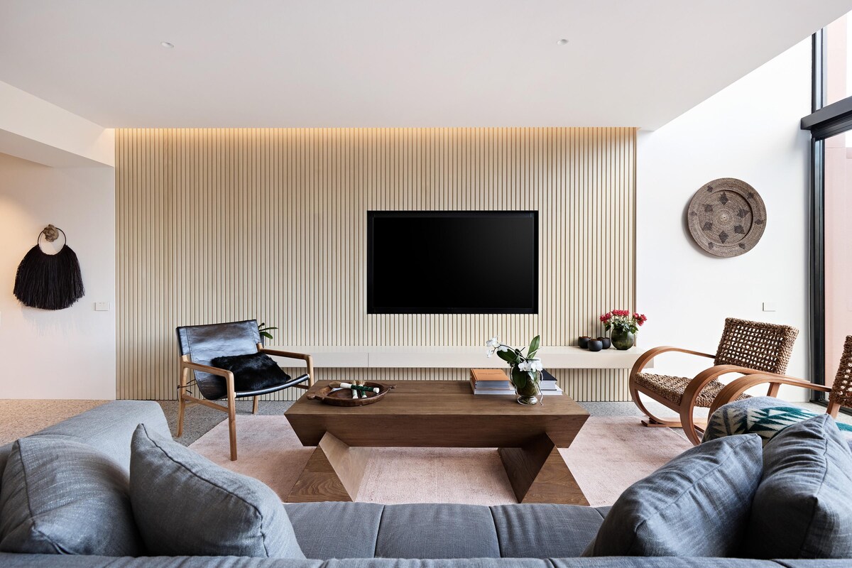 The second floor is dedicated to two bedrooms with glass louvre windows, both have built in robes and a full-size bathroom including internal laundry. Boasting two king sized bed (one bed can be split into two singles if required), ensuring this home is versatile enough to suit a family or a group of friends. The apartment also gives you access to a shared pool and gym with sauna, a rare and luxurious addition.