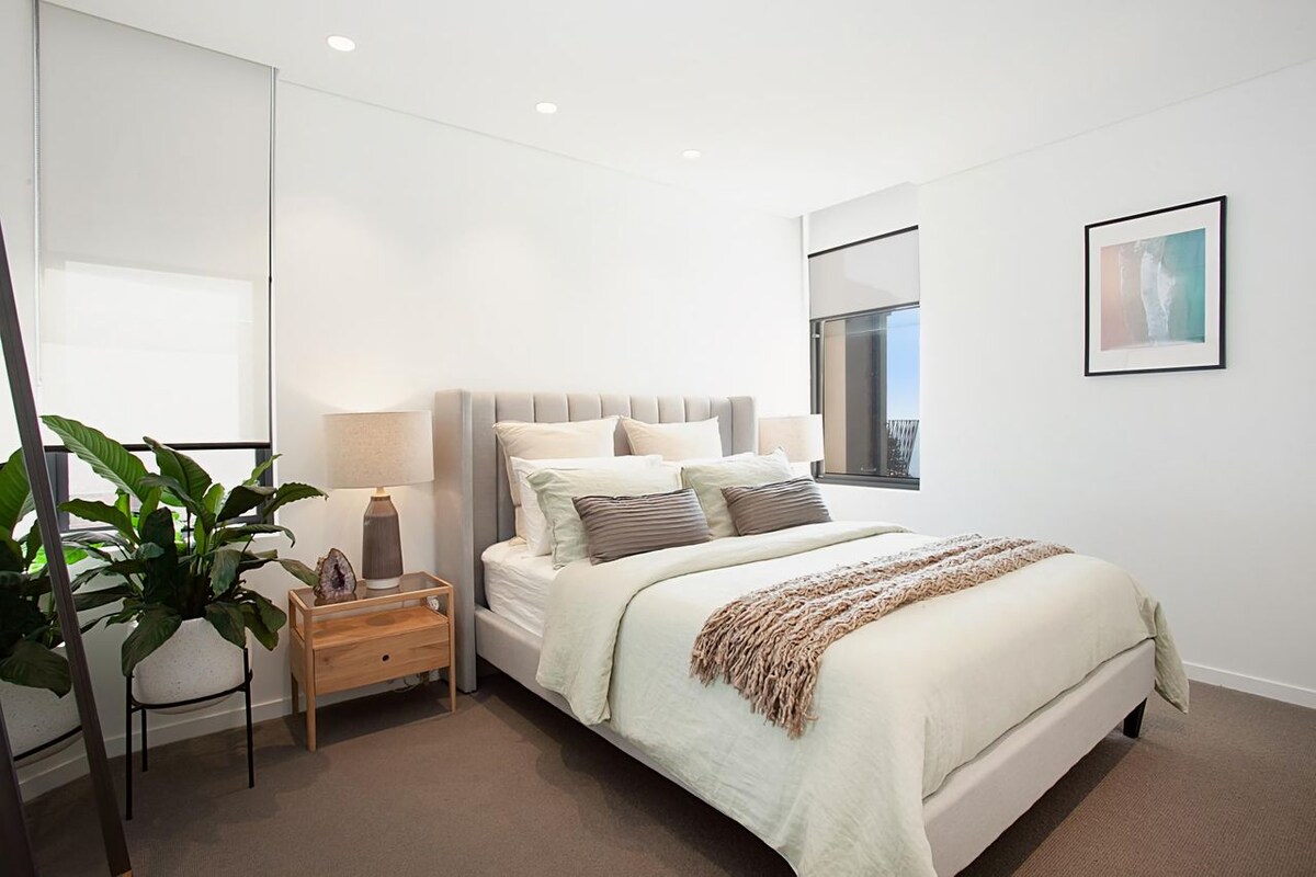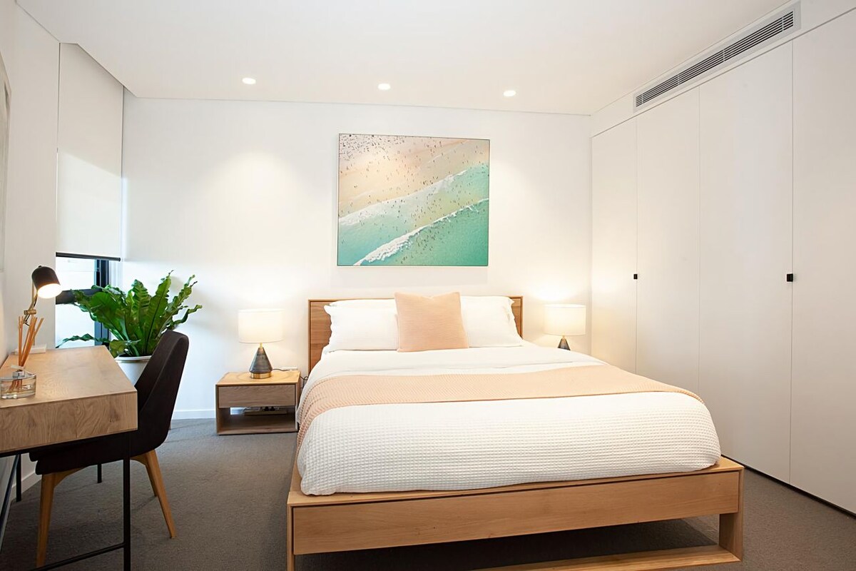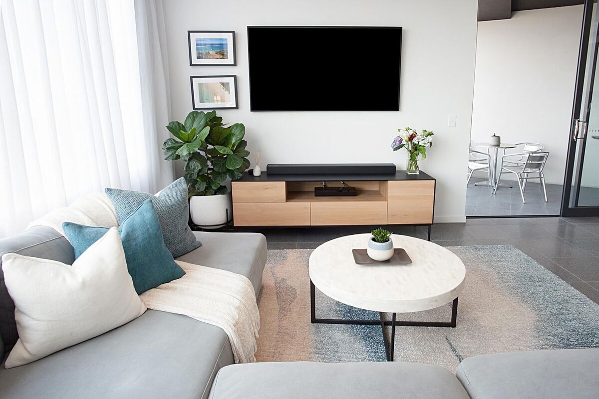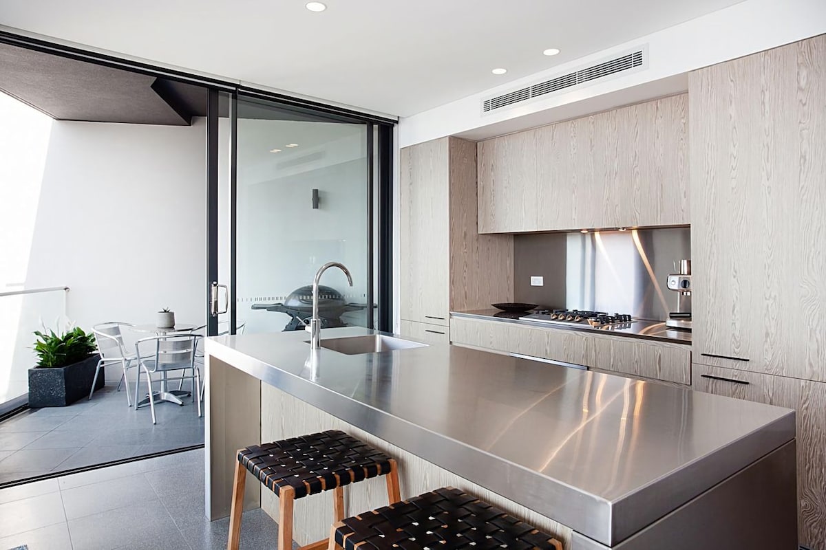 The apartment features a King bedroom and a Queen bedroom while shared spaces include an open-plan living area with smart television and as well as a smartly designed kitchen with top-end appliances and dining area that opens out onto the impressive balcony area.